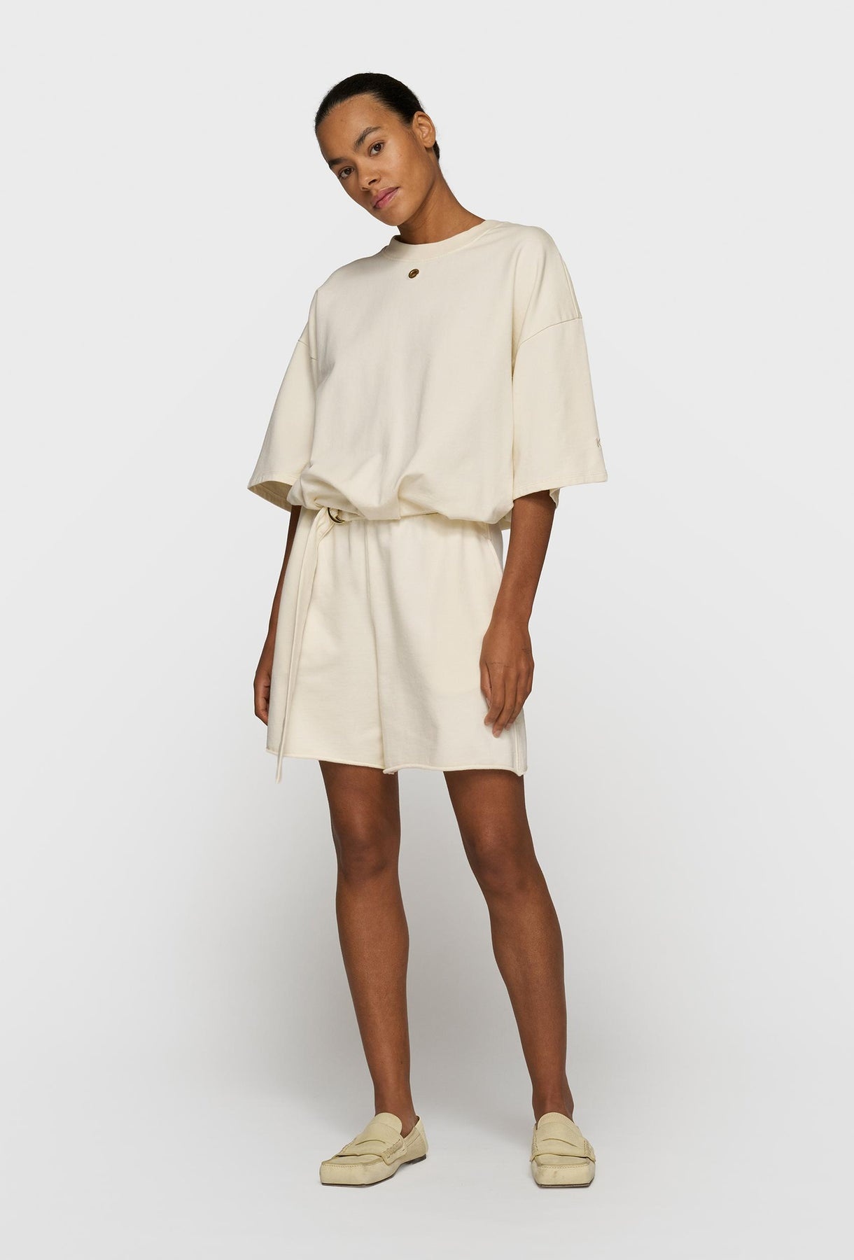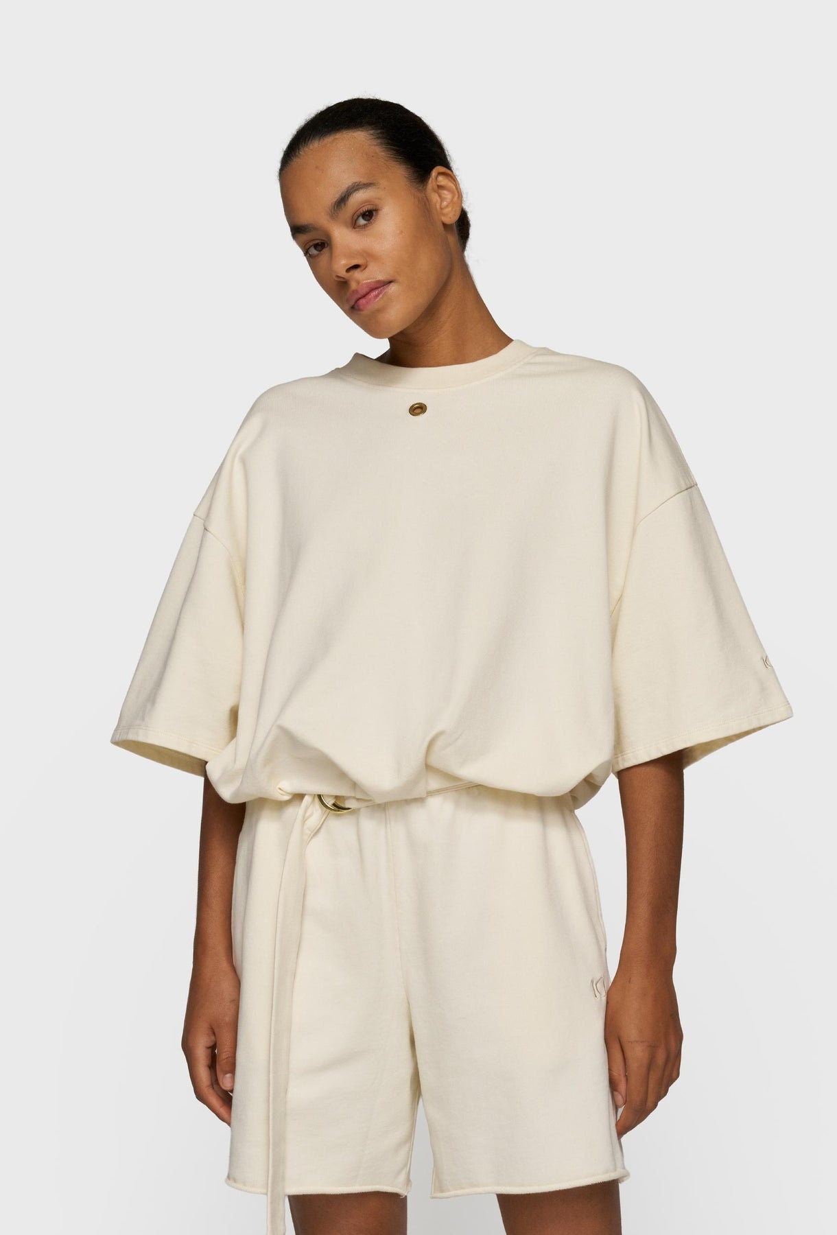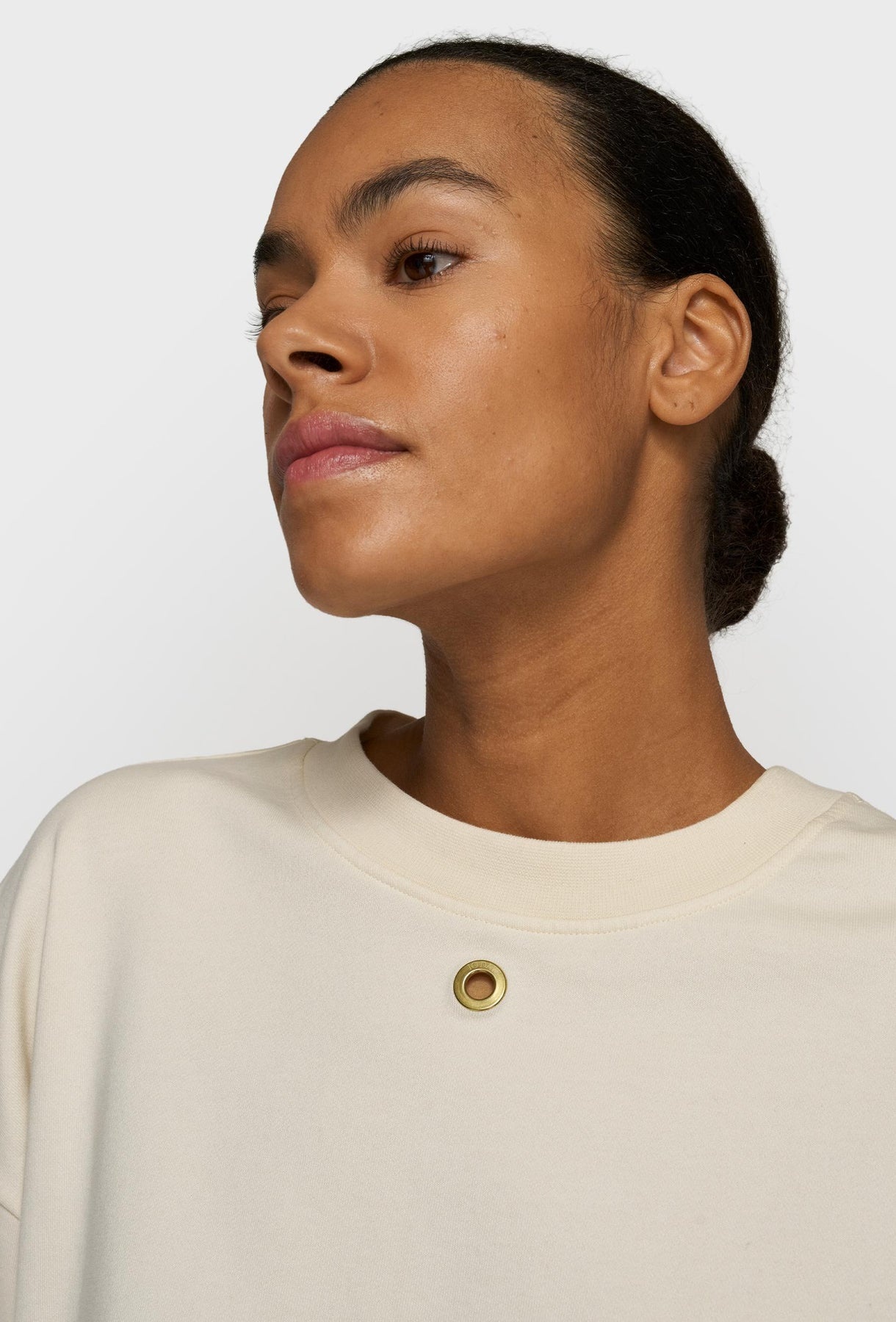 Oversized sweater met wijde halflange mouwen, gemaakt van een superzachte jersey stof. De trui heeft verlaagde schouders, een ronde hals met daaronder een goudkleurige eyelet en een elastische band aan de onderkant voor een licht opgeblazen effect.
