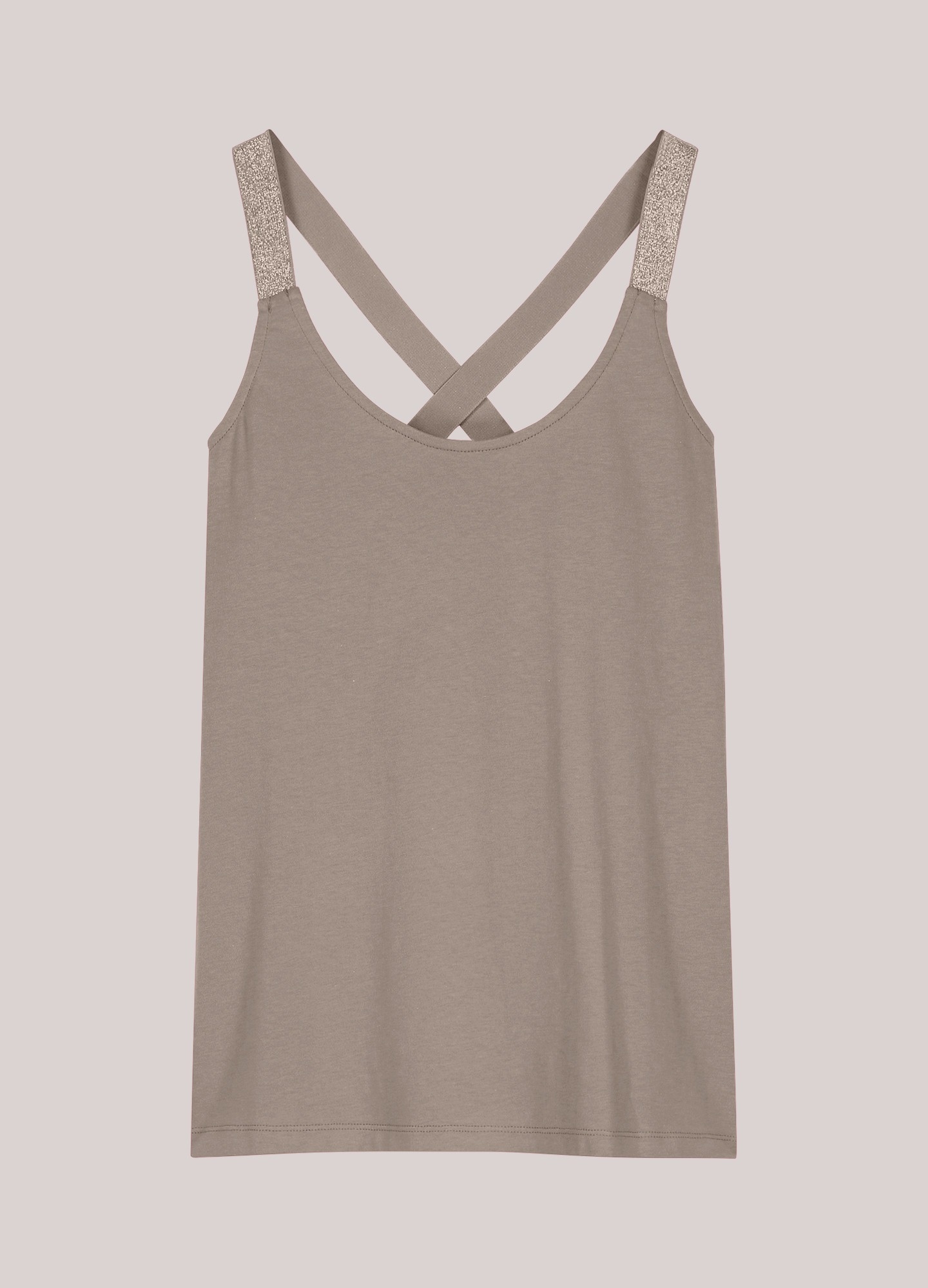 Slim fit singlettop met een ronde hals van biologisch katoen met op de rug kruisende schouderbanden in een fijne stretchkwaliteit met glittergaren.