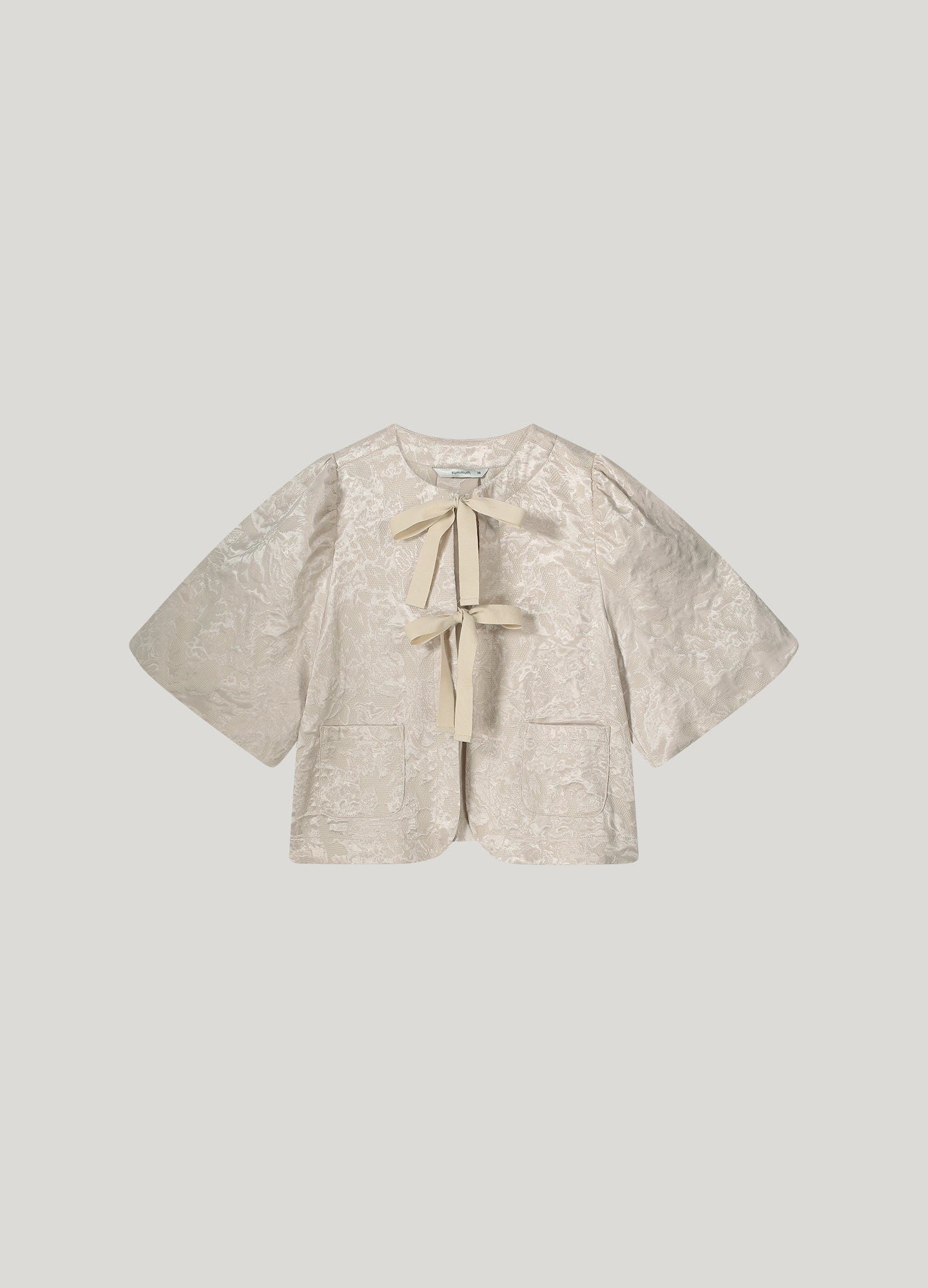 Overhemdjasje gemaakt van een geweven jacquard stof. Het heeft korte, gevoerde ballonmouwen, een dubbele striksluiting aan de voorkant, een stolpplooi aan de achterkant en twee opgestikte zakken.