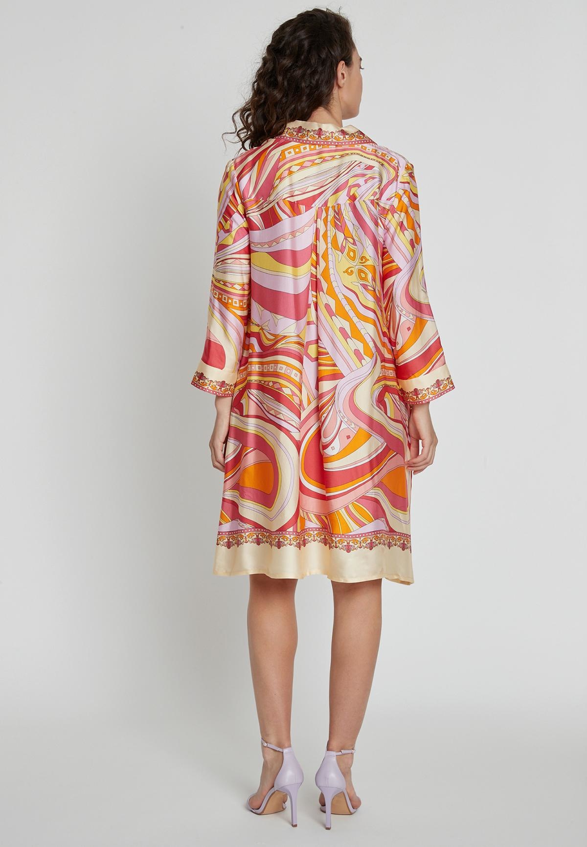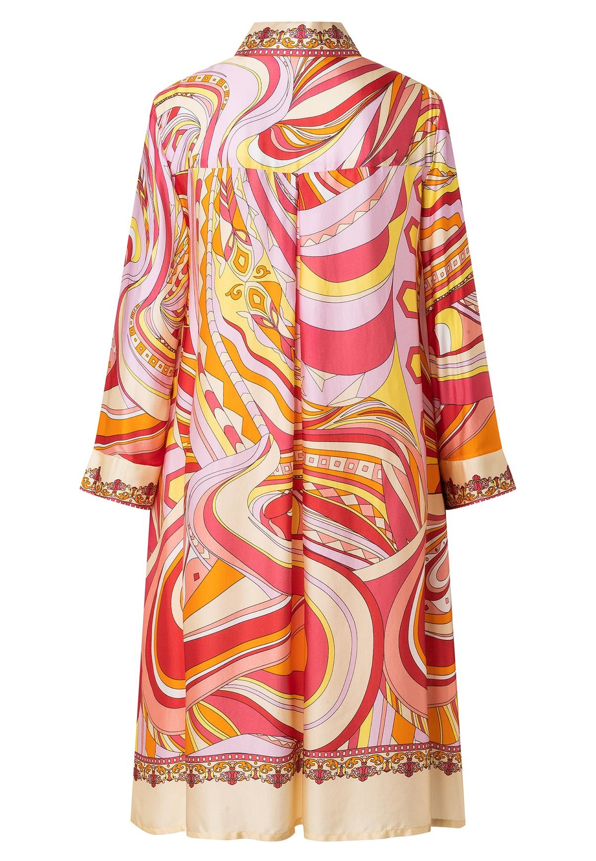 Klassieke gevoerde overhemdjurk op knielengte in een retro print. De wijdvallende jurk heeft zakken, driekwart mouwen en een kraag.