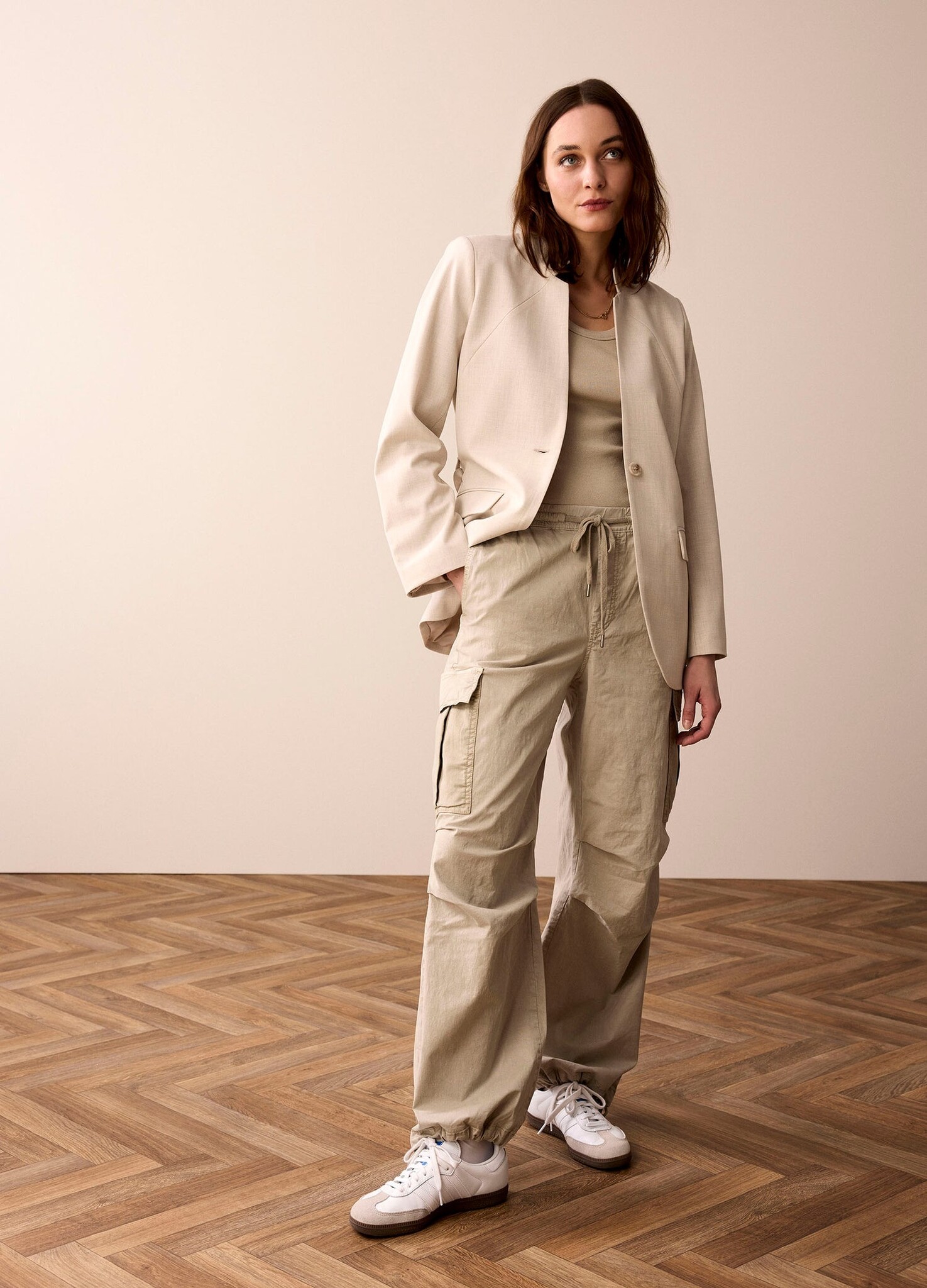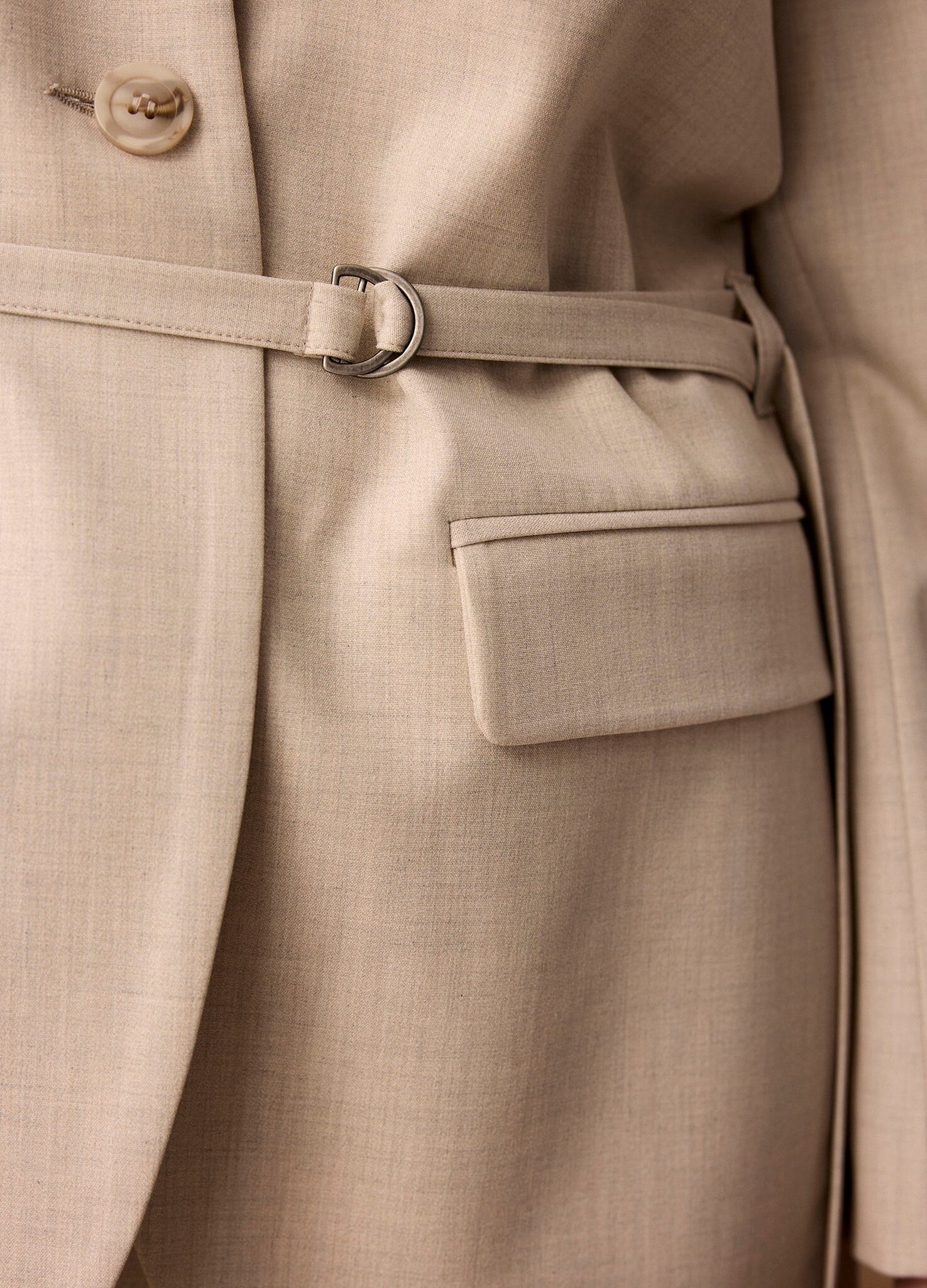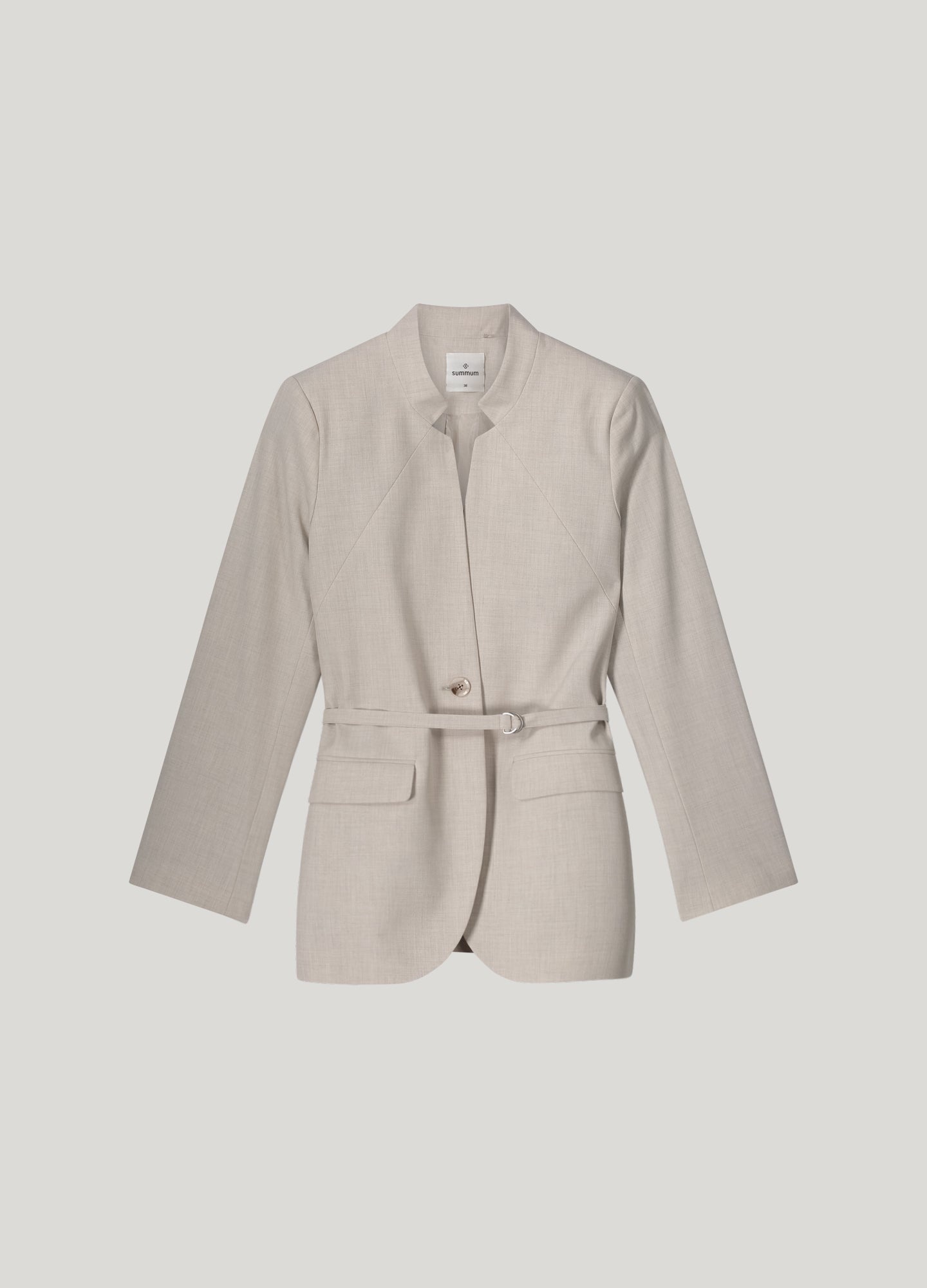 Boyfriend blazer gemaakt van een gemeleerde stof met stretch. De blazer heeft een opstaand kraagje, een stoffen ceintuur en paspelzakken met een klep.