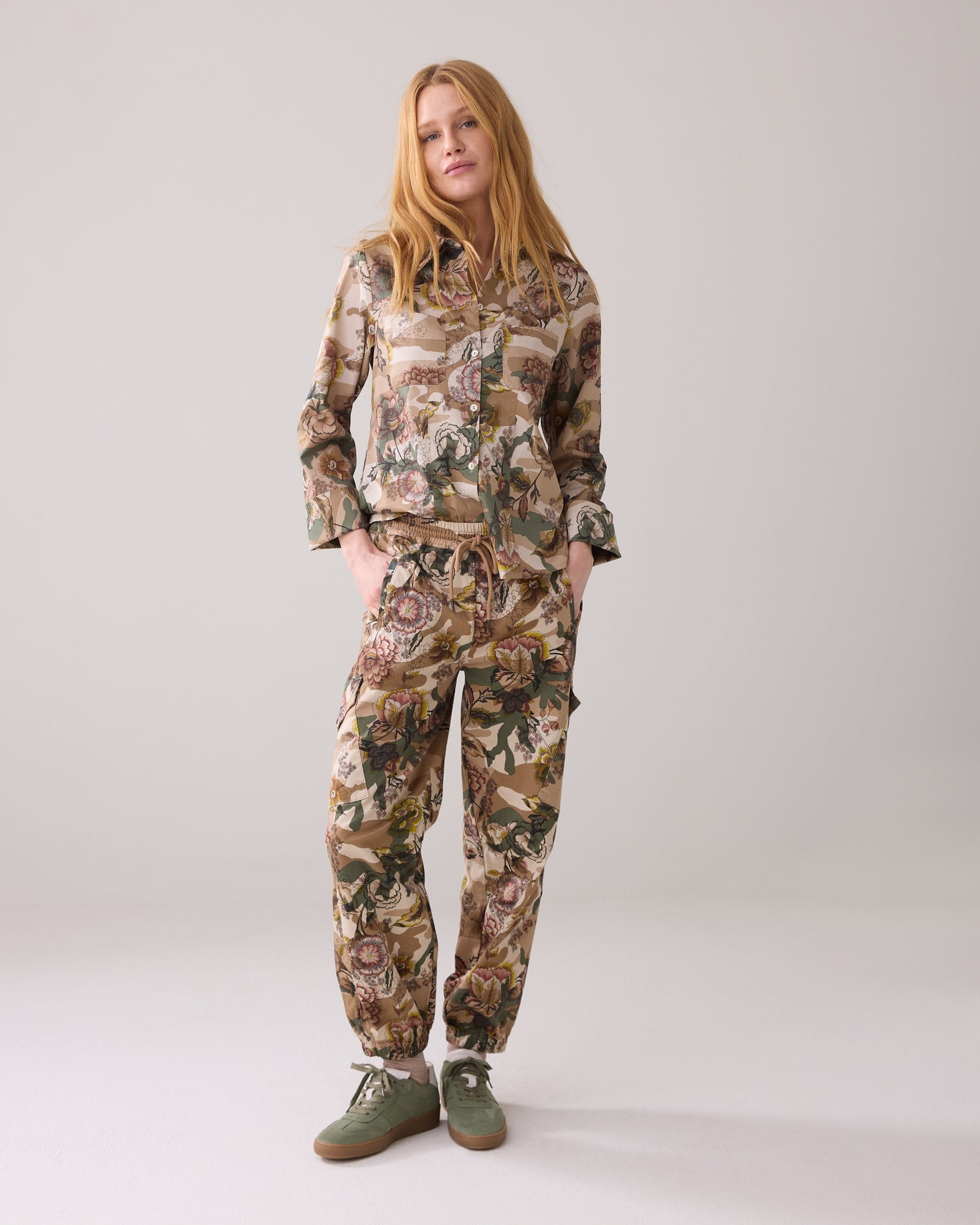 Camouflage broek op enkellengte, gemaakt van stevige stretch-katoen. De broek heeft een elastische tailleband met een veterkoord, klepzakken aan de zij- en achterkant en een elastische zoom aan de onderkant.