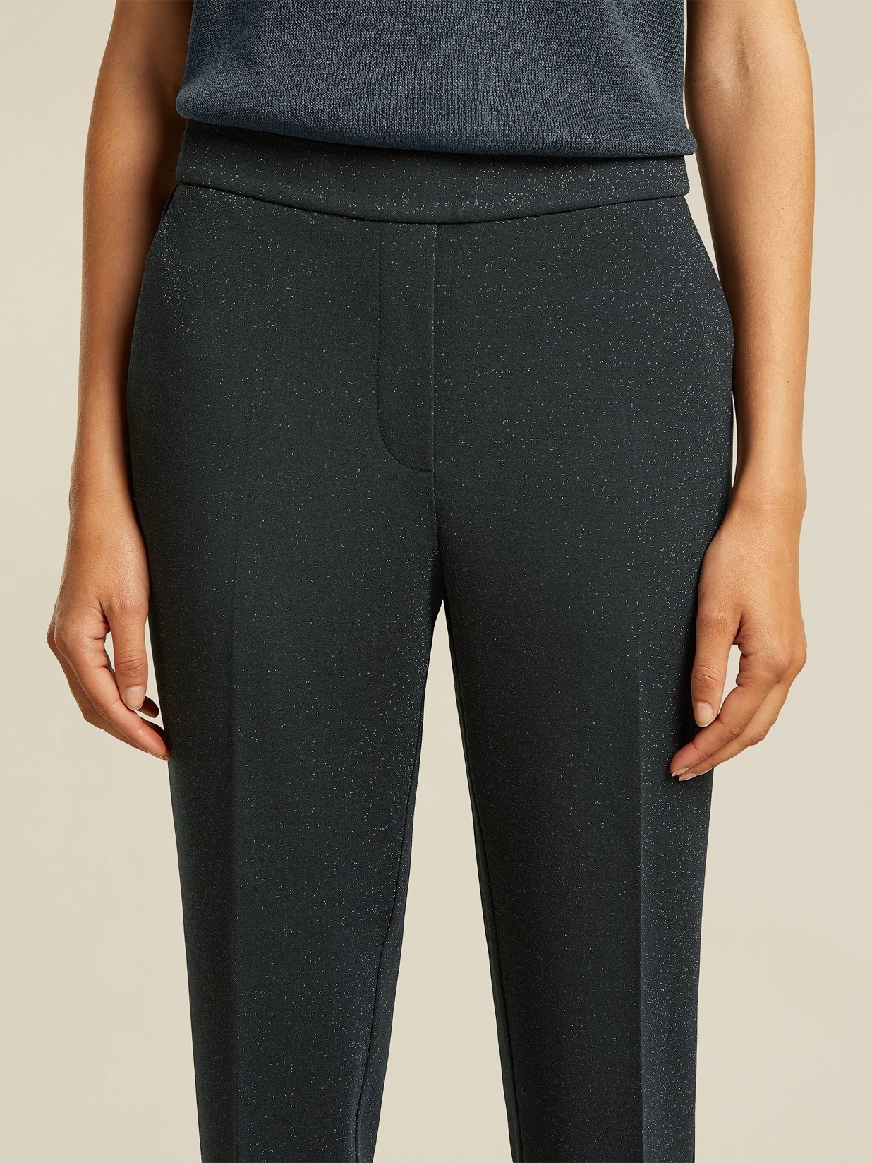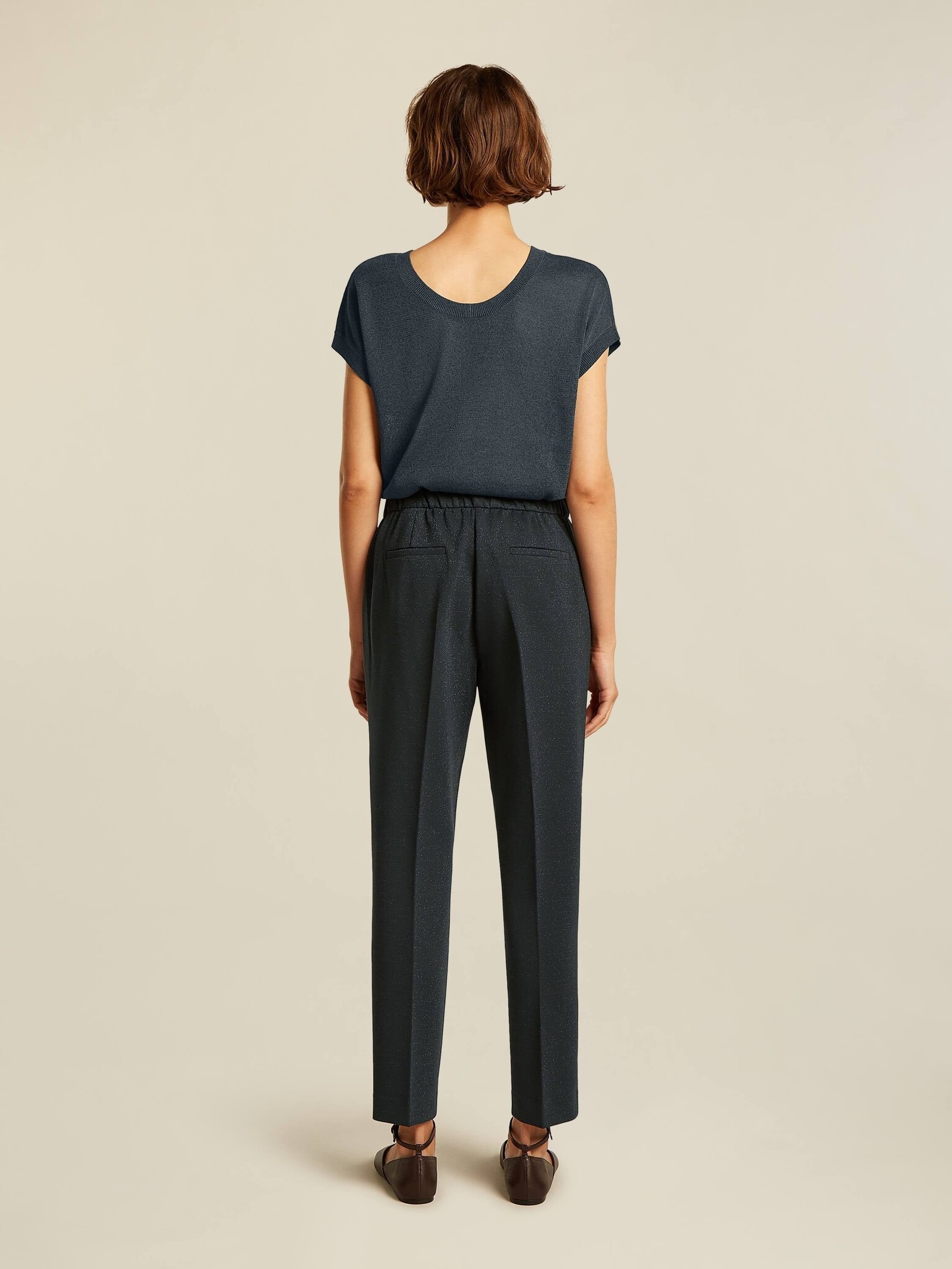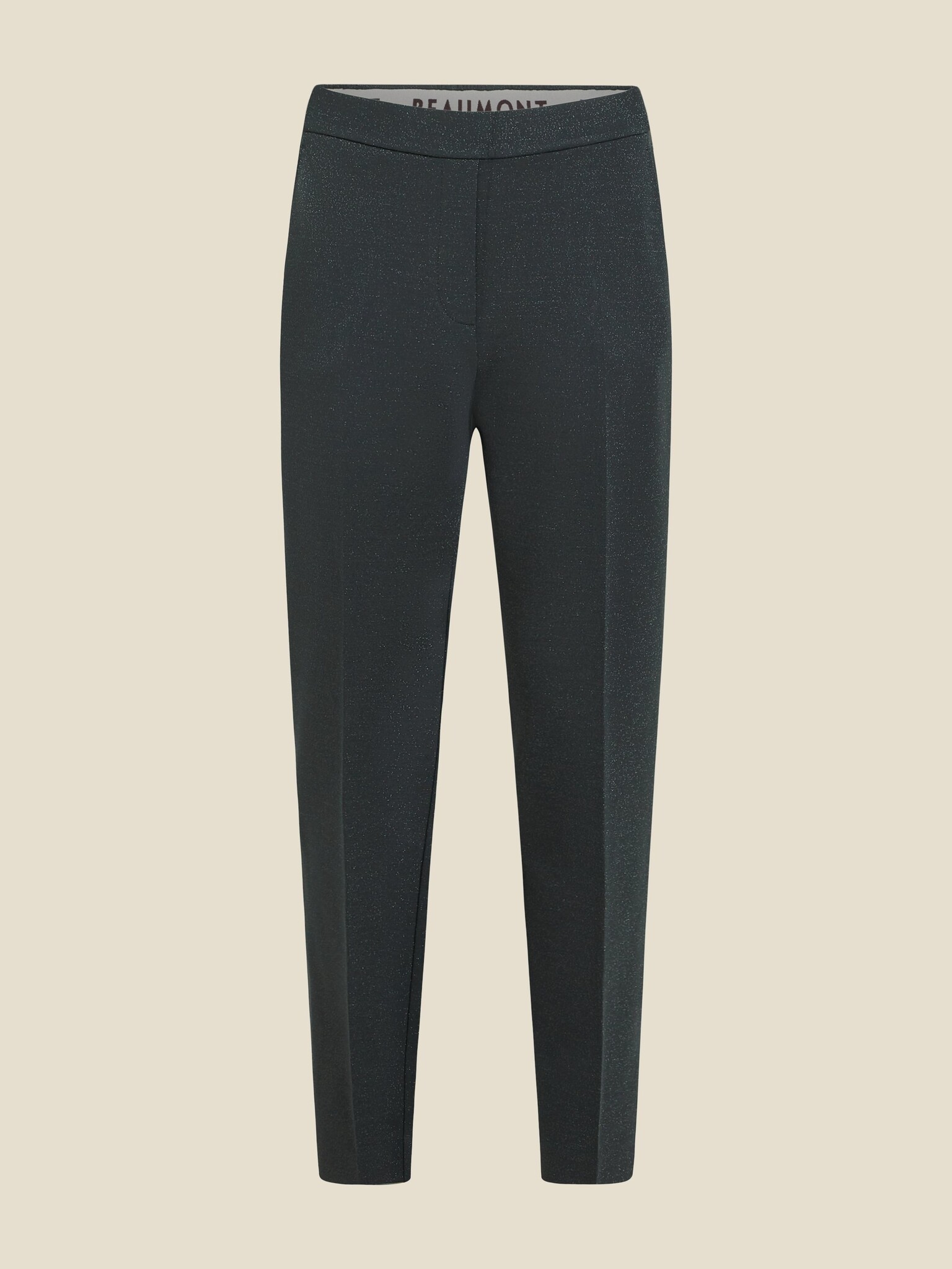• Regular fit chino pantalon van comfortabele jersey stof met glinsterende lurex. De broek heeft geperste vouwen, ingezette steekzakken voor, nepzakken met achter en elastiek in de tailleband aan de achterkant.