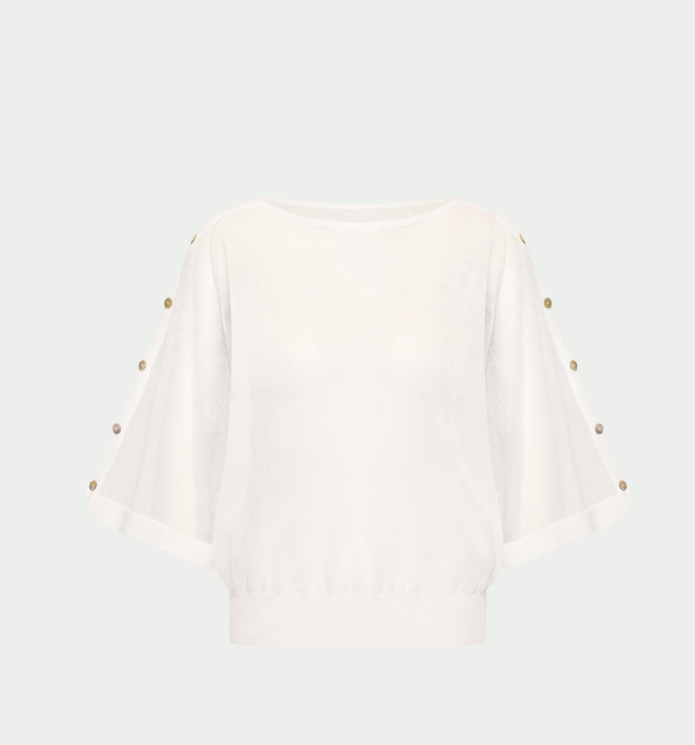 Dunne zomerse trui met een glitter in de stof. De trui heeft een wijde bovenkant, een smalle onderkant en sierknoopjes op de zijkant van de mouwen.
