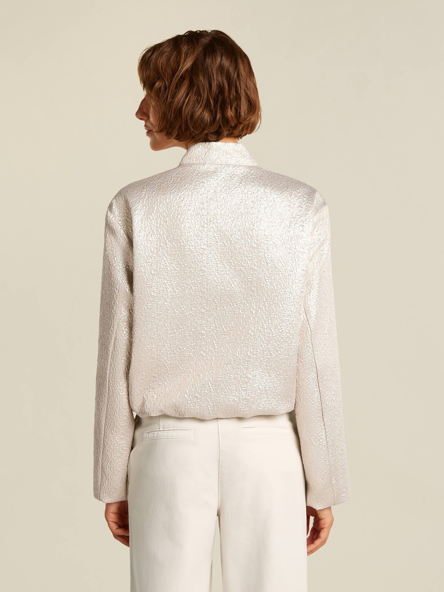 • Gevoerd bomberjack in een metallic kwaliteit. Het jack heeft een elastische zoom en manchetten, paspelzakken en een ritssluiting.