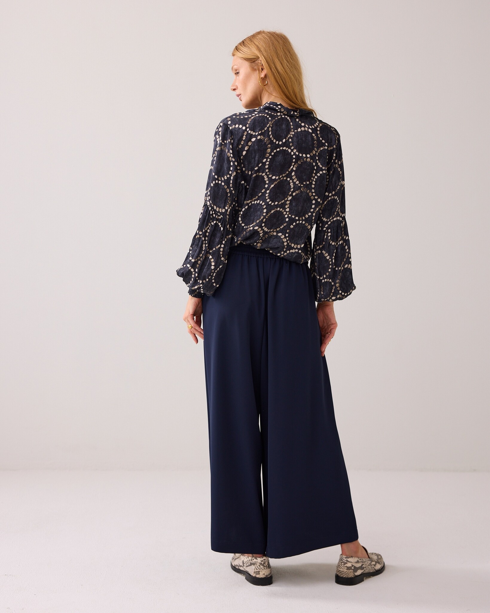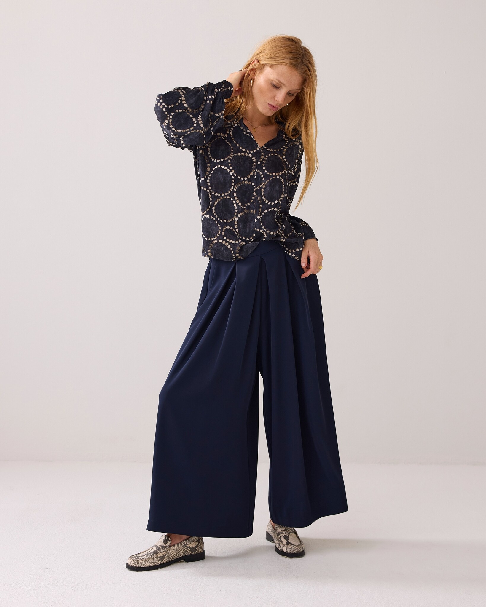 Soepel vallende culotte met brede stolpplooien en extreem wijde pijpen. De tot net boven de enkel vallende broek heeft een middelhoge taille met een elastische tailleband aan de achterkant, steekzakken.