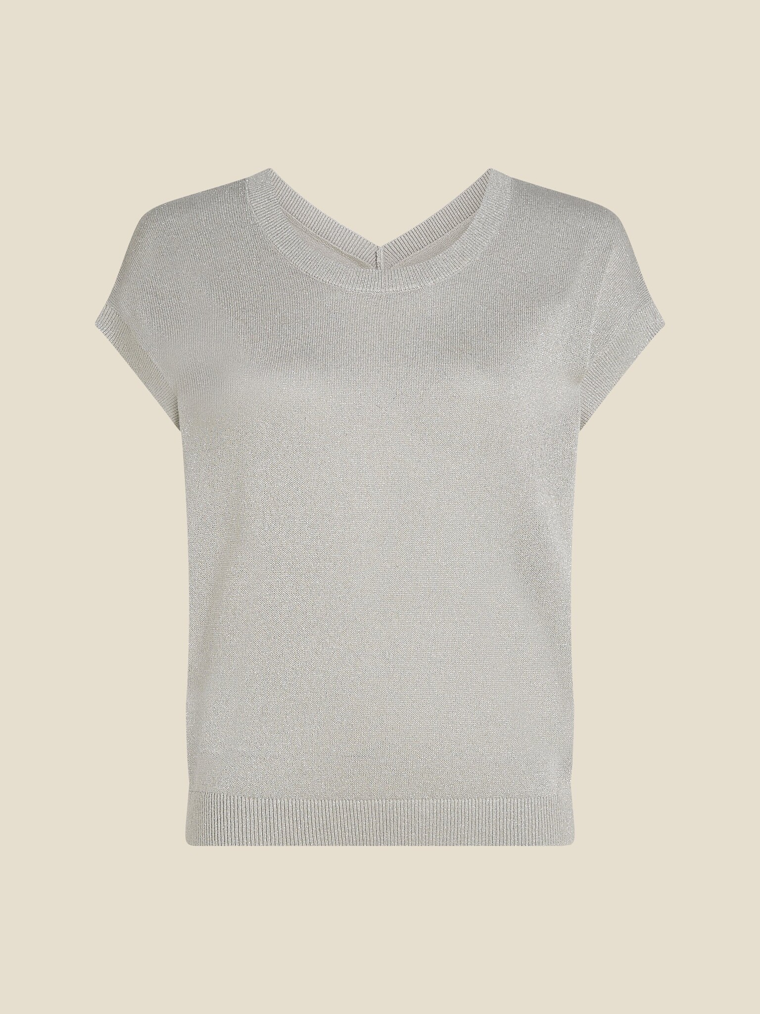 Mouwloze gebreide trui gemaakt van een viscosemix met glinsterend lurex. De trui heeft verlaagde schouders, een ronde hals aan de voorkant en een V-hals aan de achterkant.