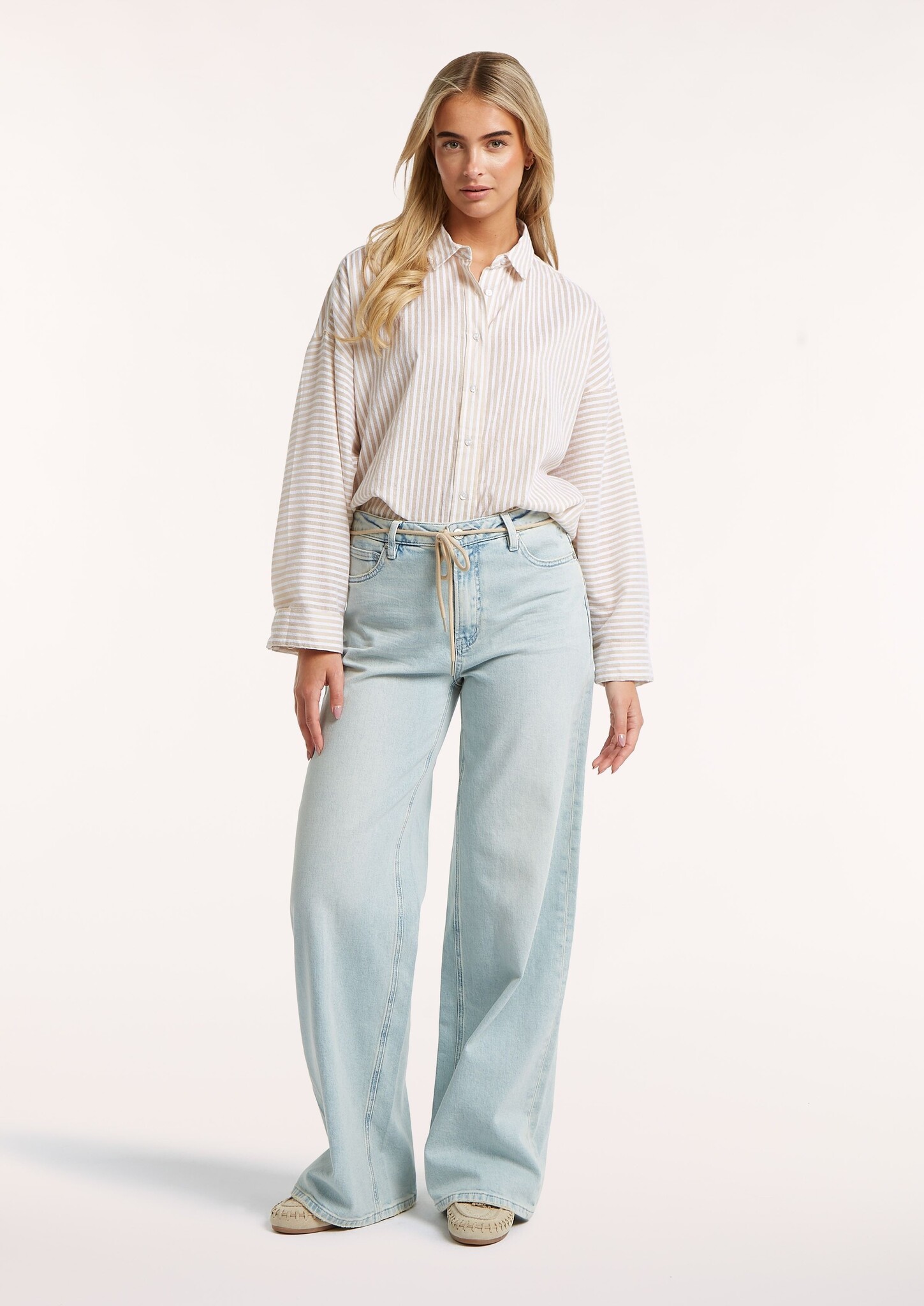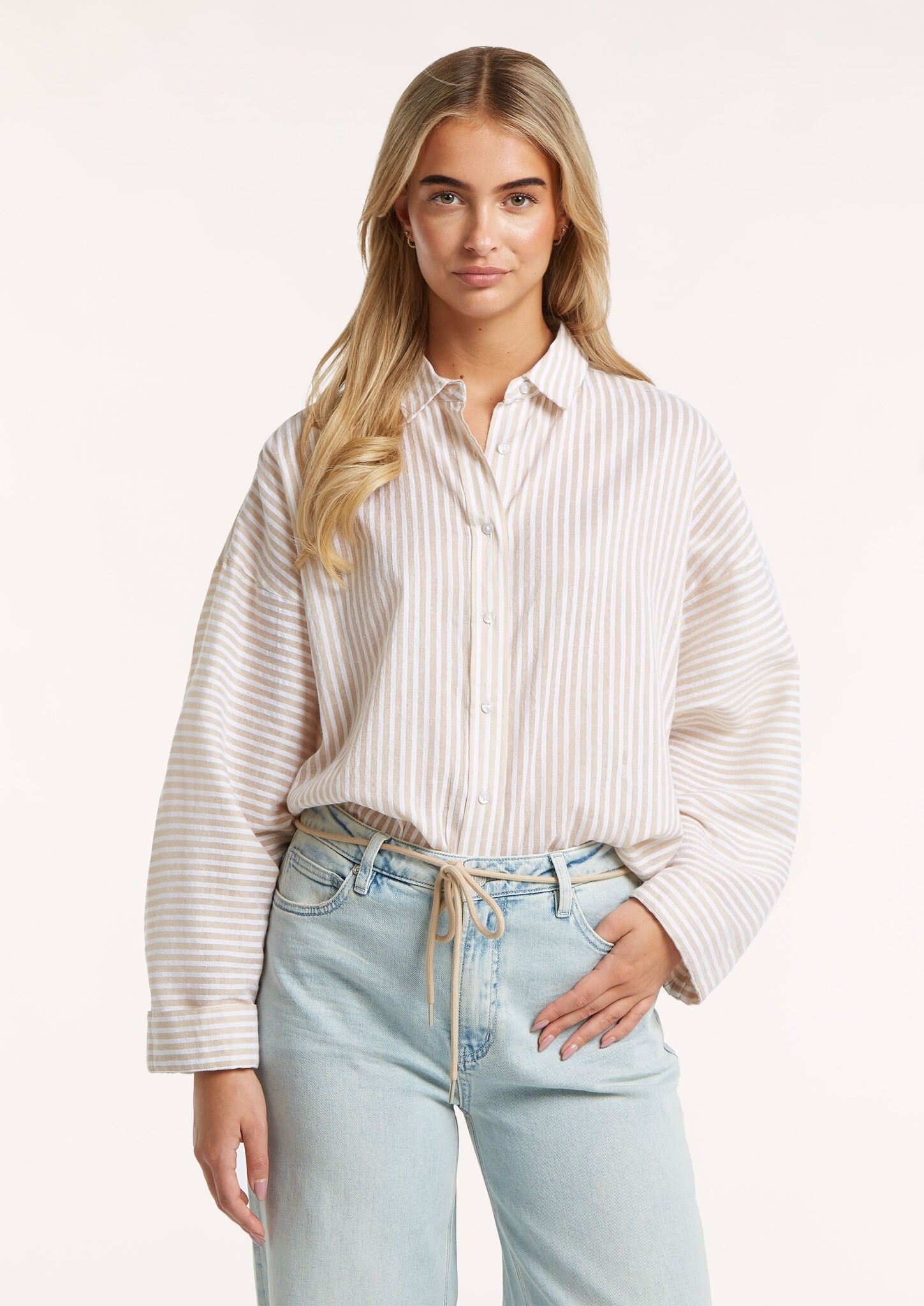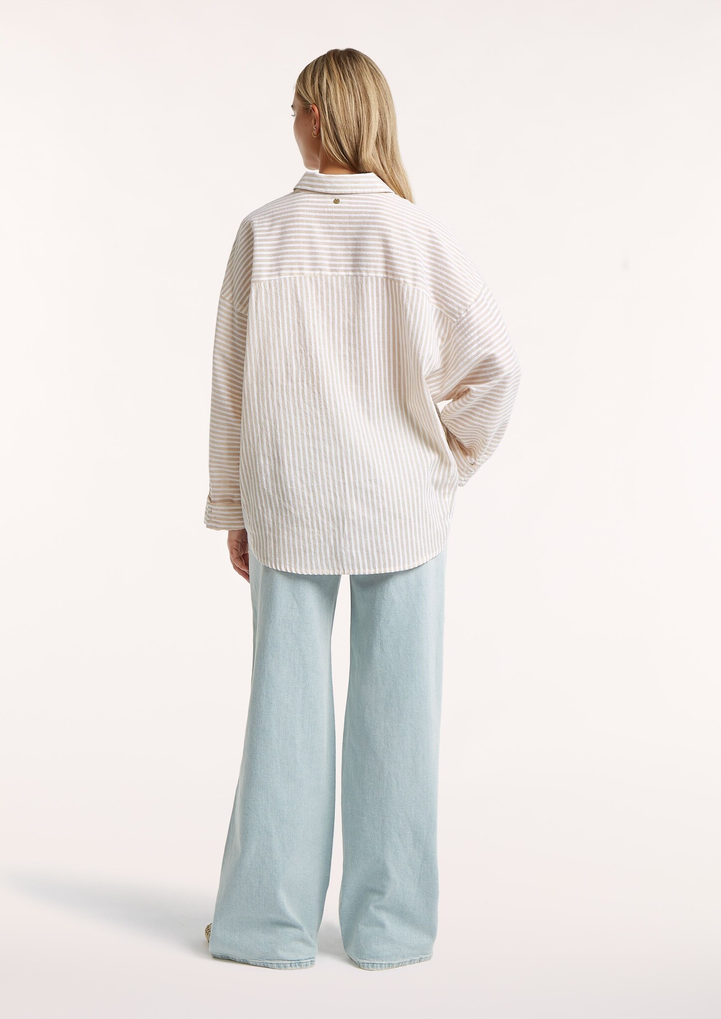Oversized gestreepte blouse met een knoopsluiting, verlaagde schouders en een langere achterkant.