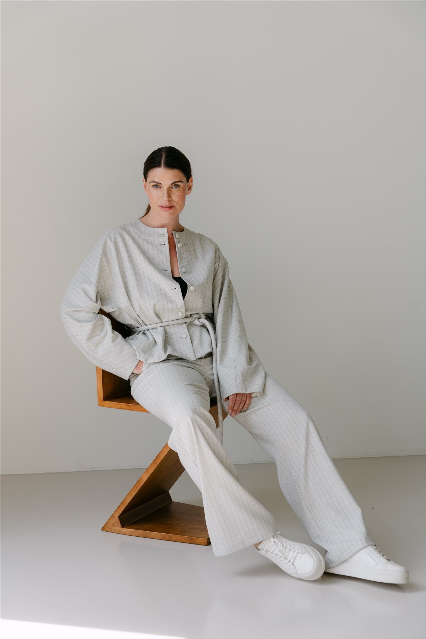• Verfijnd jack met een subtiele donkergrijze streep. Het jack heeft een ronde hals, een knoopsluiting en een afneembare wikkelband om de taille. Combineer het met de bijpassende MoosS6 pantalon.