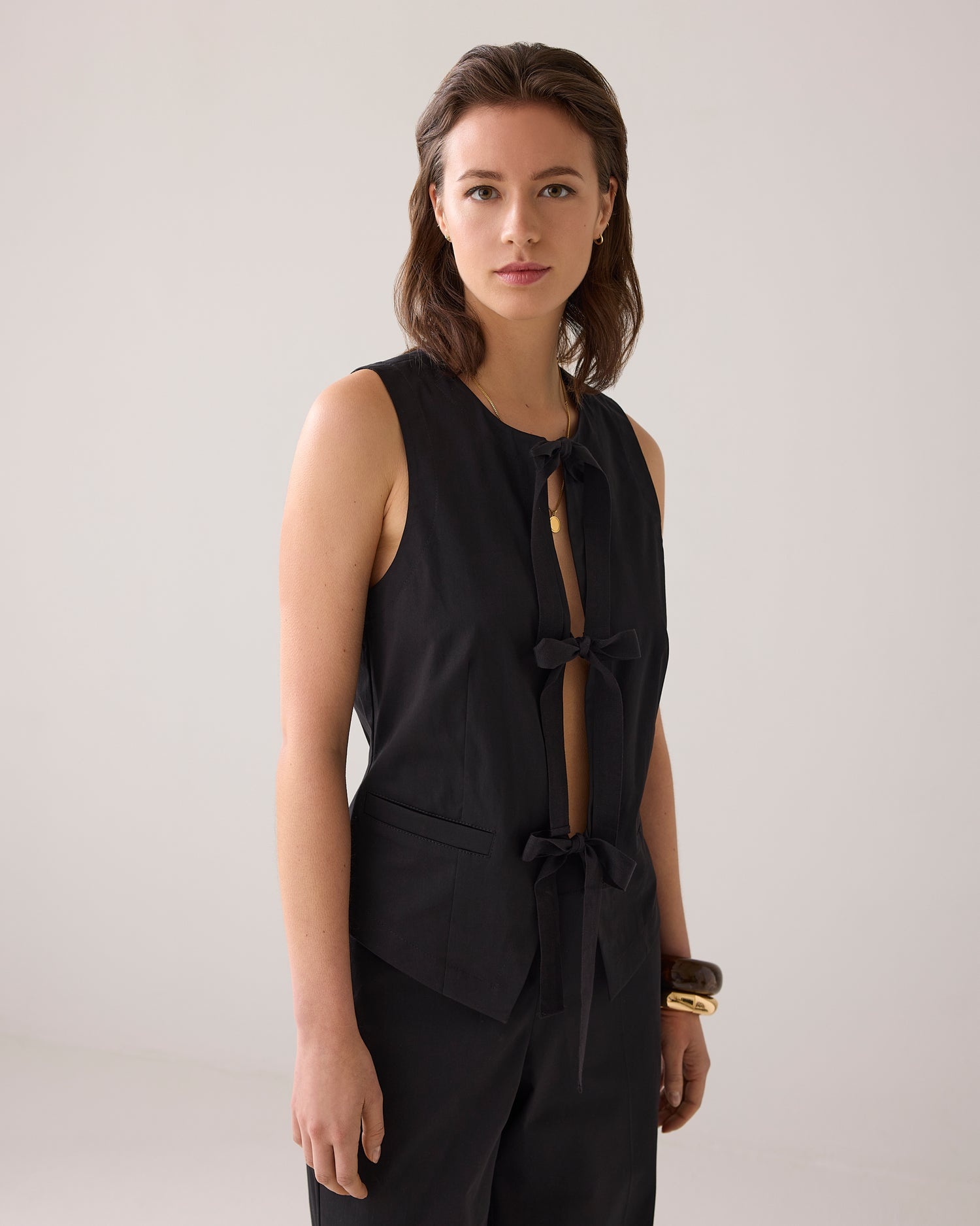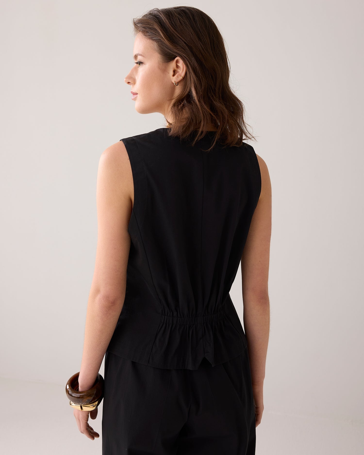 Mouwloos katoenen gilet met een striksluiting van ribsband en een rimpeling aan de achterkant. Het vest heeft fake strookzakken op het voorpand.