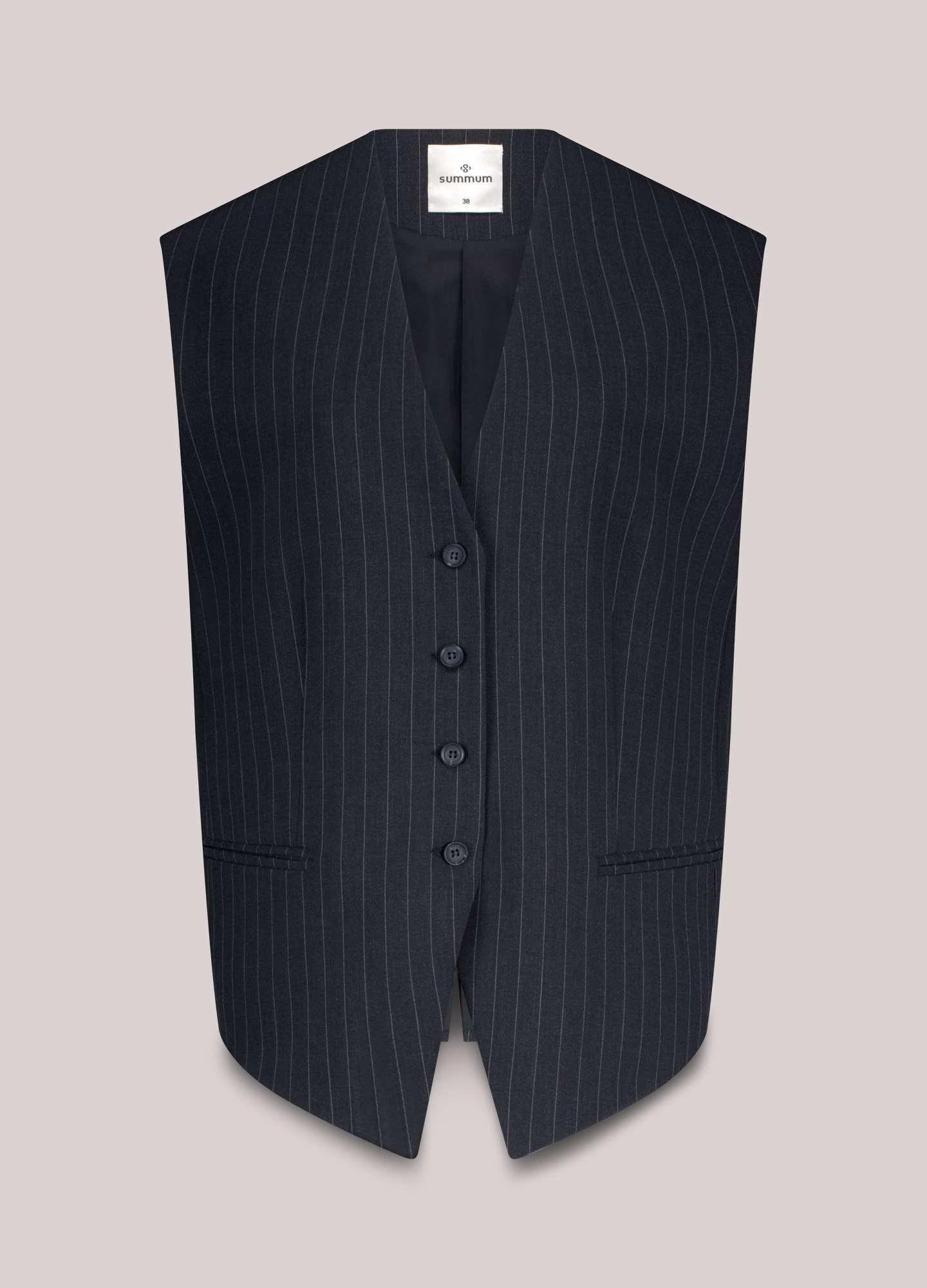 Krijtstreep gilet met een split aan de achterkant en fake paspelzakken aan de voorkant. Combineer het met de bijpassende broek 4s2878.