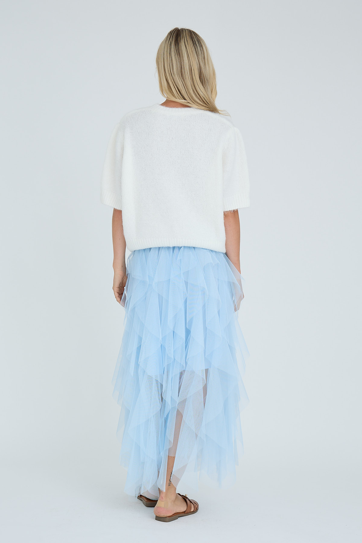 Regular fit lange A-lijn rok van tule. De rok heeft een elastische tailleband. Alleen de onderkant van de rok is doorschijnend.