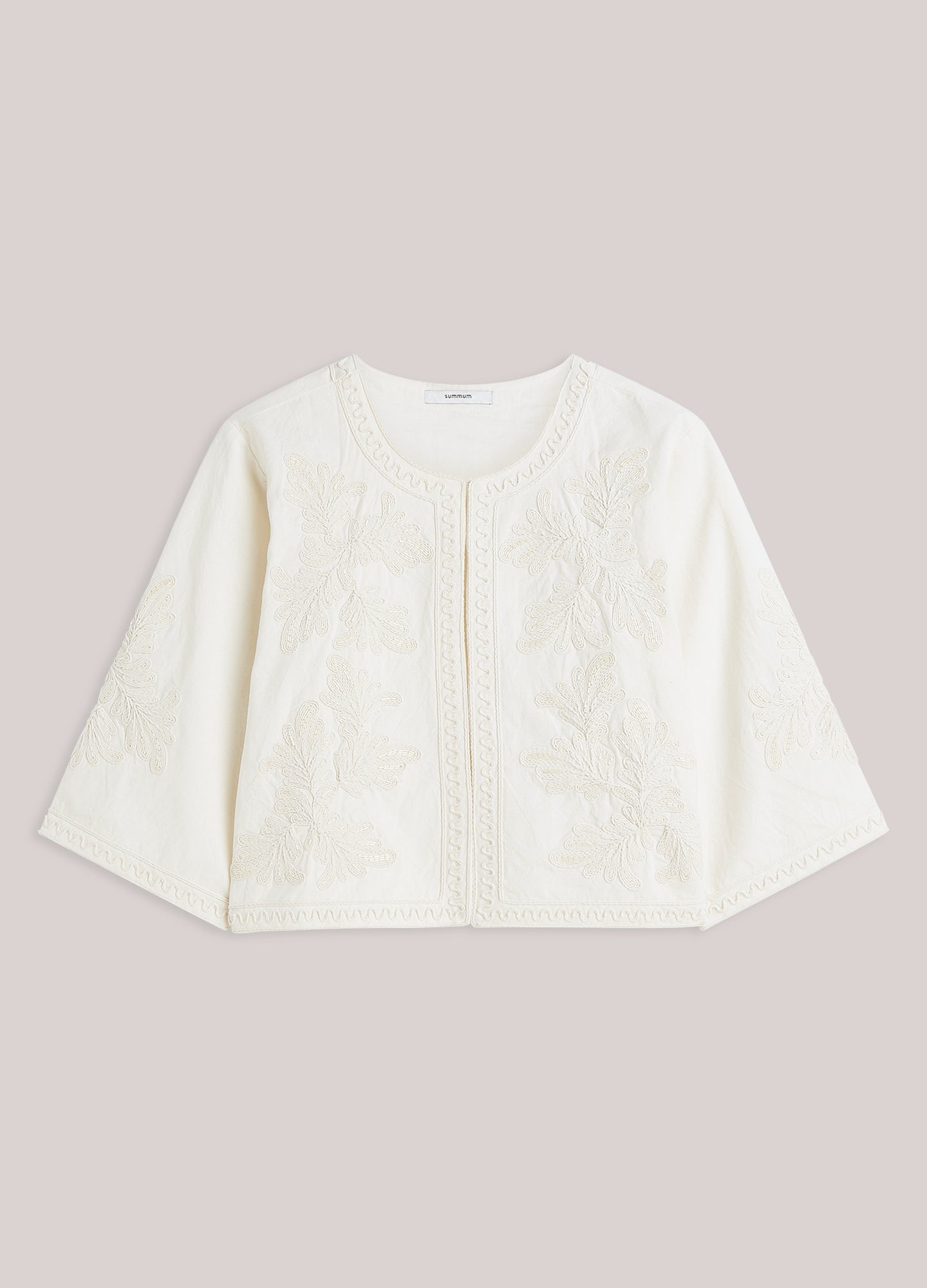 Kort katoenen jasje met een geborduurd bladmotief op de voor- en achterkant en langs de mouwen. Het borduurwerk is versierd met kraaltjes. Het jack heeft een katoenvoile voering, een ronde hals met een enkele knoopsluiting en driekwart kimonomouwen.