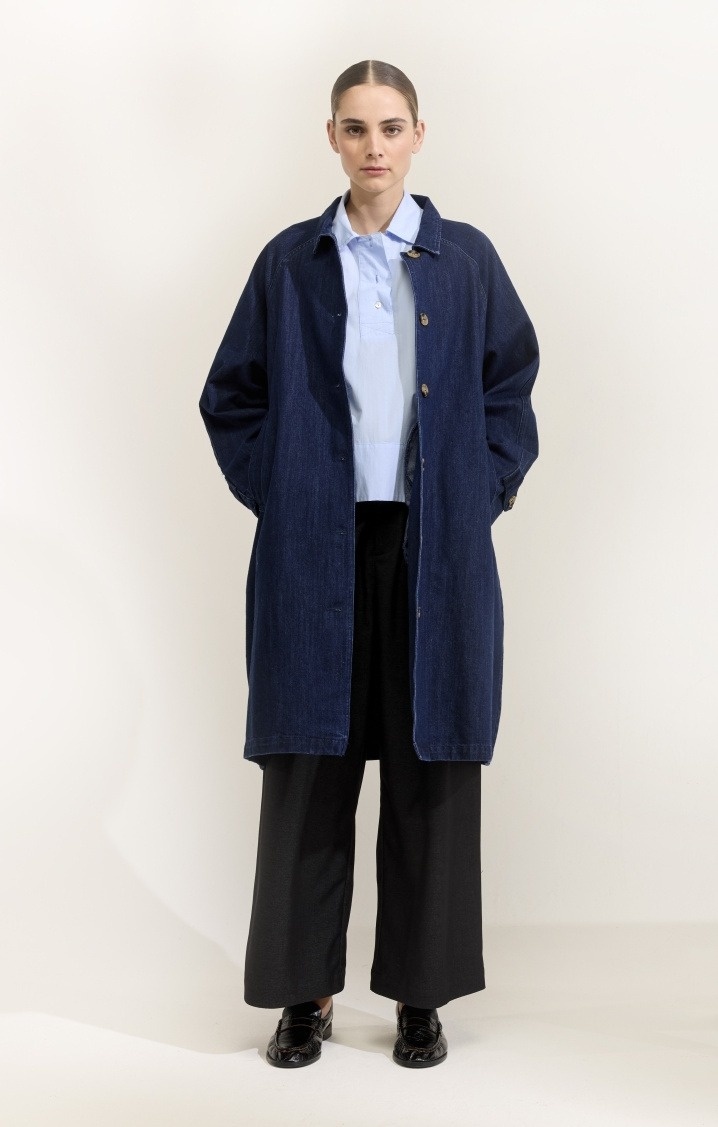 • Halflange denim jas met een knoopsluiting en twee steekzakken.