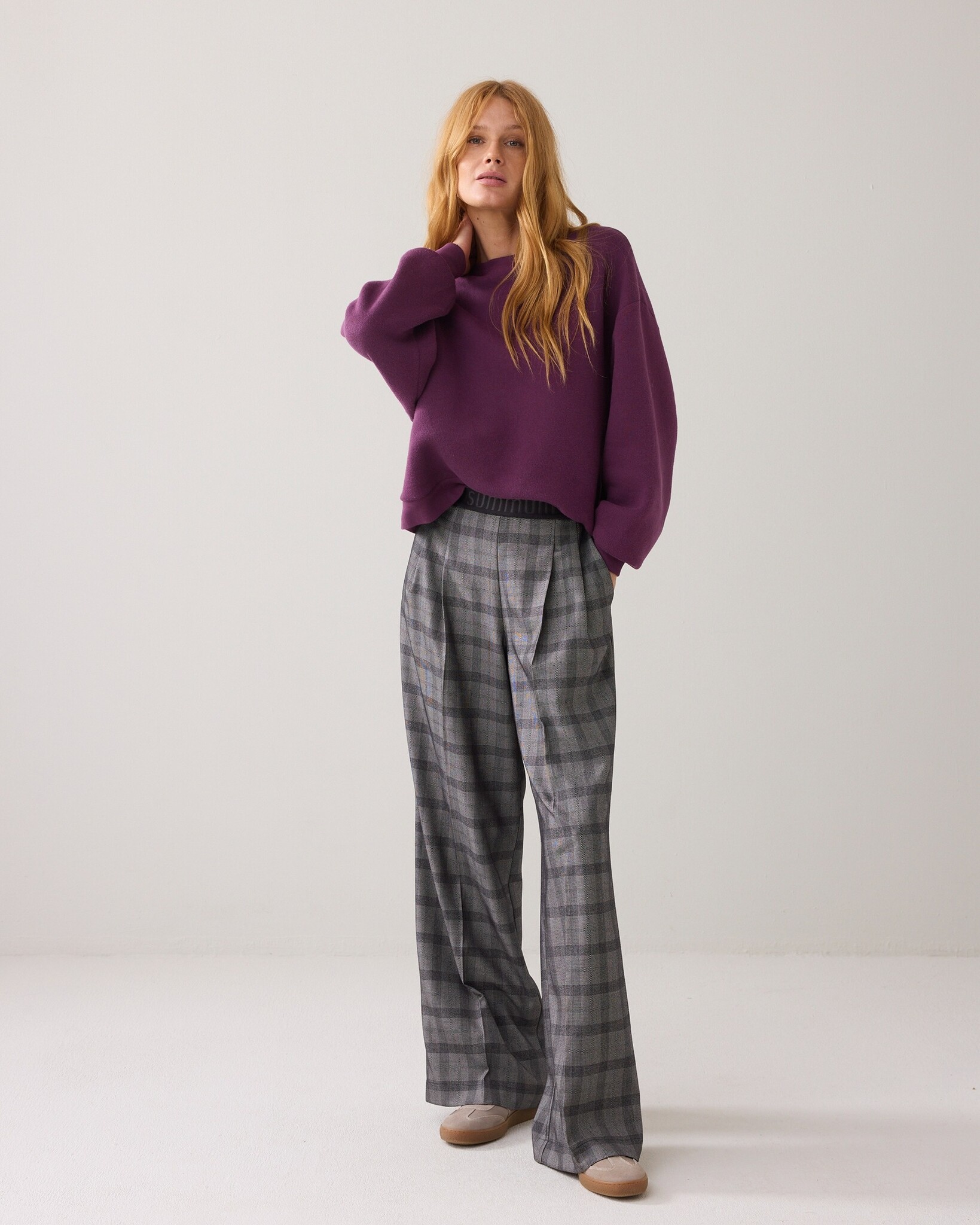 Taillebroek met rechte wijde pijpen, steekzakken en paspelzakken achter in een comfortable stevige jersey-stretchstof.