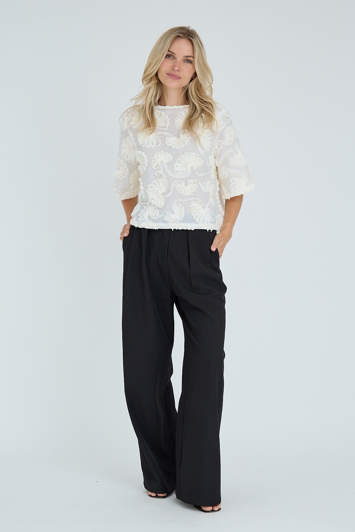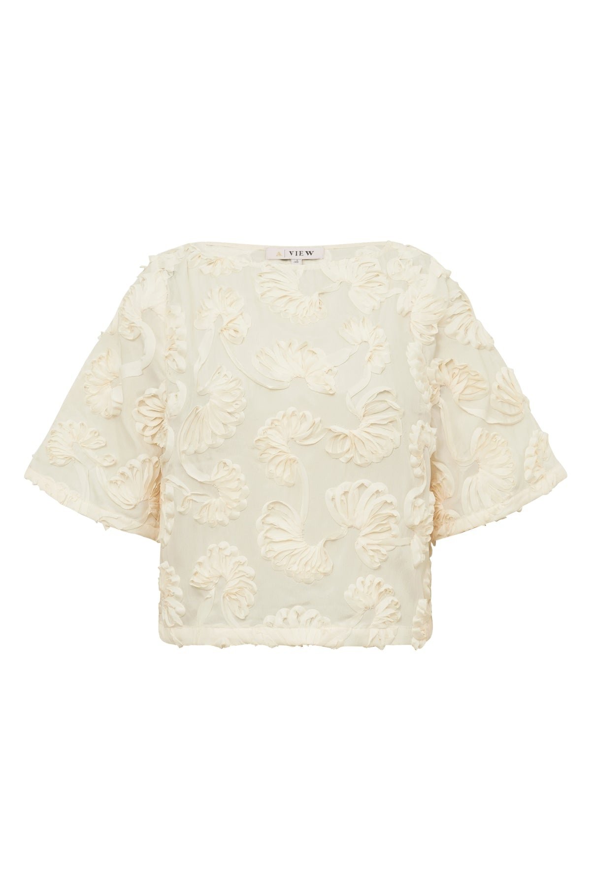 Loose fit blouse versierd met driedimensionale bloemendetails. De blouse heeft een ronde hals, korte mouwen en een recht silhouet voor een lichte en elegante look.