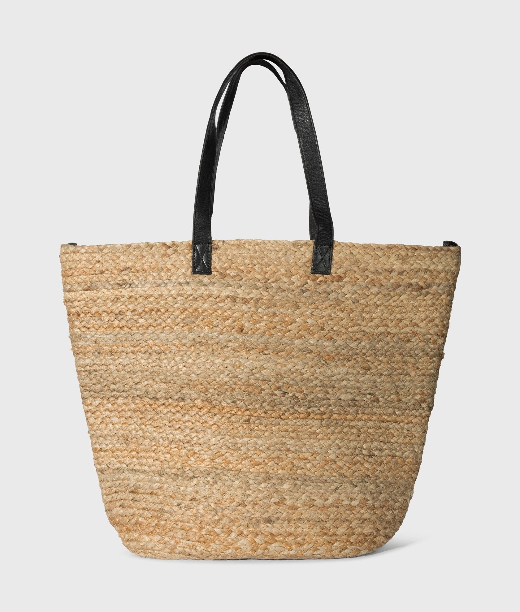 Stijlvolle beach shopper gemaakt van natuurlijk geweven jute. De tas heeft lange, comfortabele zwarte leren handvatten waarmee de tas comfortabel over de schouder gedragen kan worden. Een subtiel 10Days-logo siert de voorkant.