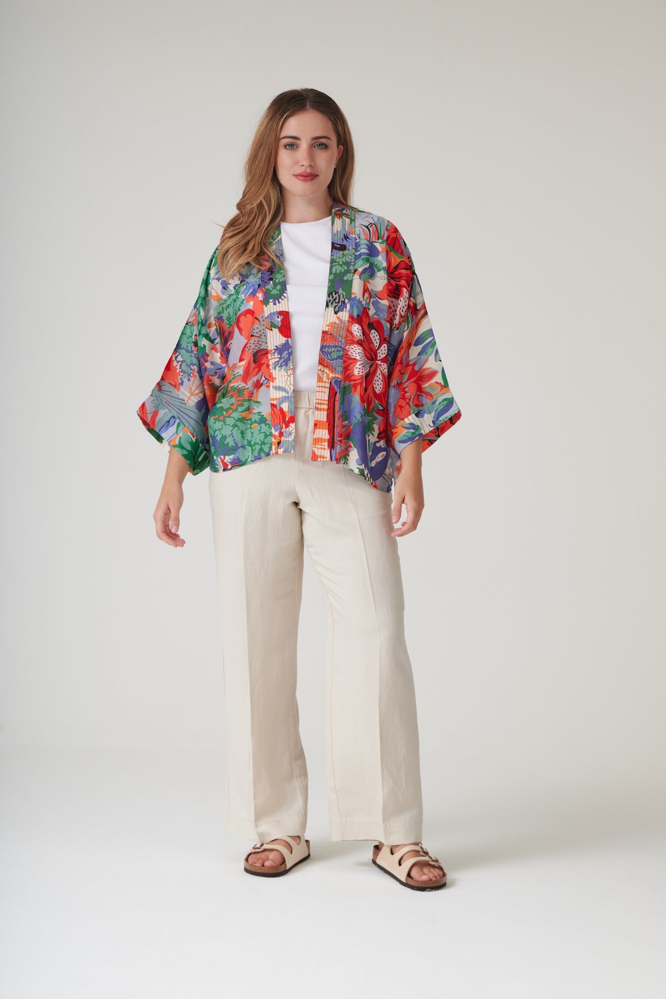 Korte kimono gemaakt van een heerlijk zacht lichtgewicht en duurzaam materiaal met een gevoel van zijde. De kimono valt tot op de heup en heeft 3/4 mouwen. Makkelijk te combineren en maakt je outfit af!