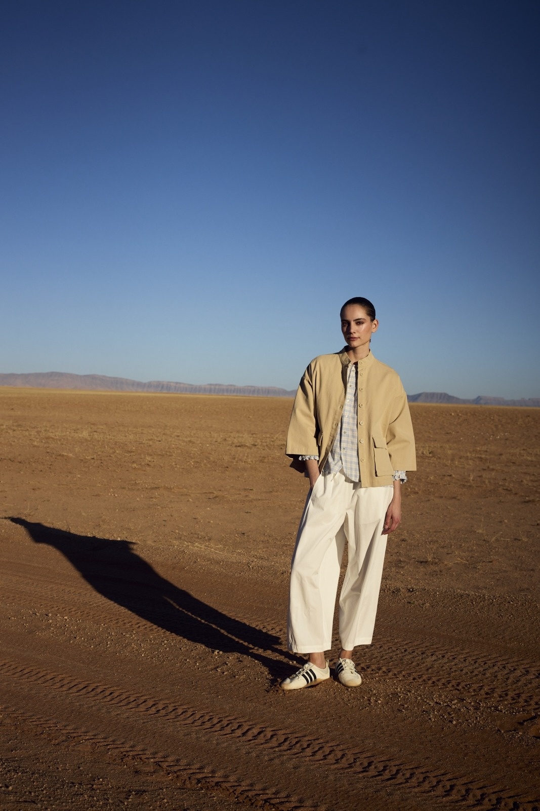 Lichtgewicht katoenen voorjaarsjas met een opstaande kraag, driekwart mouwen, een knoopsluiting en twee opgestikte zakken aan de voorkant.