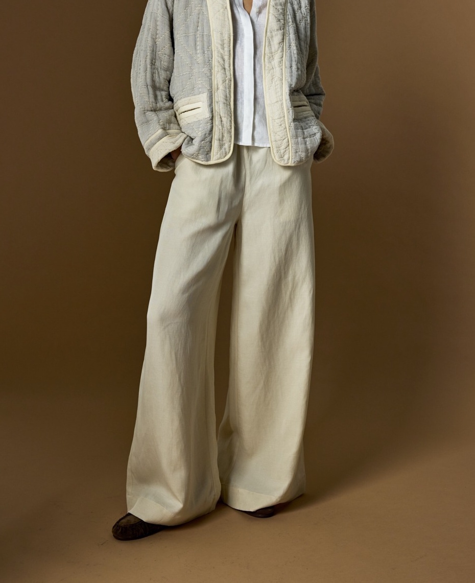 Wijde broek gemaakt van een blend van lyocell en linnen. De broek heeft twee steekzakken en een elastische tailleband. Combineer het met het Leigh jacket van de foto.