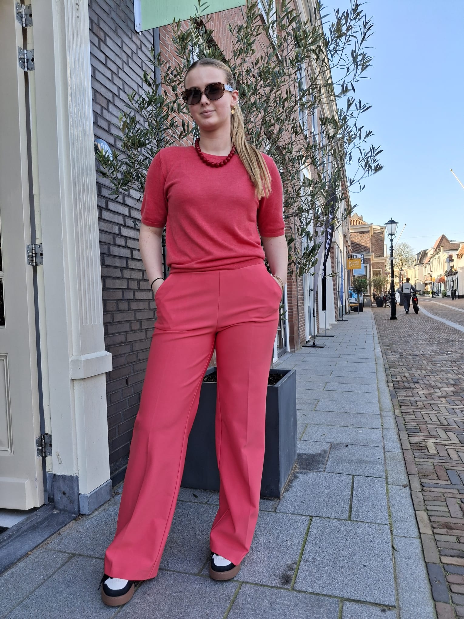 • Taillebroek met rechte wijde pijpen, steekzakken en paspelzakken achter in een comfortable stevige jersey-stretchstof.