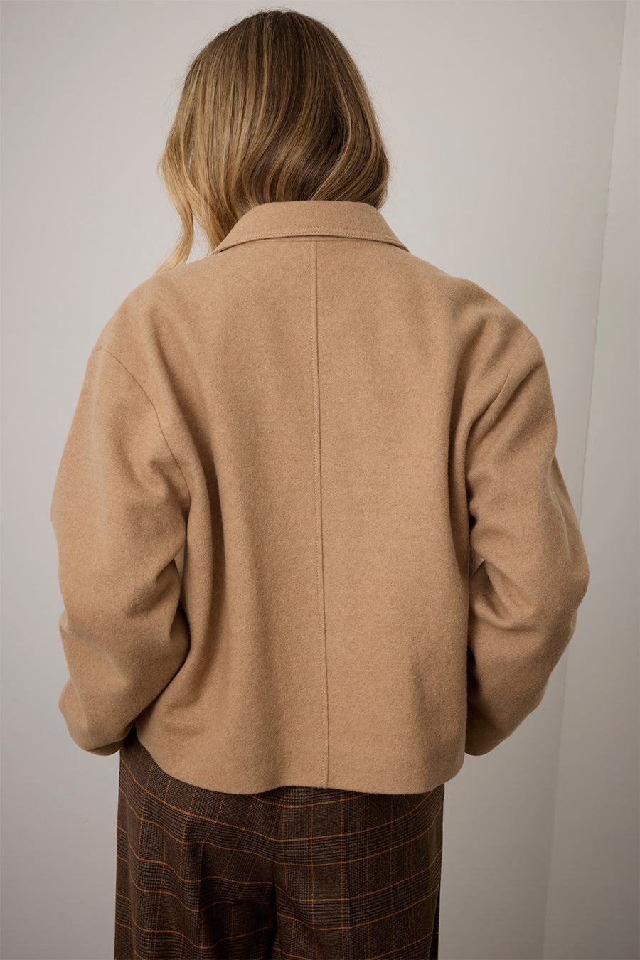 Iets ruimvallend jasje gemaakt van een mooie wolblend. Het jack is gevoerd en heeft rechte mouwen, een hornlook knoopsluiting en klepzakken op de voorkant.
