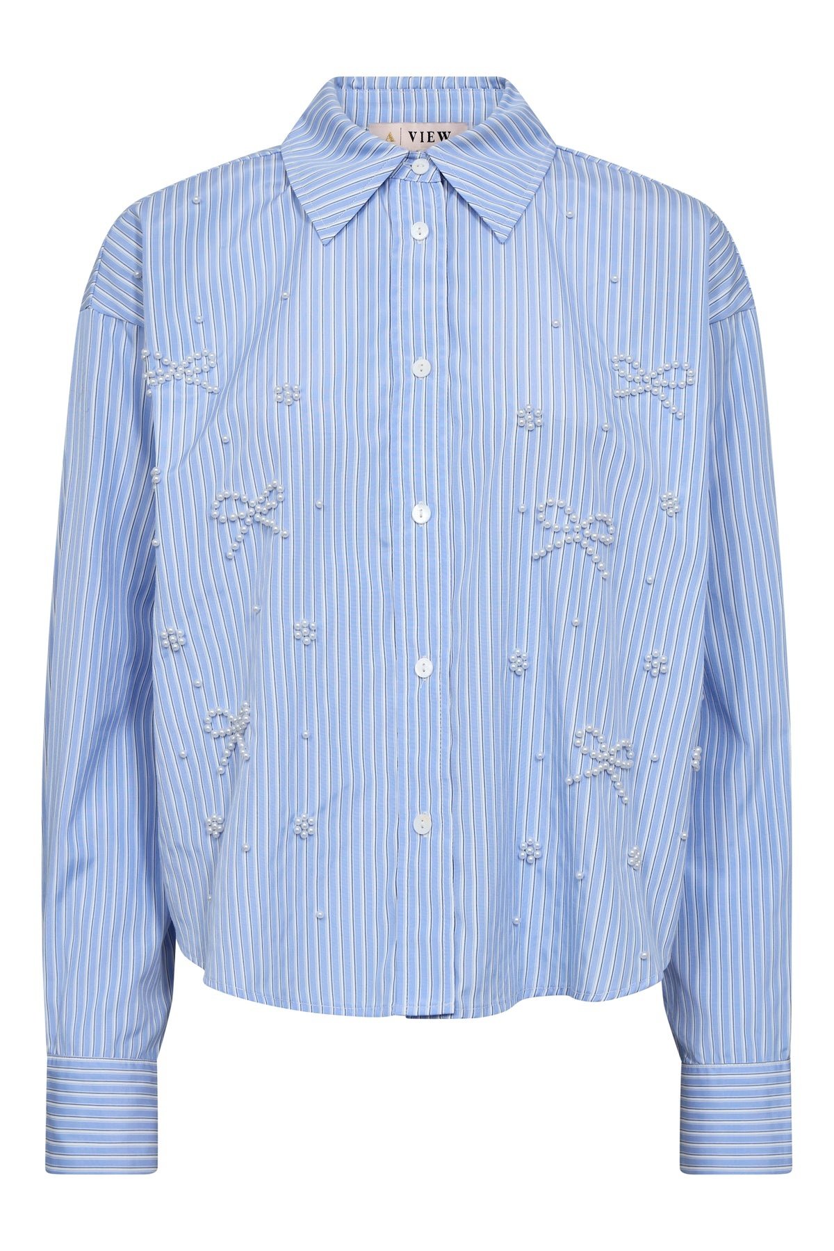 Relaxed fit shirt met verfijnde details en een vrouwelijke touch. De blouse heeft lange mouwen en is ontworpen met klassieke strepen en versierd met kleine parelborduursels die bloemachtige patronen vormen.