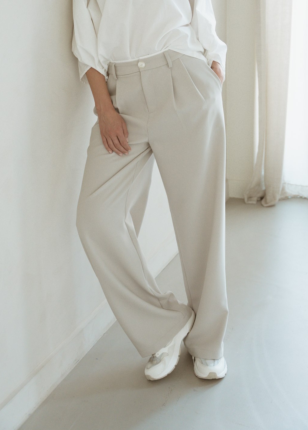 Wijdvallende bandplooibroek met riemlussen en steekzakken.