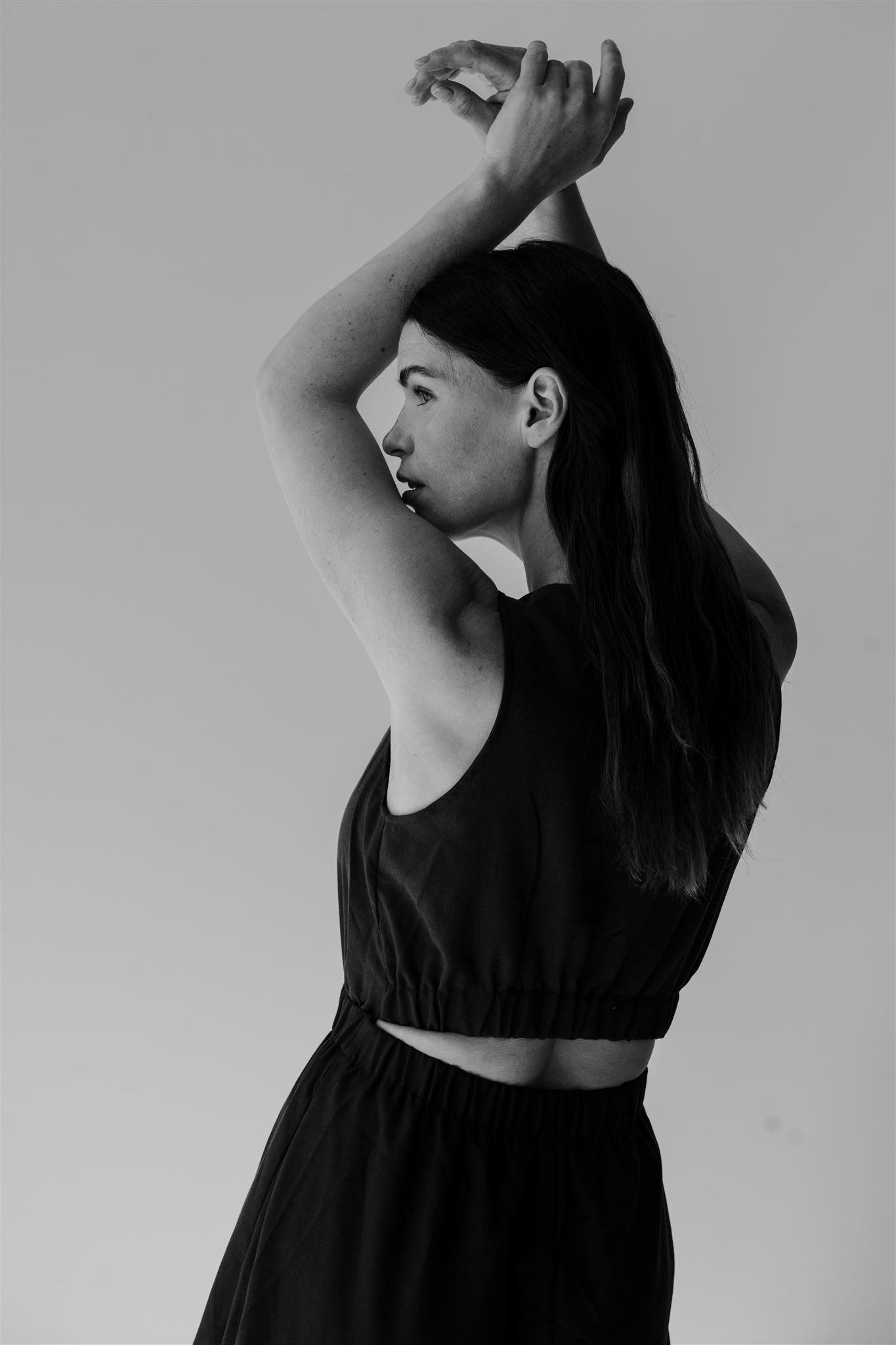 Lange mouwloze jurk met een elastische tailleband die aan de achterkant is opengewerkt.