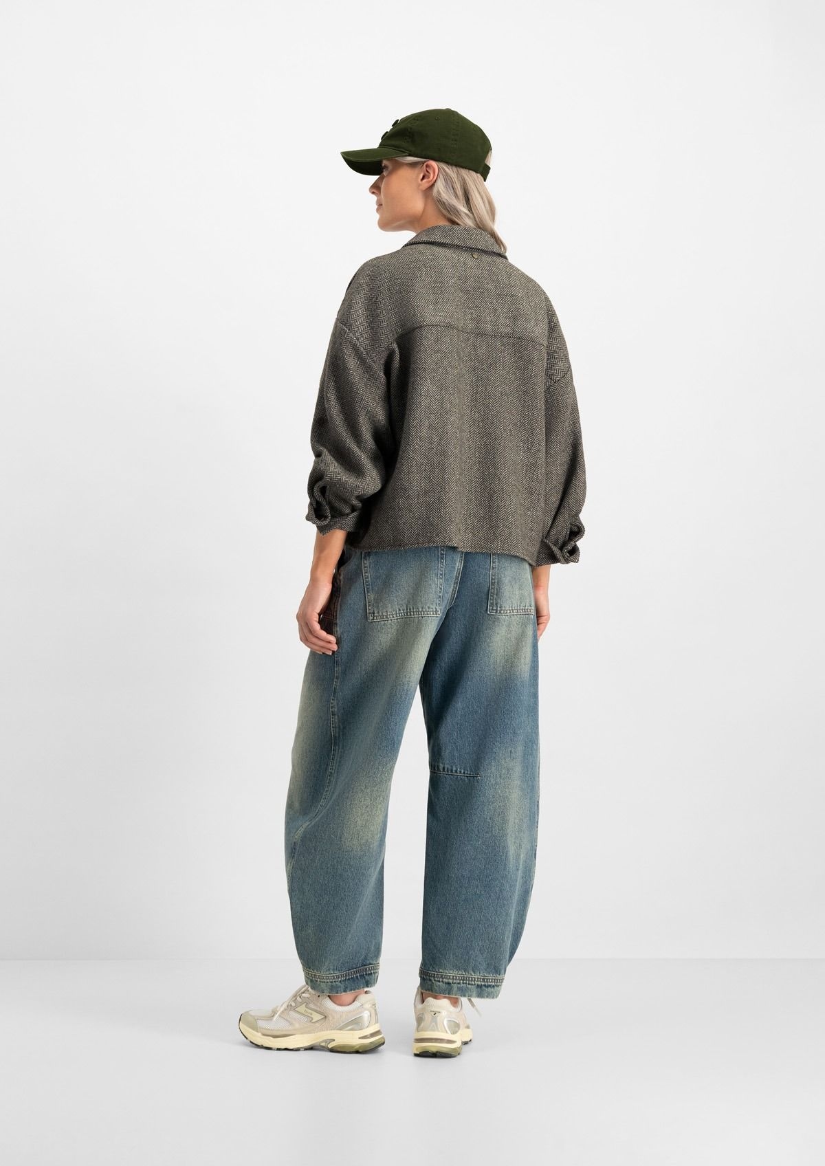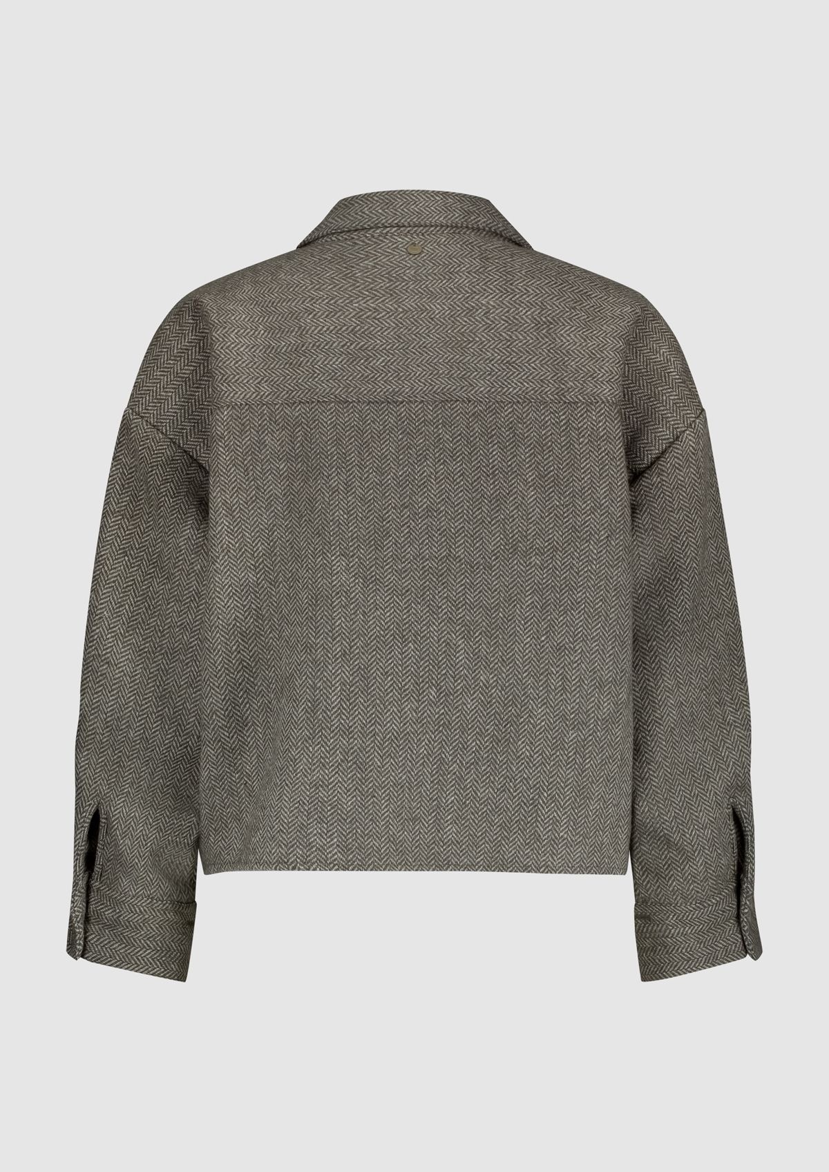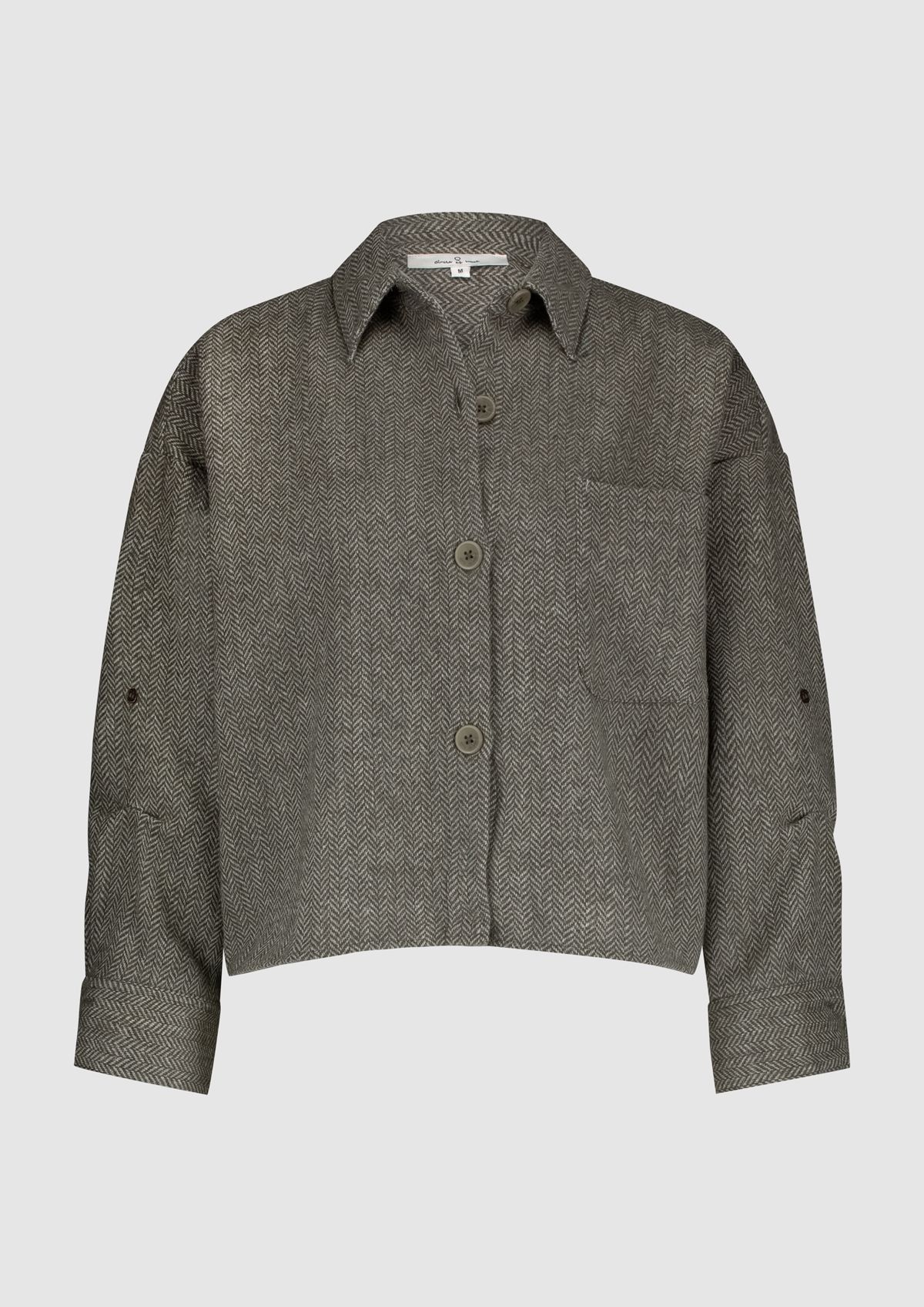 Ruim vallende boxy fit blouse met een visgraat patroon. De blouse heeft een knoopsluiting, een borstzak en is afgewerkt met een gladde polyester voering. De 7/8e mouwen kunnen worden opgerold en worden vastgezet met een knoopje.