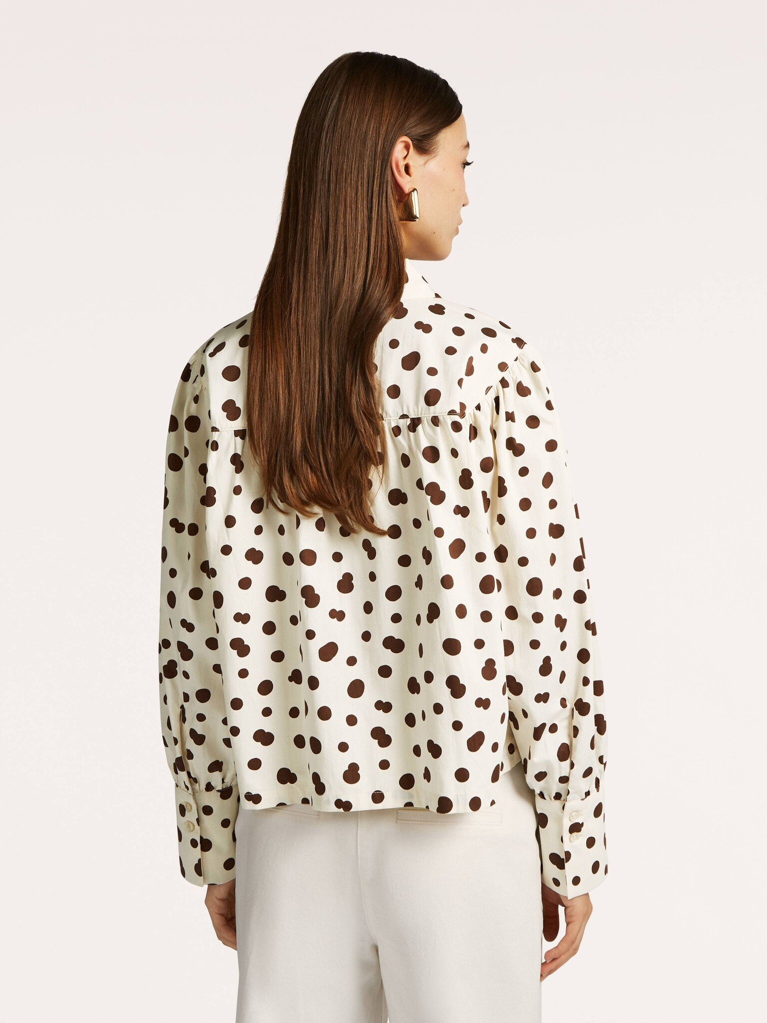 • Loose fit katoenen blouse met een stippen print. De blouse heeft wijde mouwen met rimpels bij de manchetten.