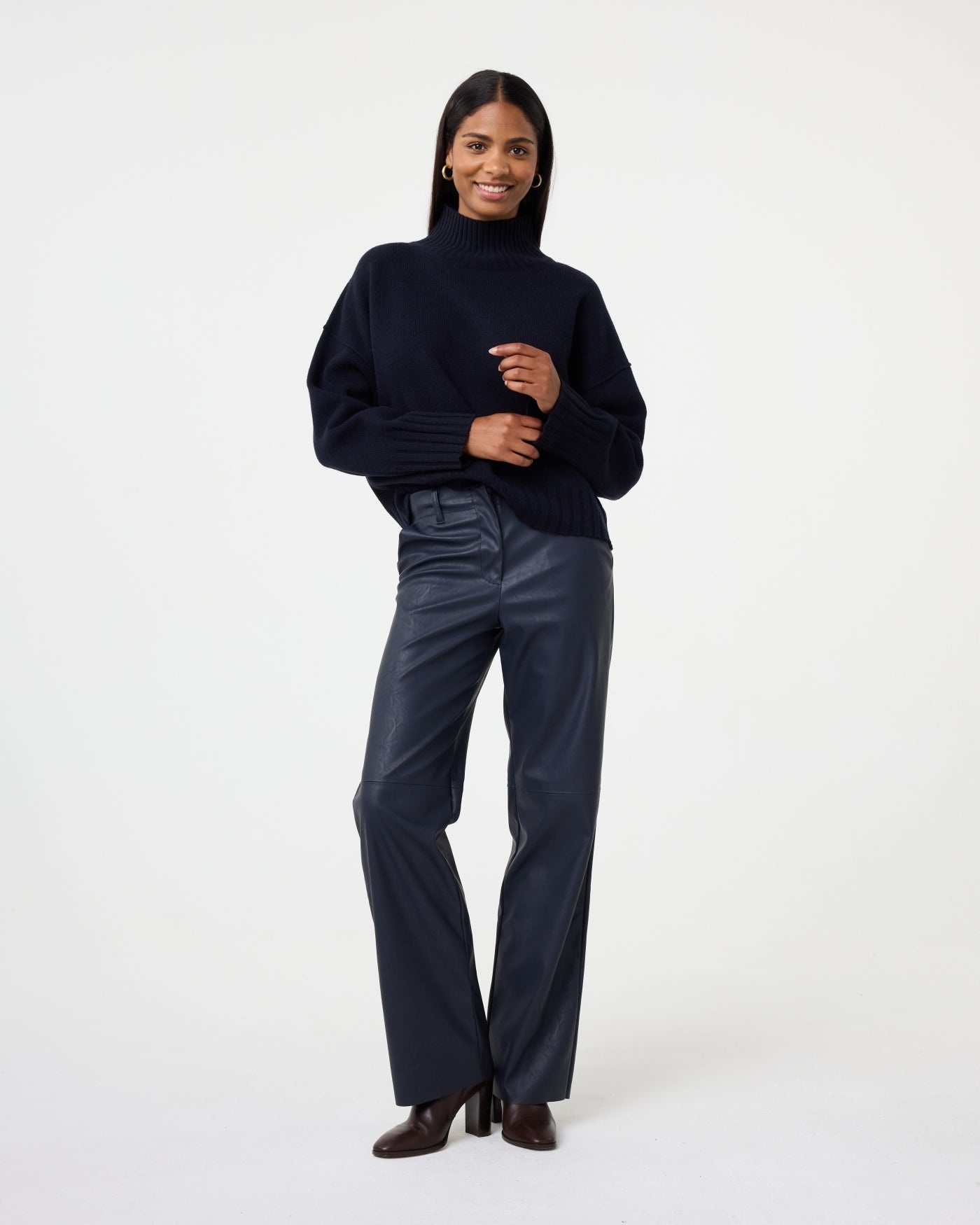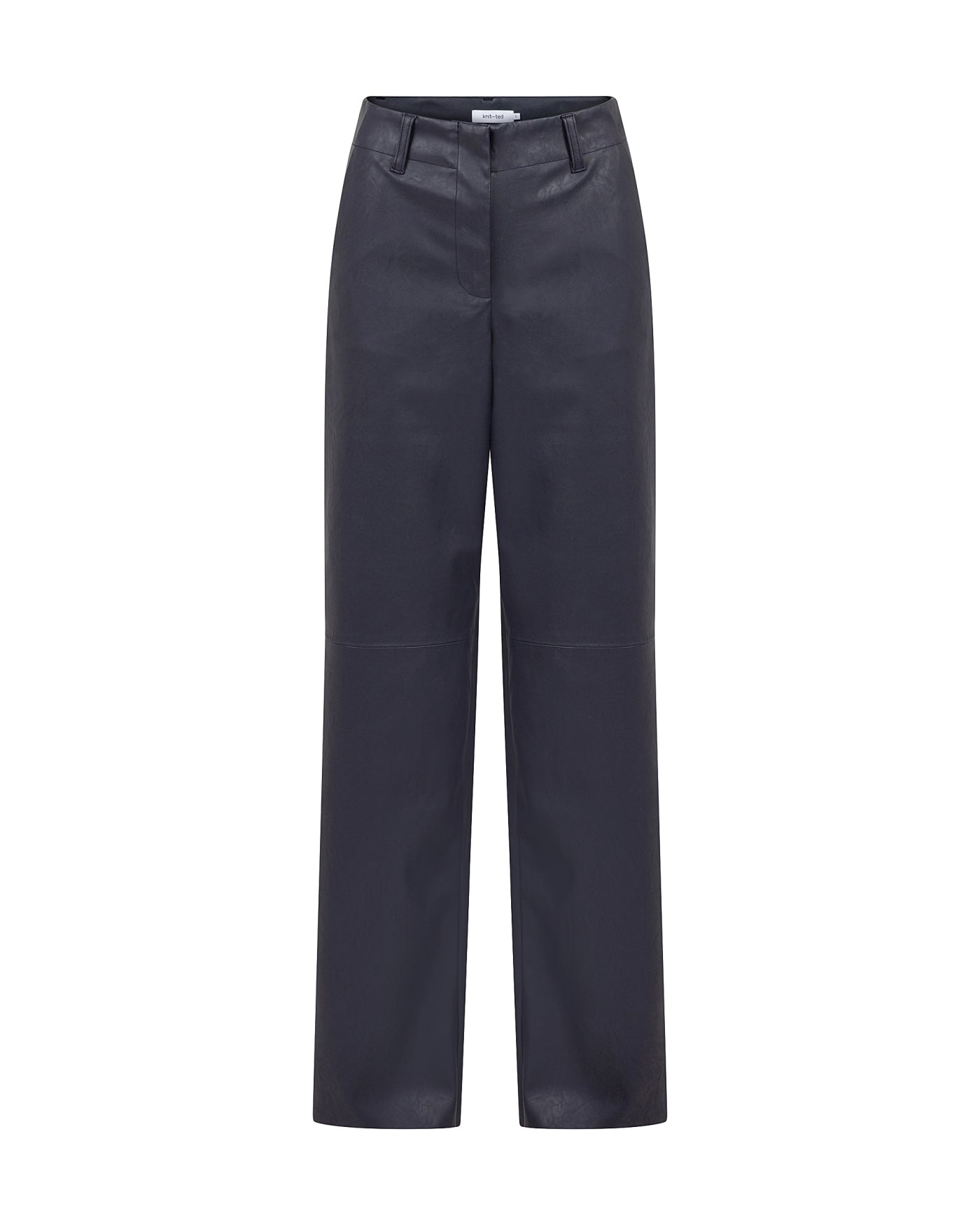 Straight fit pantalon met rechte pijpen, gemaakt van soepel faux leather. De broek heeft 2 steekzakken en 2 paspelzakken aan de achterkant.