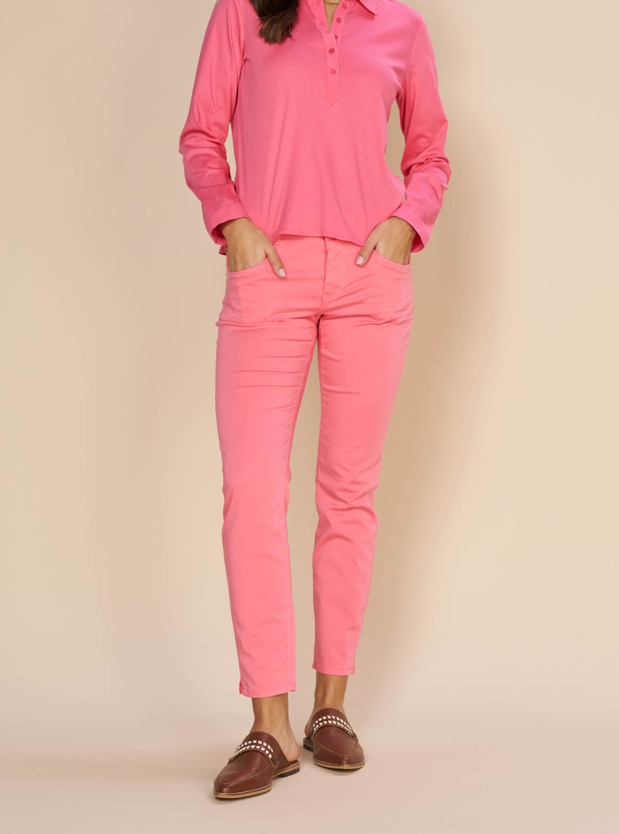 Pantalon met taps toelopende pijpen en een hoge/middelhoge taille. De broek heeft twee subtiele zijsplitten aan de zoom.