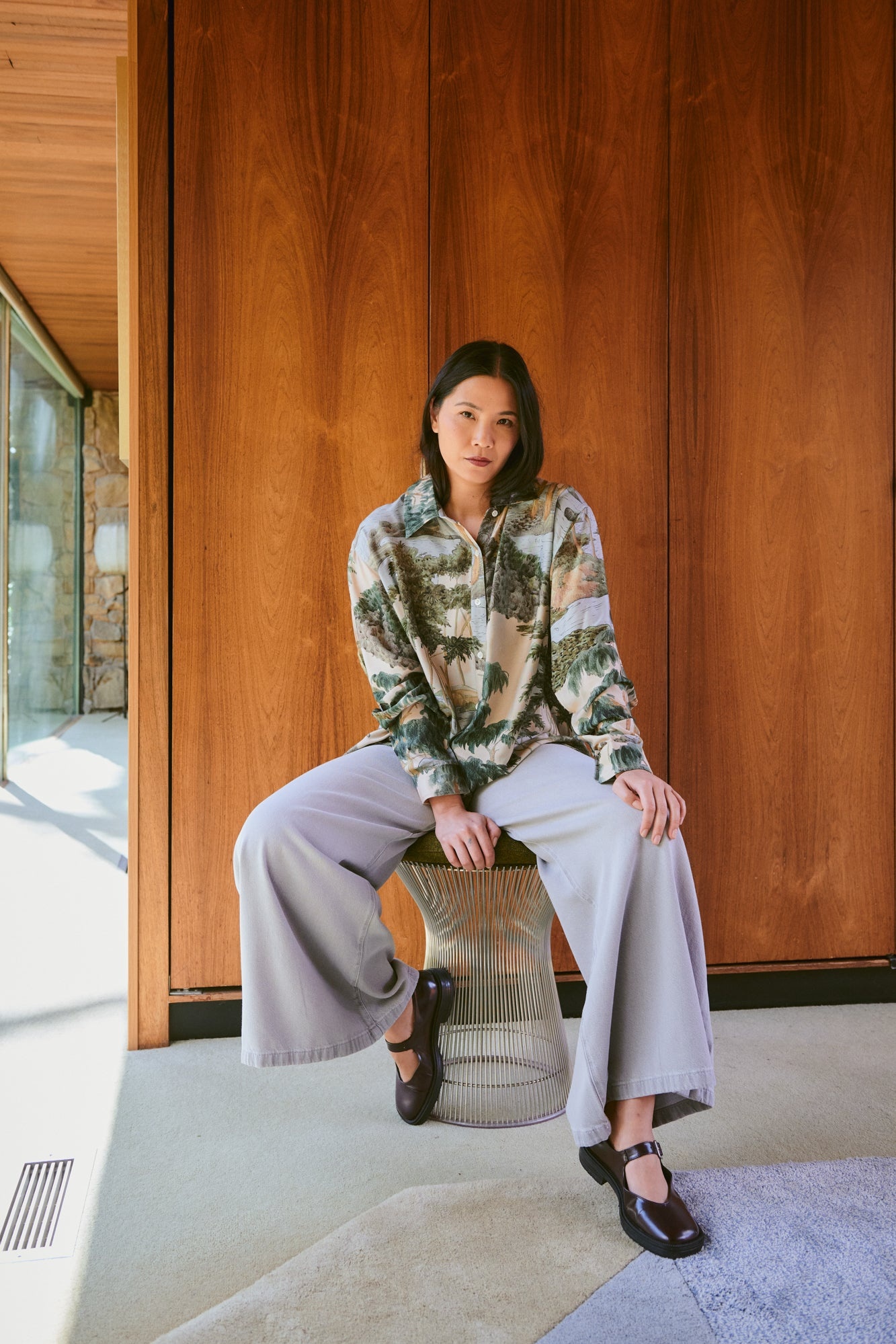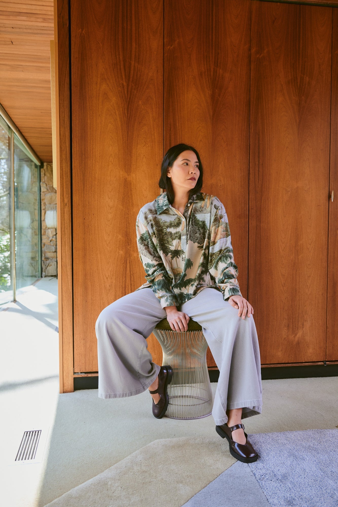 Halflange jurk met een flatterende mandarijnkraag, een verborgen knoopsluiting aan de voorkant, zakken en losvallende ballonmouwen. De jurk is half gevoerd met biologisch katoen voor ultiem comfort.