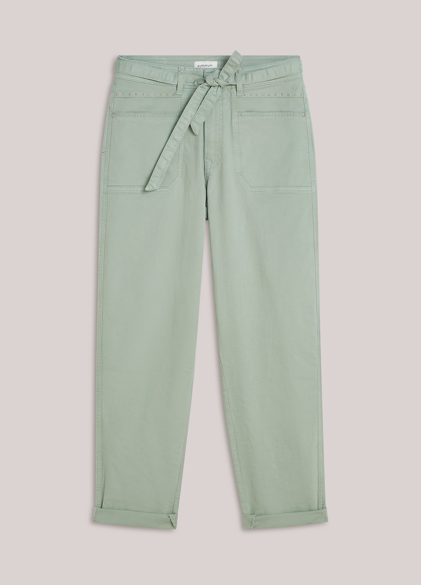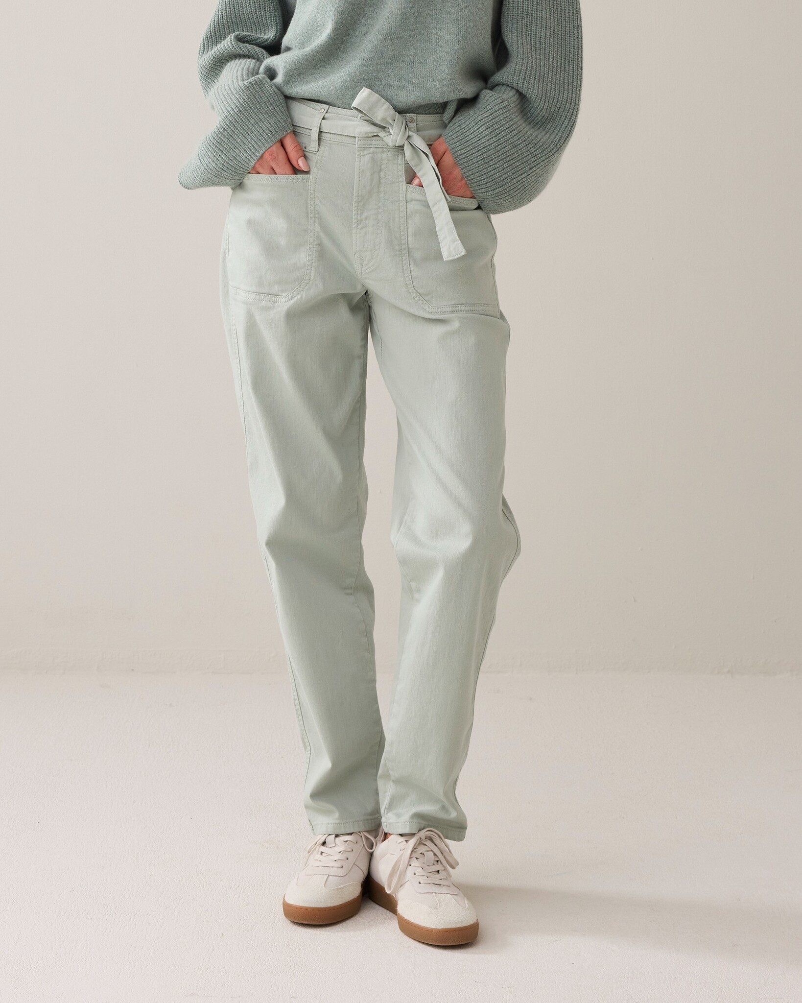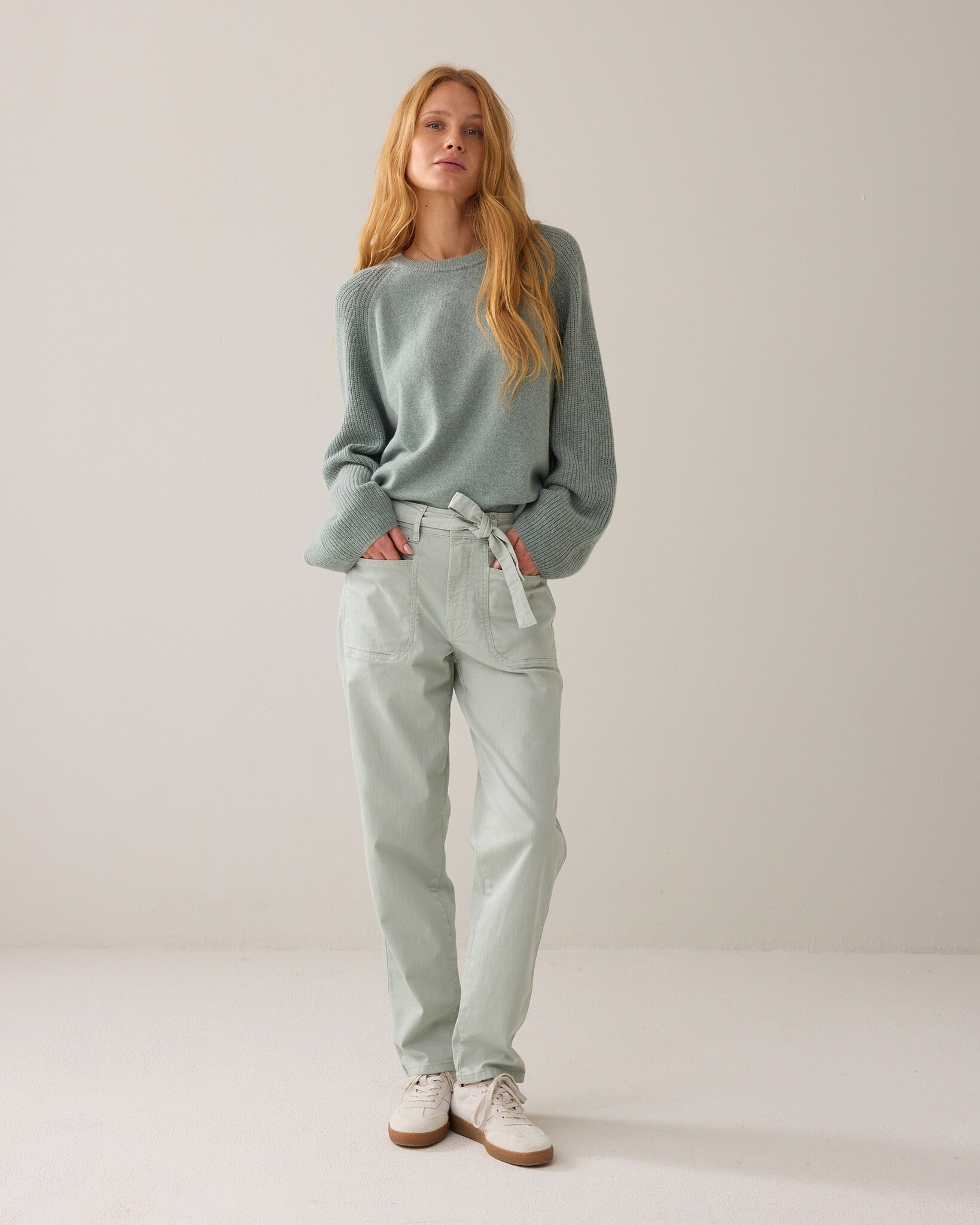 • Regular fit pantalon met een strikceintuur en omgeslagen broekspijpen. Combineer het met de merino sweater in dezelfde kleur.