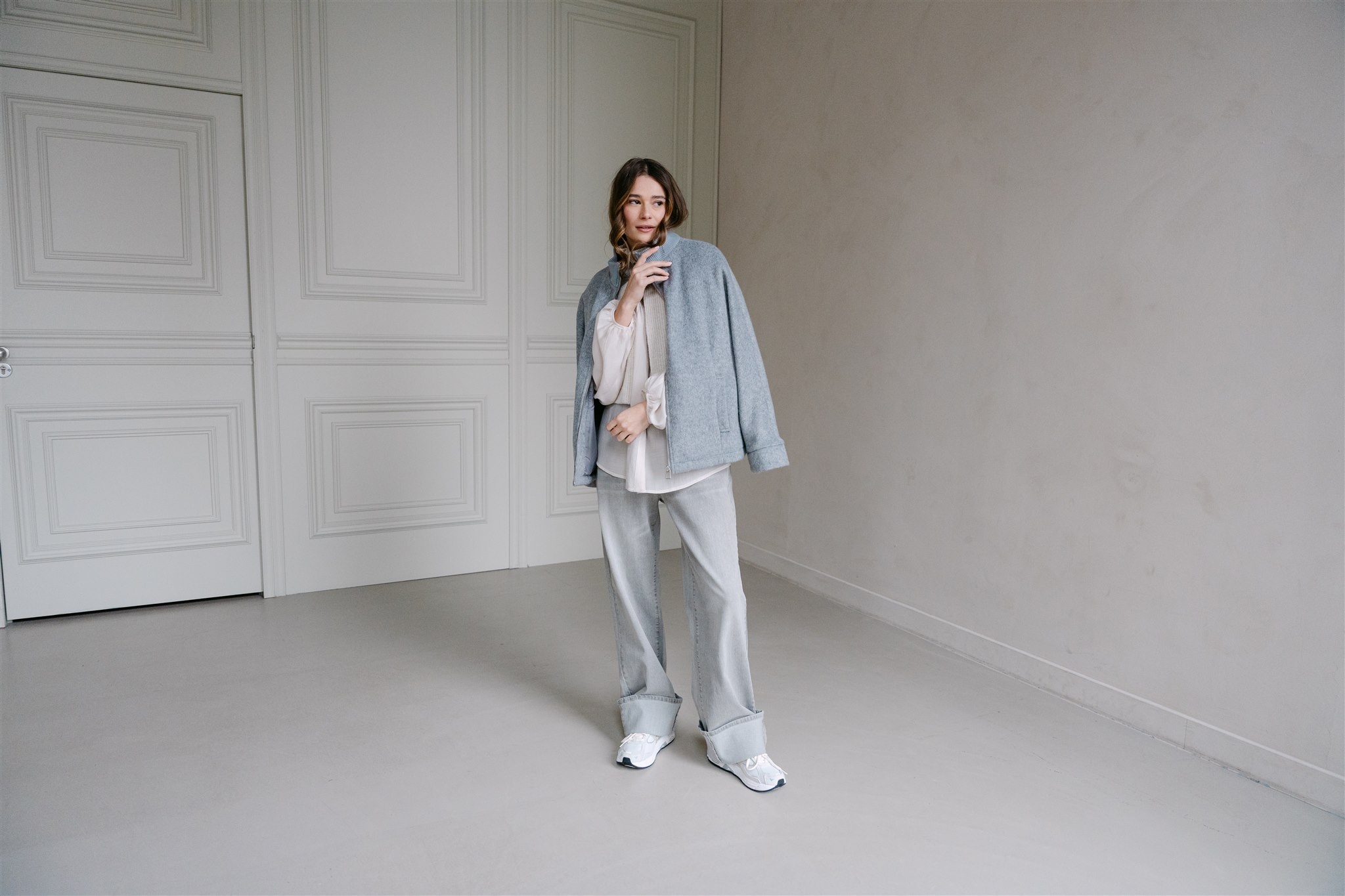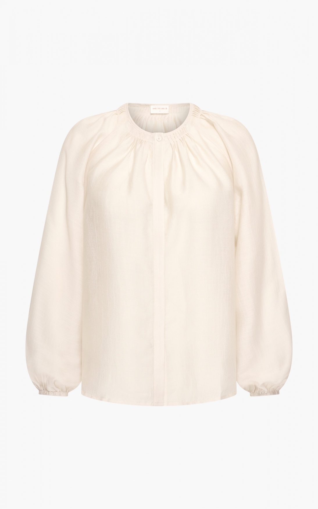 Prachtige blouse met verfijnde plooien langs de ronde halslijn, gemaakt van een soepele en lichte stof. De blouse heeft een subtiele knoopsluiting en volumineuze ballonmouwen.