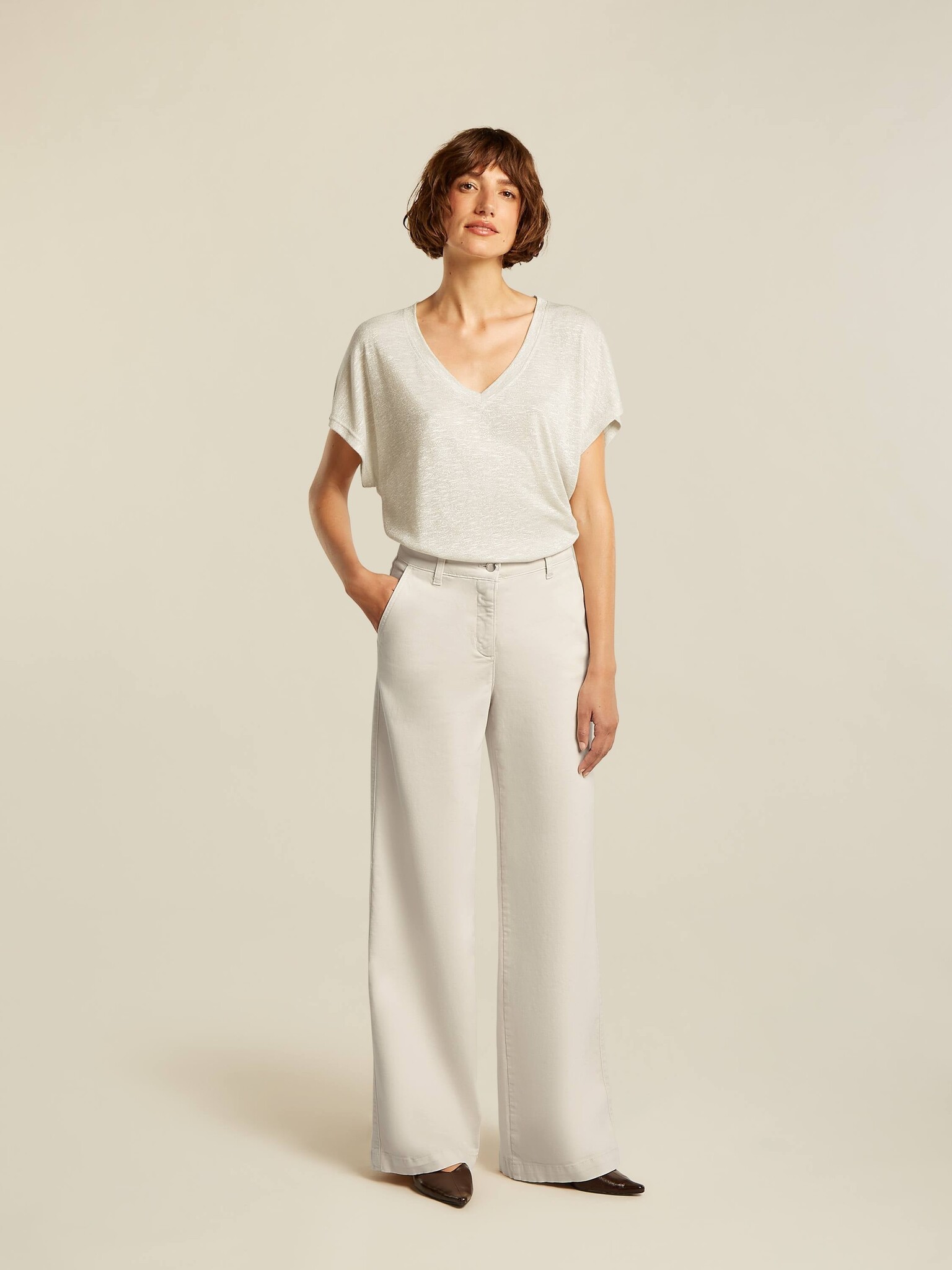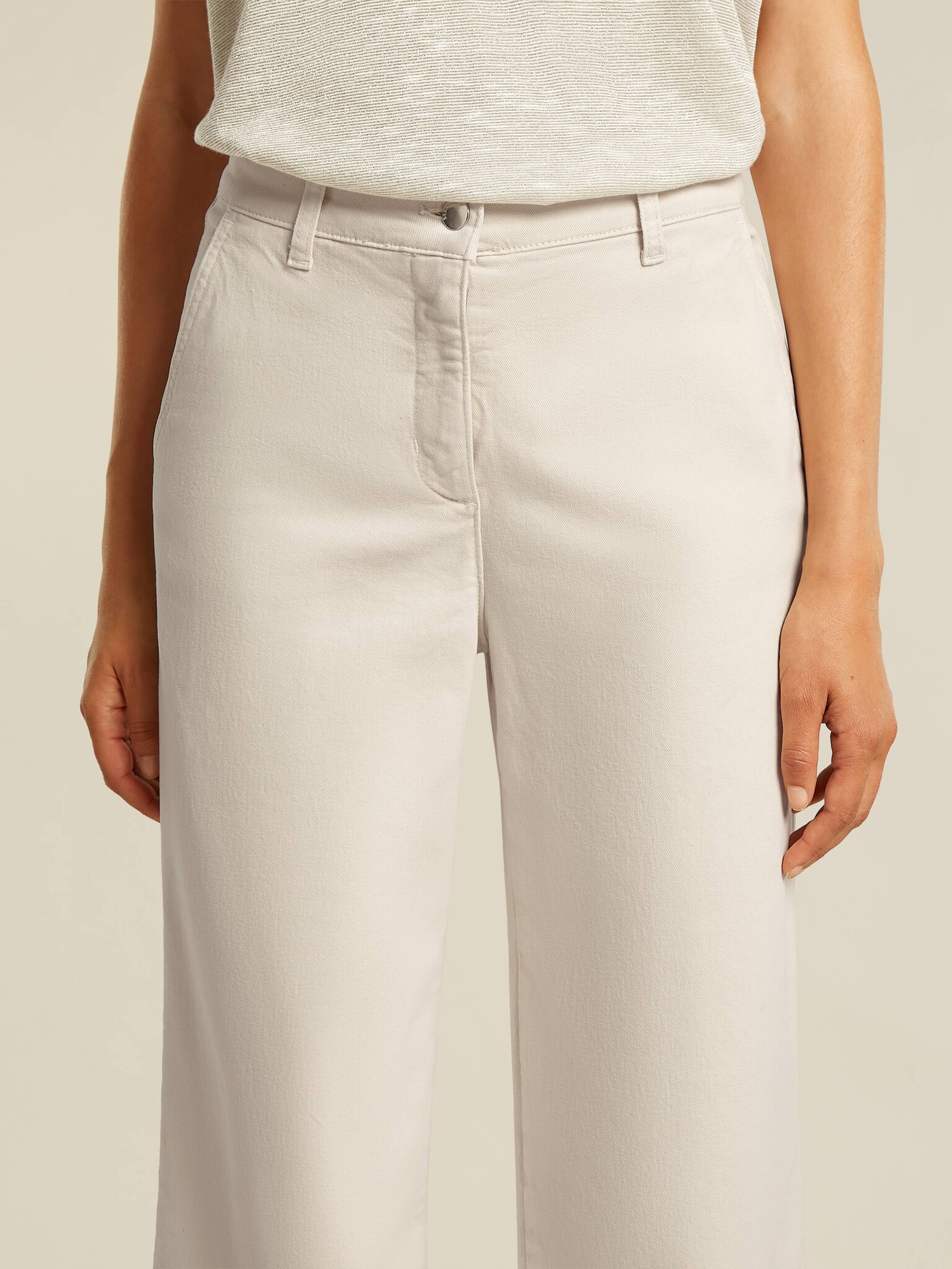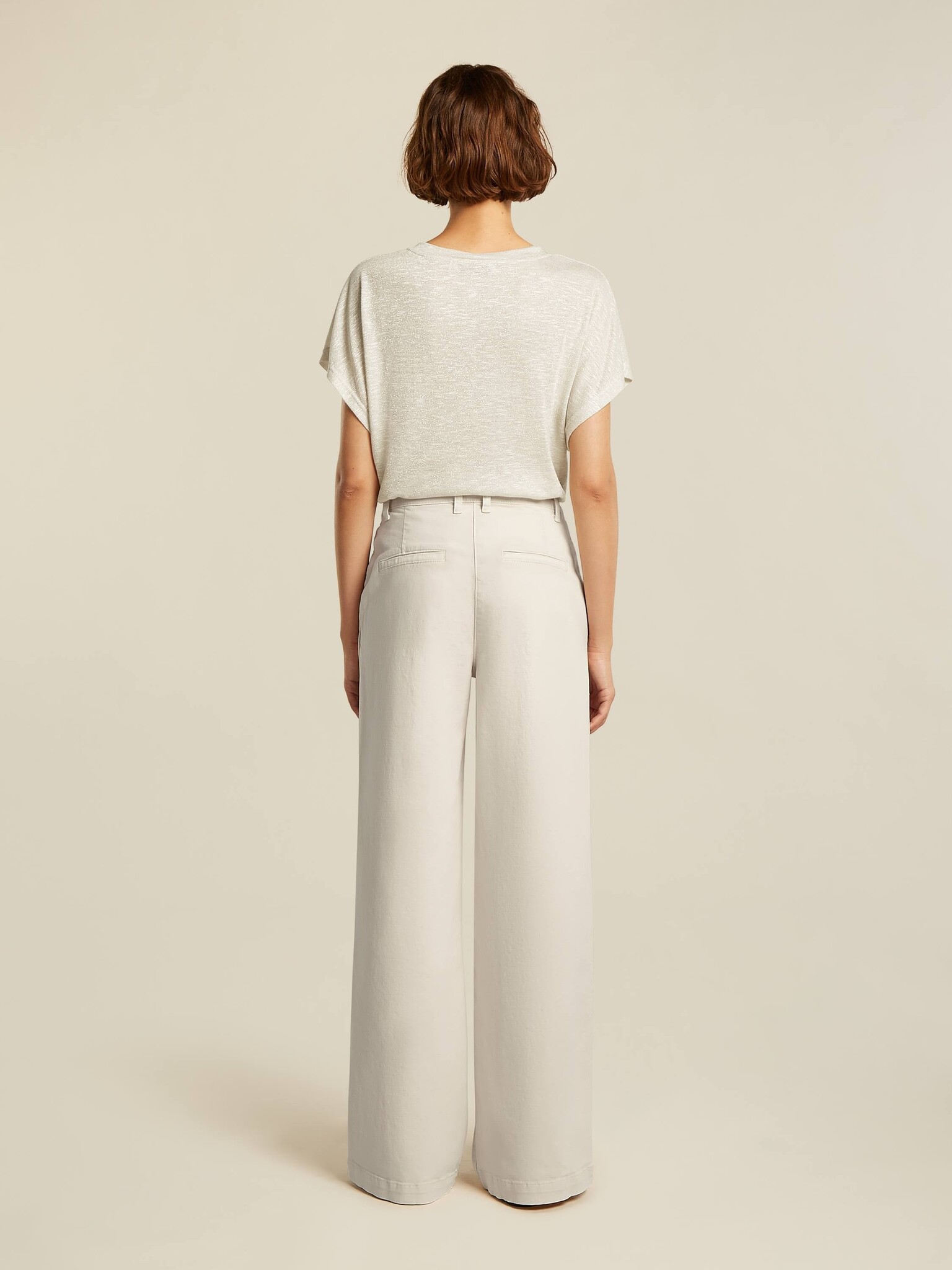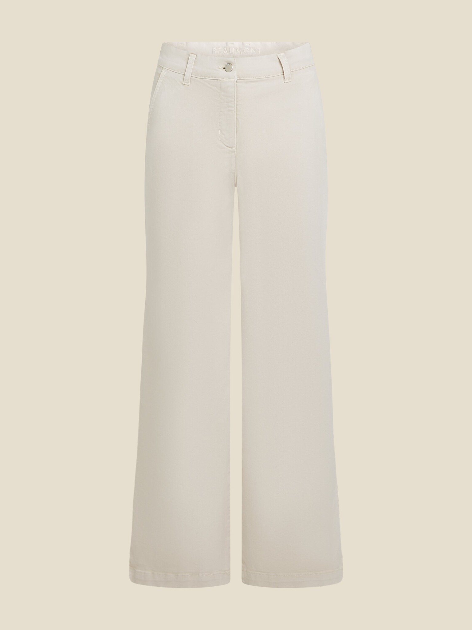 • Relaxed fit wijde broek in een twill stretchkwaliteit. De broek heeft wijde pijpen, ingezette steekzakken aan de voorkant en twee fake paspelzakken aan de achterkant.