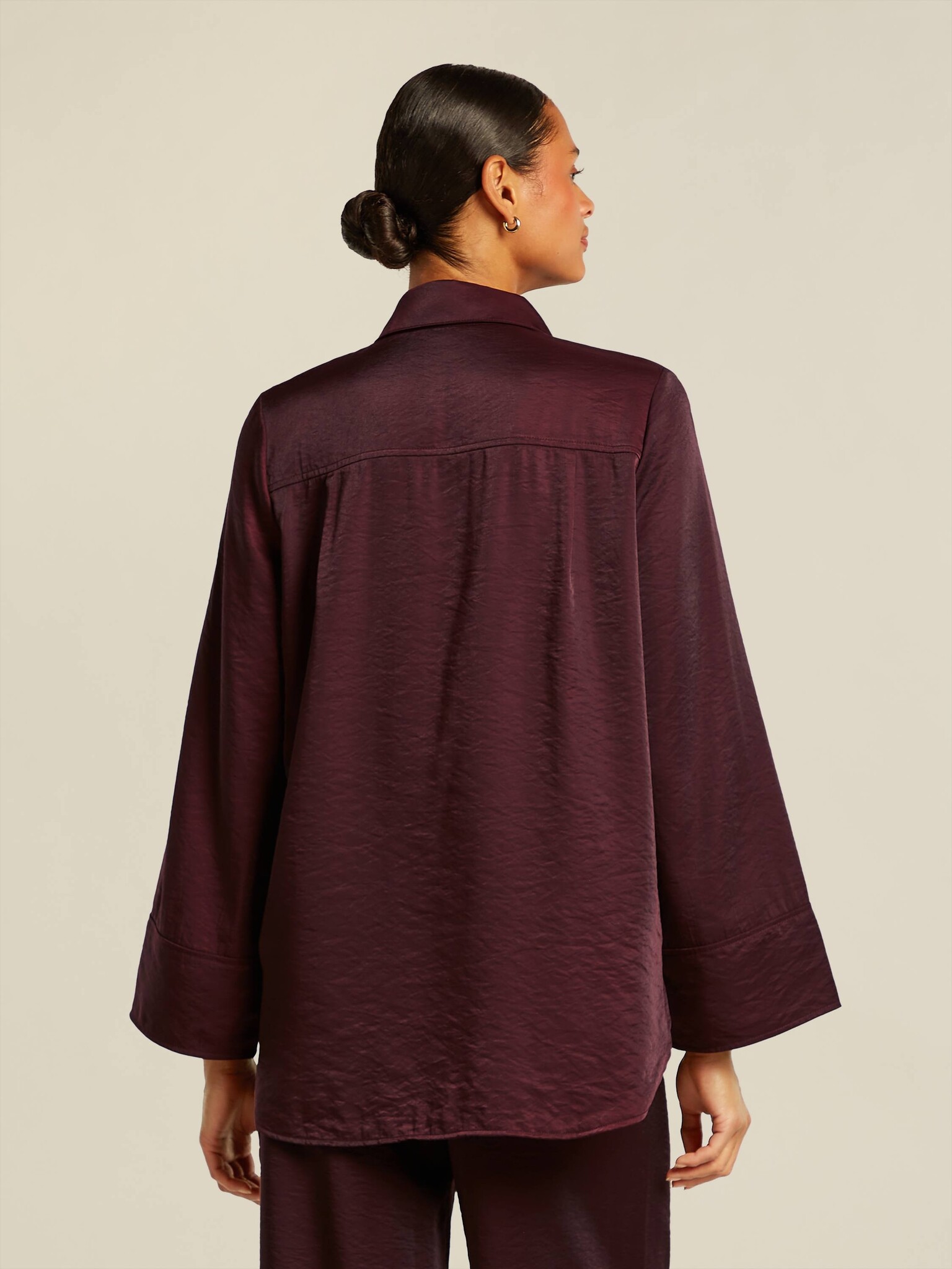 Soepelvallende blouse gemaakt van een matte satijn kwaliteit. De blouse heeft brede, grote manchetten en een plooi midden achter. Combineer het met de bijpassende Deezy pants.