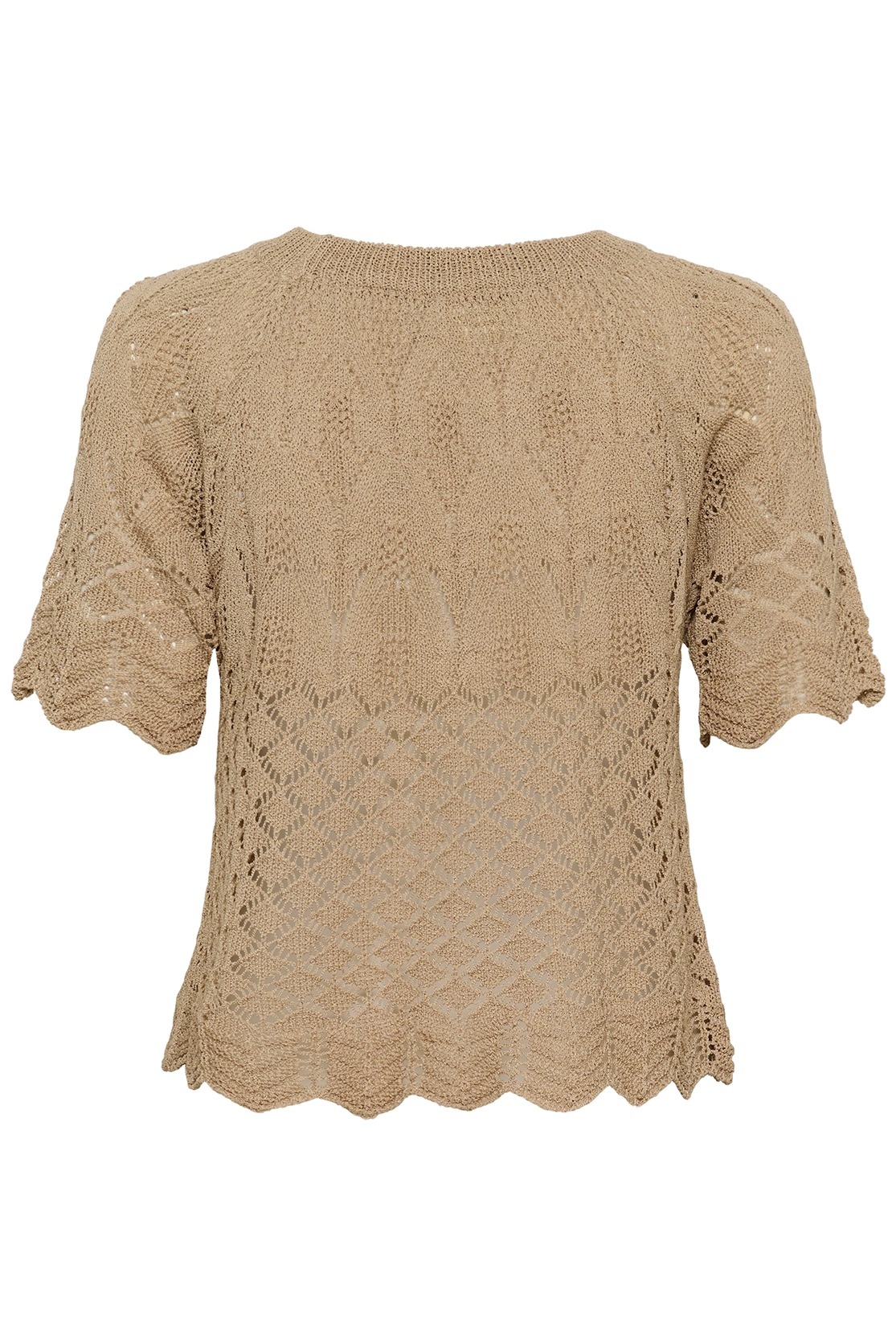 Gebreide trui met een ronde ribgebreide hals, halflange mouwen en een opengewerkt patroon.