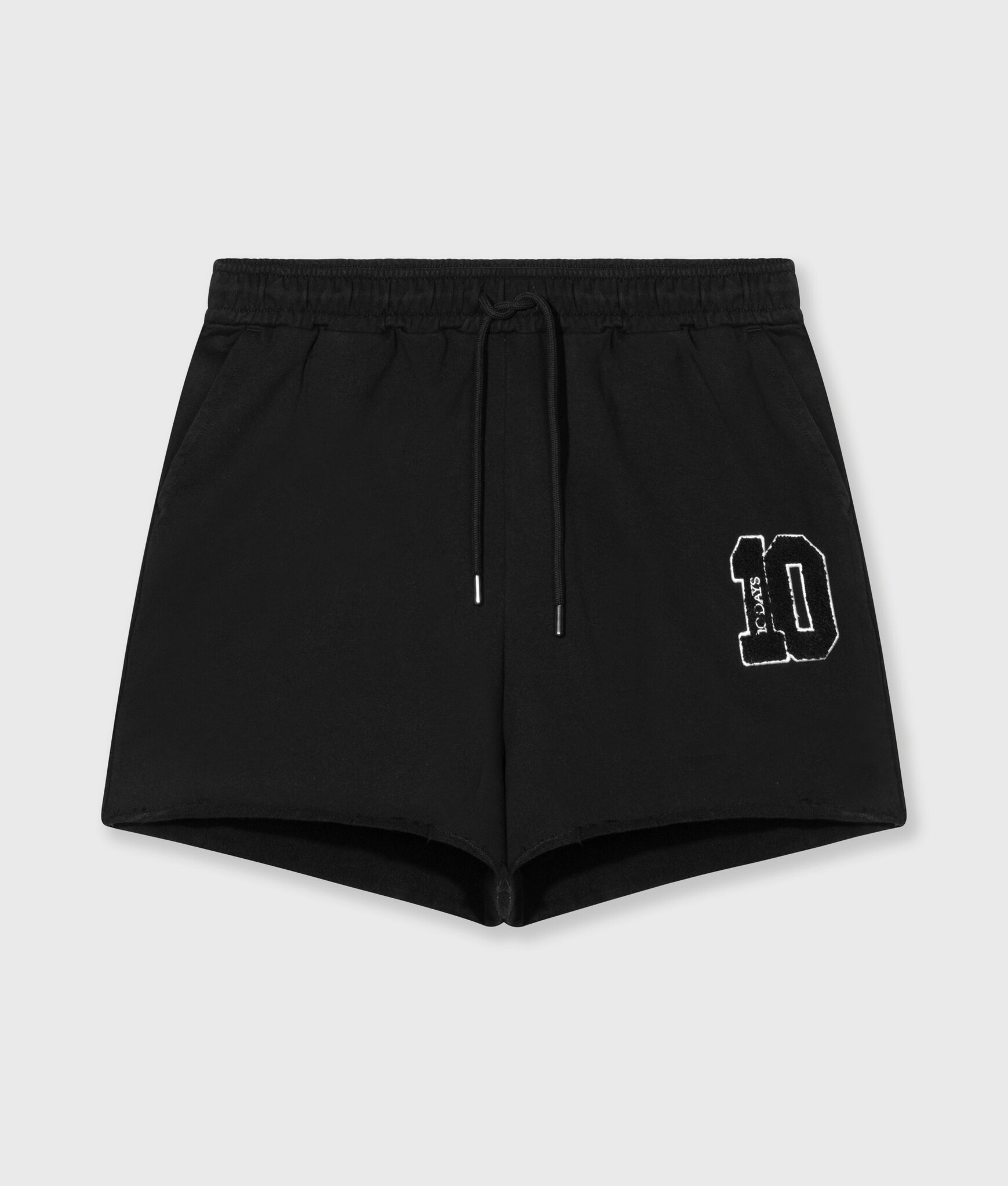 Relaxed fit shorts, gemaakt van zachte katoenen fleece. De broek heeft een elastische tailleband met trekkoord, schuine steekzakken, een fake achterzak, broekspijpen met raw edge randen en een '10' patch op de linker voorkant.