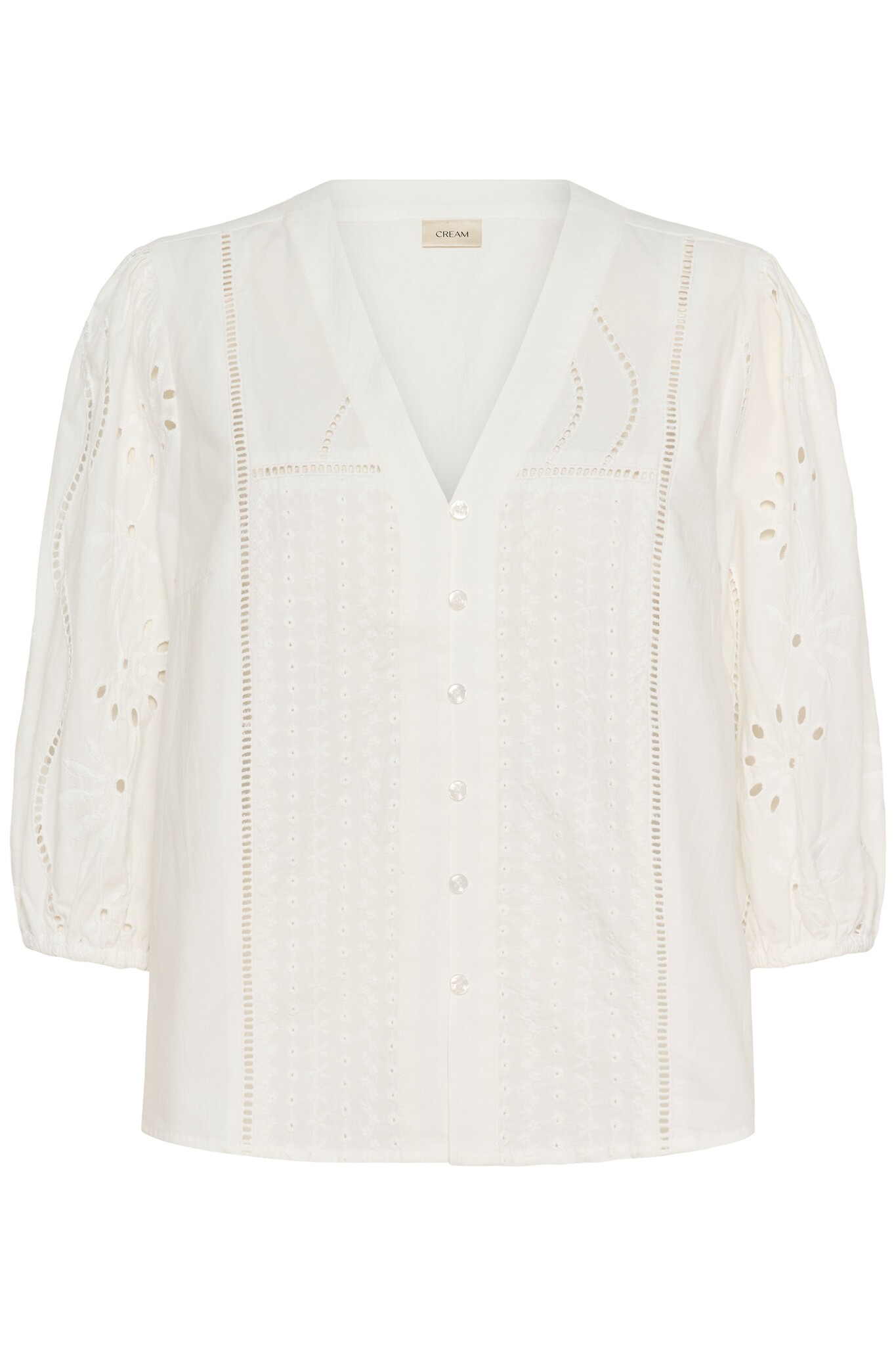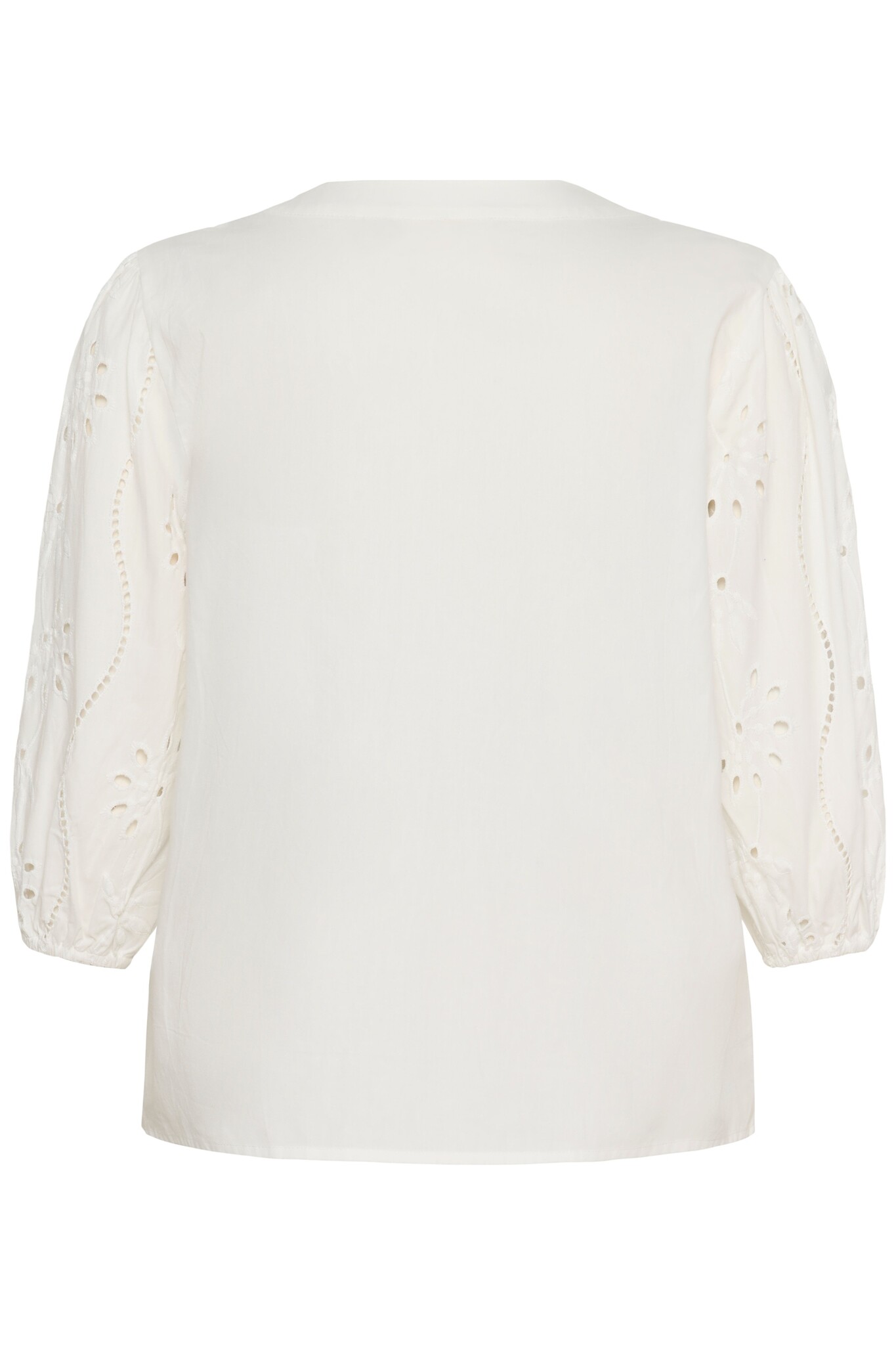 Katoenen blouse met een knoopsluiting en halflange ballonmouwen. De blouse is versierd met borduurwerk en een gaatjespatroon.