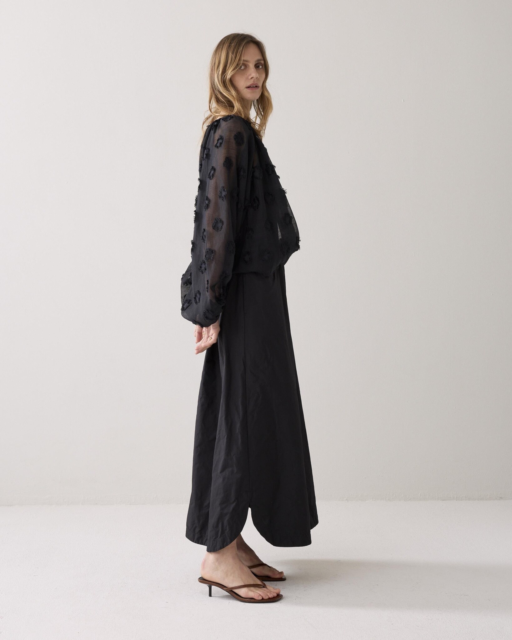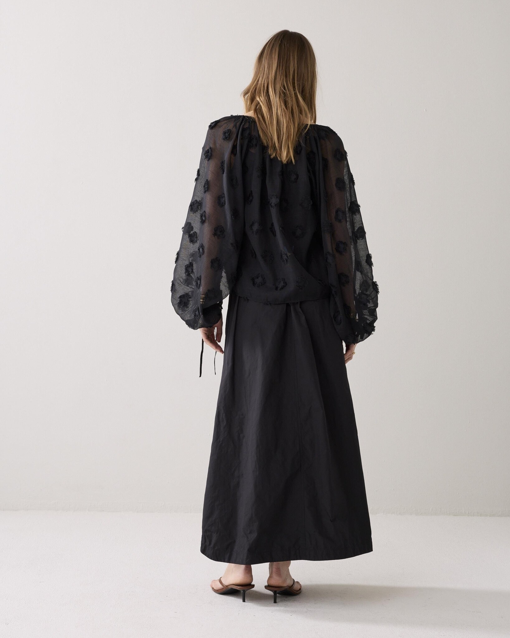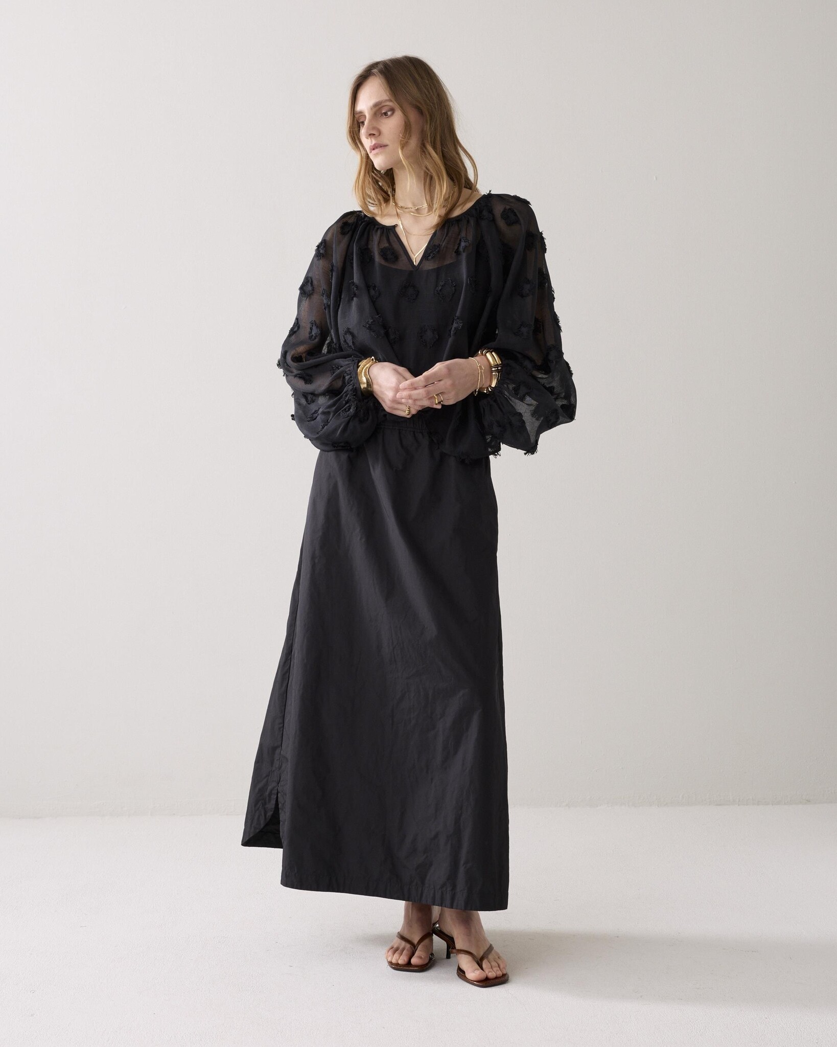 Geplooide maxi rok van stevige taft stof. De jurk heeft een elastische tailleband, steekzakken en twee zijsplitten aan de onderkant.