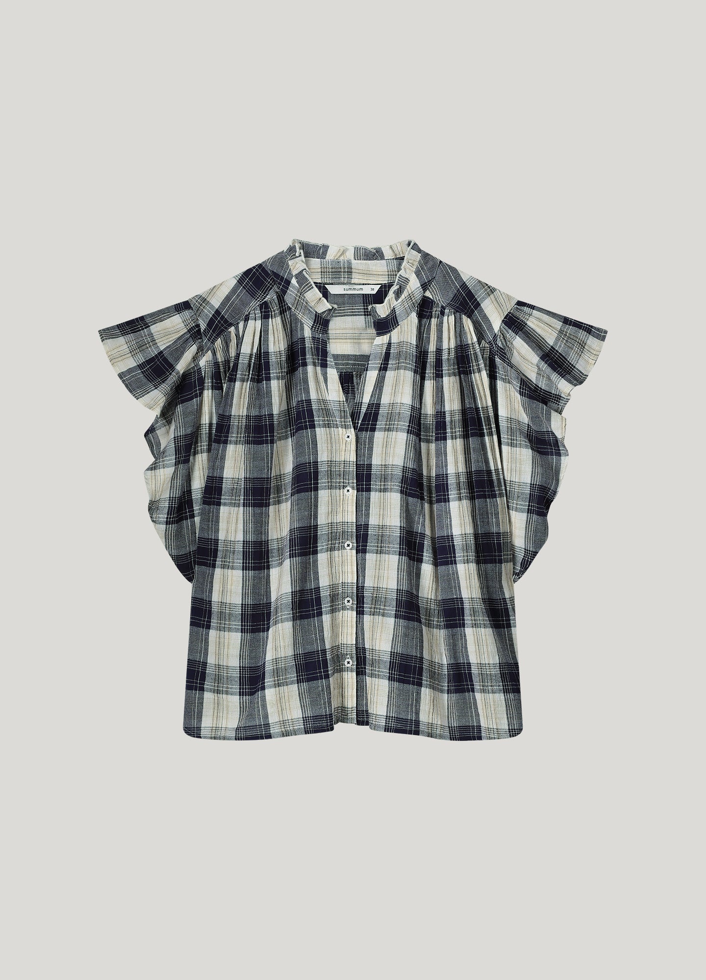 Wijdvallende blouse gemaakt van luchtig katoen in een western ruitjespatroon. De blouse heeft korte volant-mouwen en een V-hals met ruches langs de kraag.