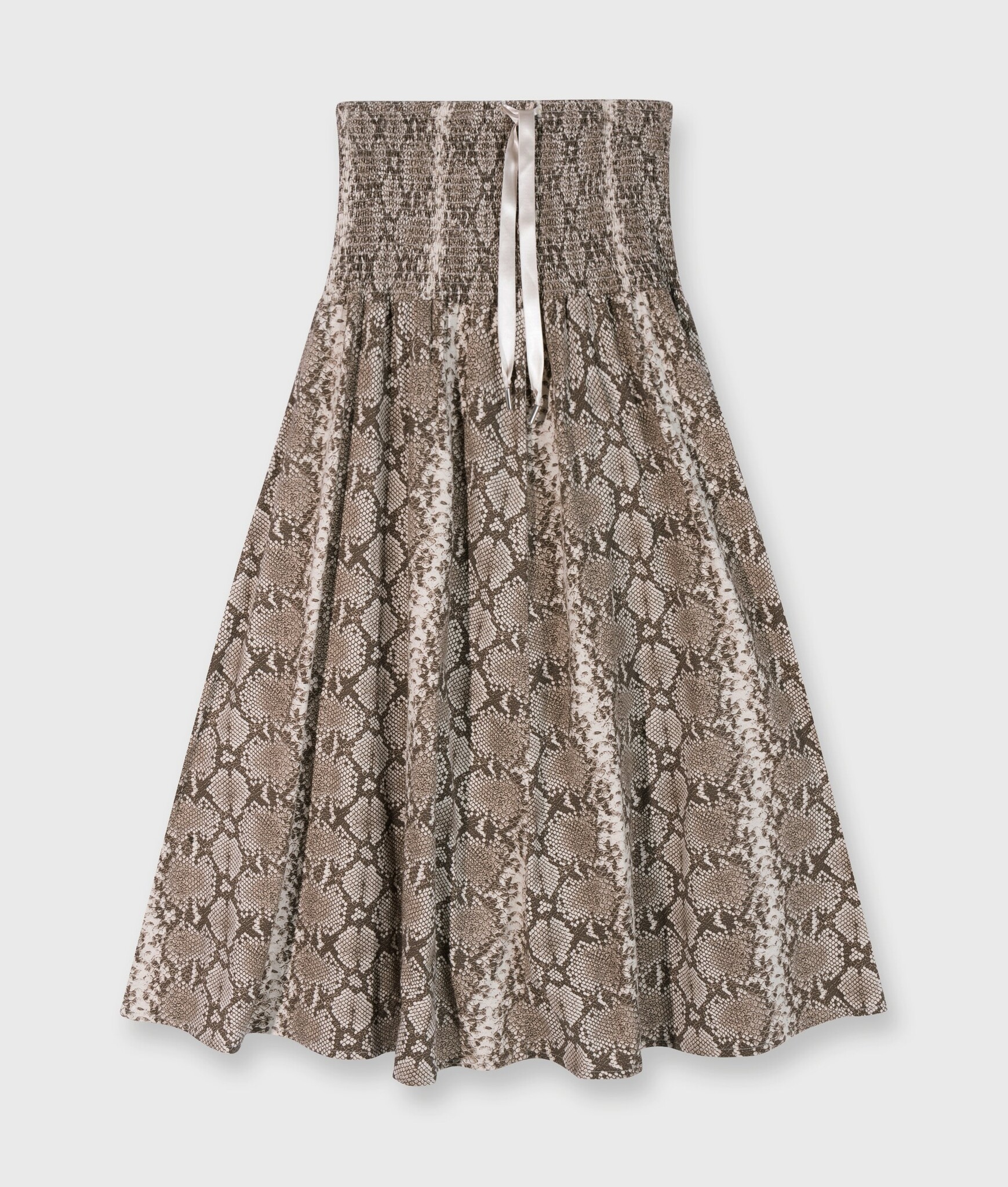 Relaxed fit lange rok gemaakt van zachte biologisch katoenen slub jersey. De rok heeft een smock tailleband met een satijnen trekkoord.