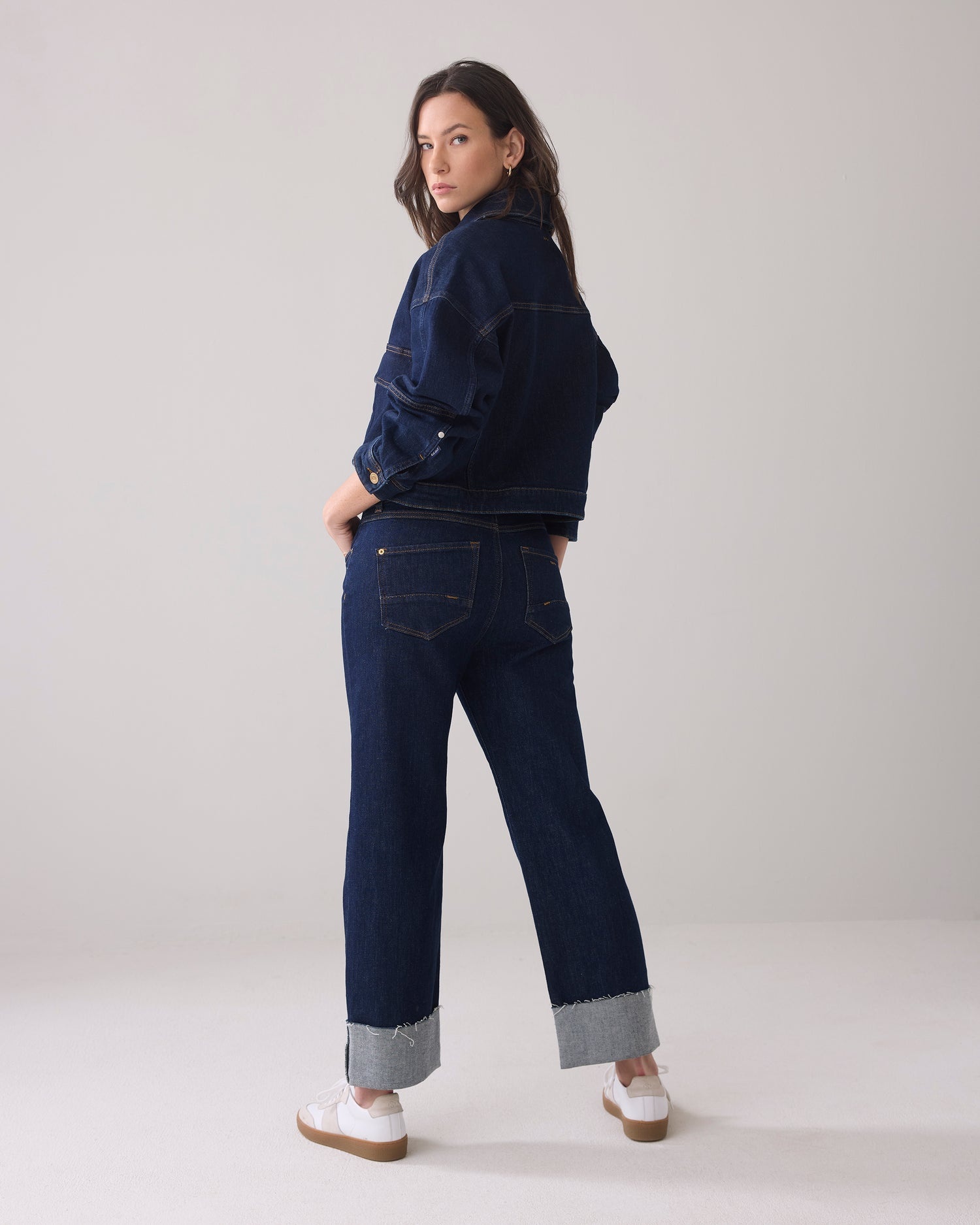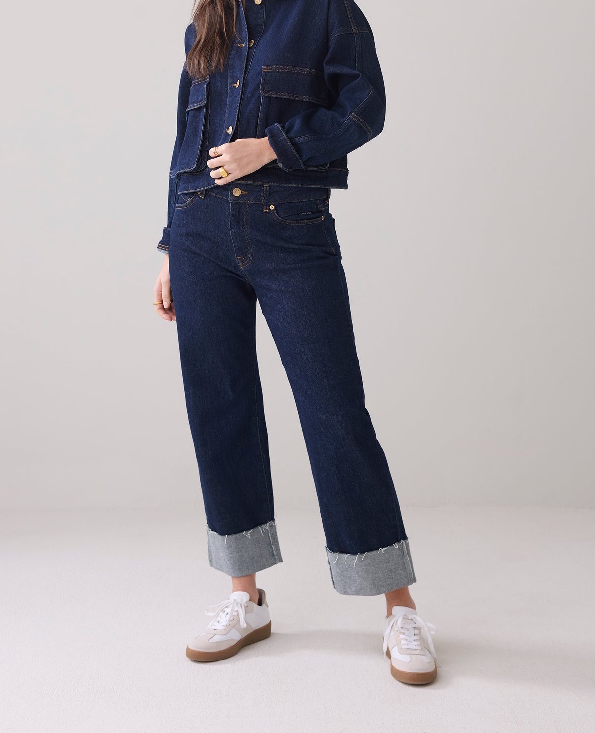 Straight fit jeans gemaakt van een zachte stretch denim. De broek heeft een middelhoge taille en een vaste brede omgeslagen zoom met een raw edge afwerking. Combineer het met het bijpassende jack.