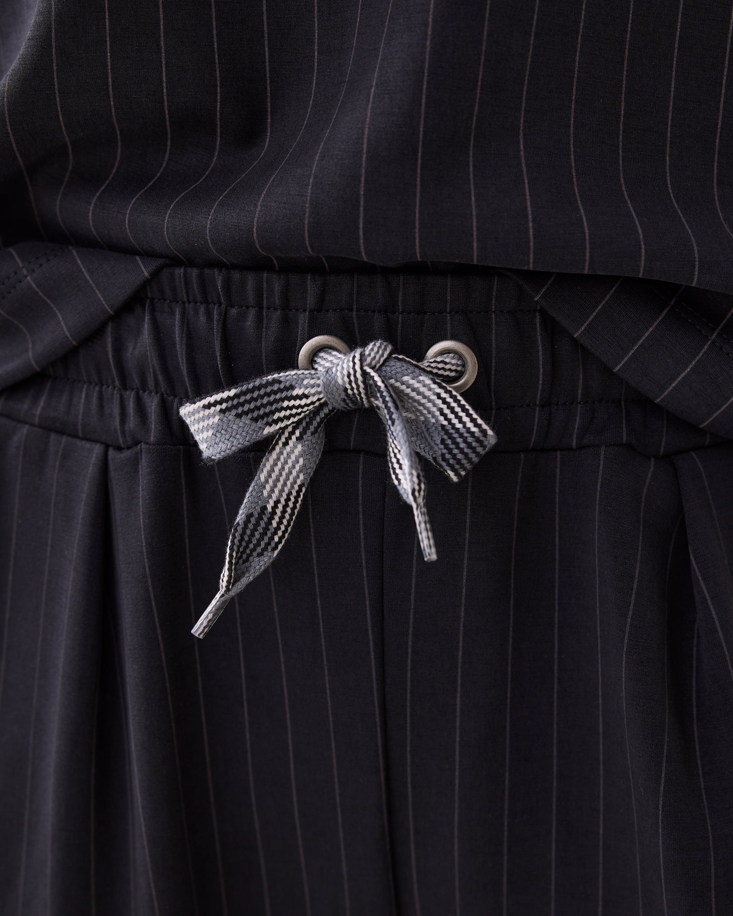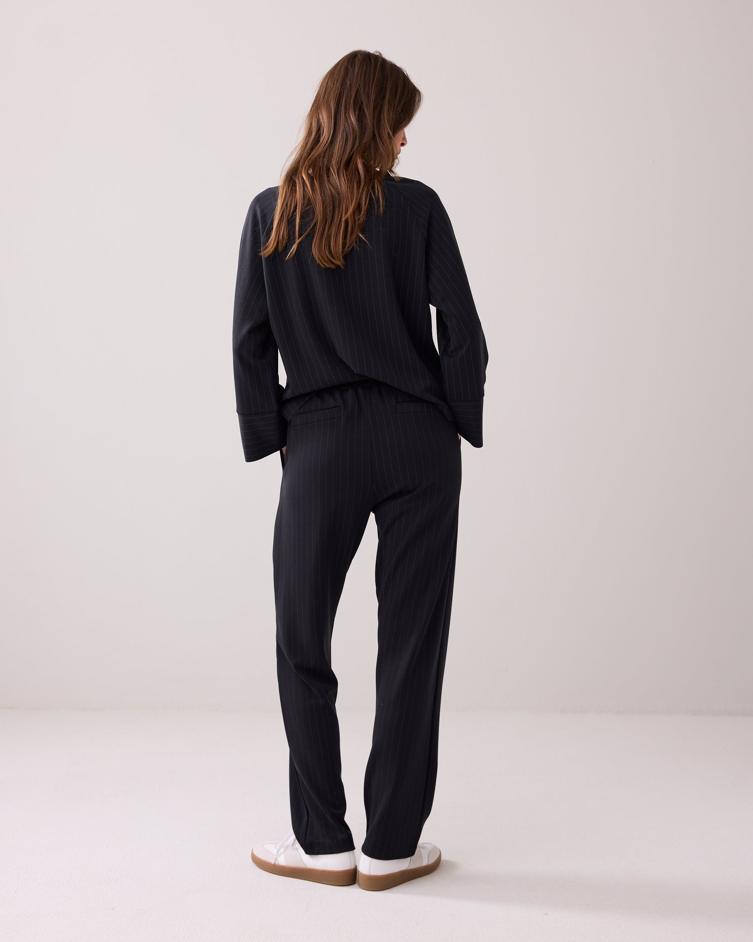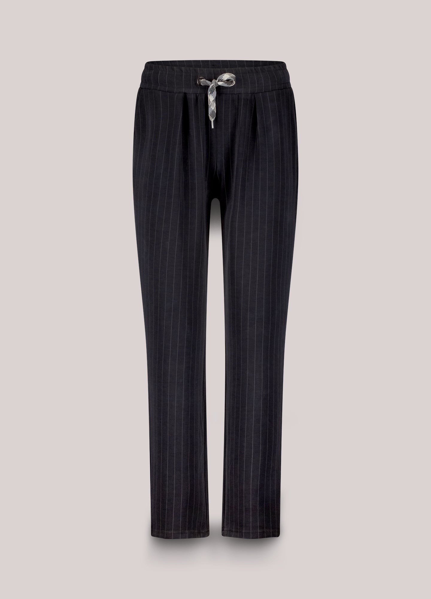 Sportieve relaxed fit broek met een chique krijtstreep. De broek heeft een elastische tailleband met een koord en kleine bandplooien. Combineer het met de bijpassende top.