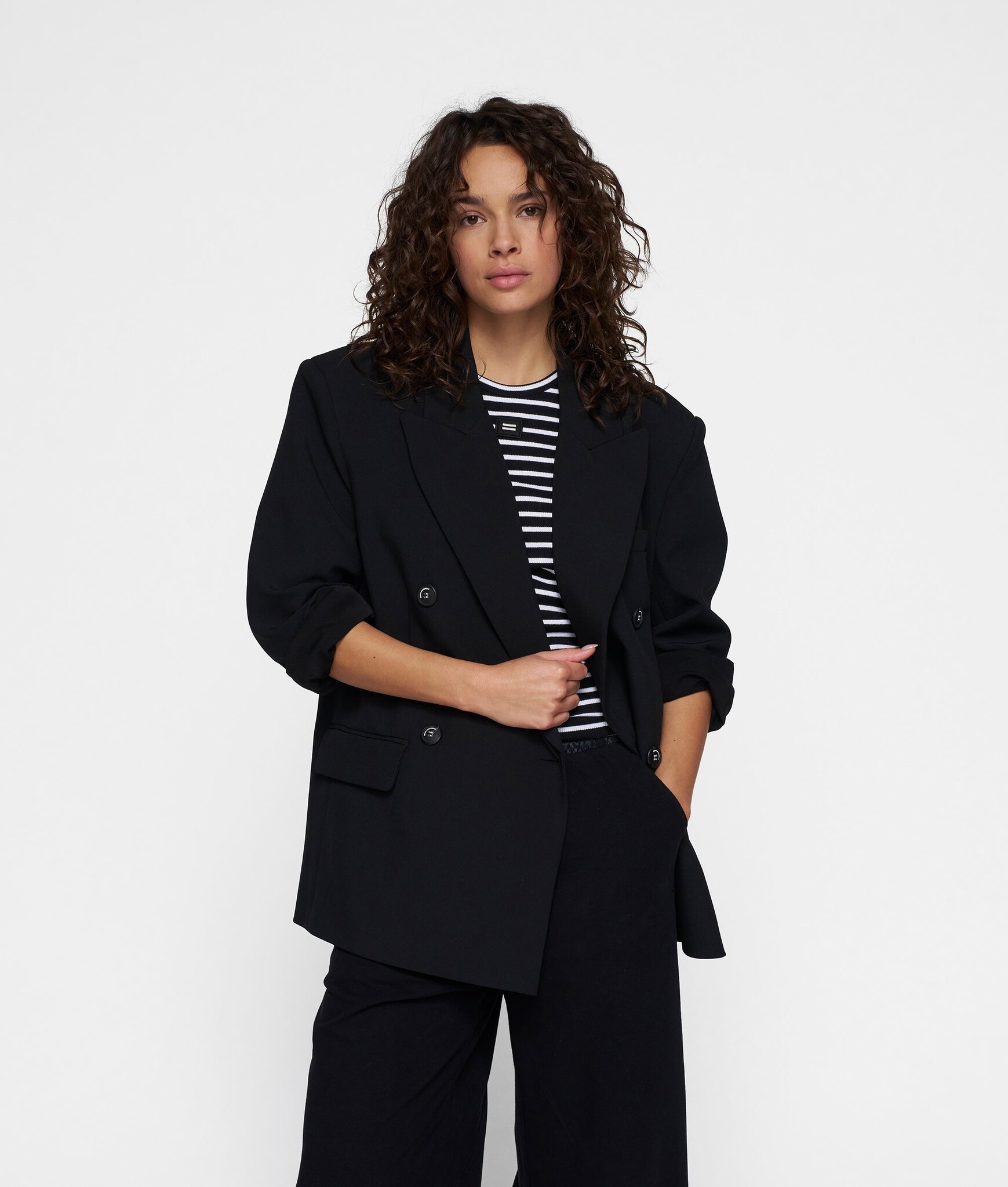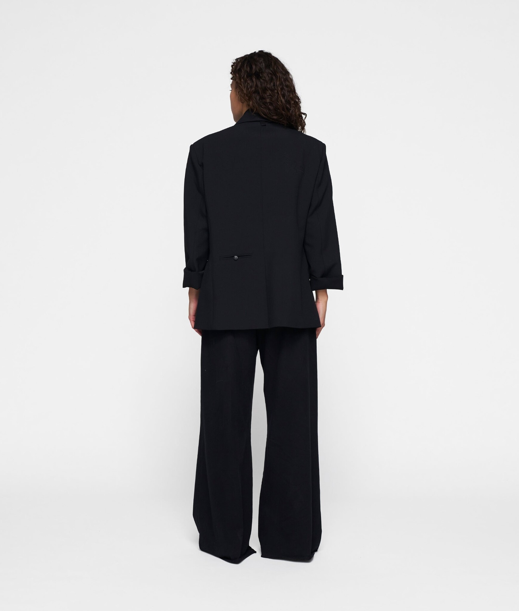 • Oversized blazer met schoudervullingen, gemaakt van een fijne crêpe stof. De blazer heeft een voering van katoen en viscose, een reverskraag met knoopsluiting, klepzakken, een handgeschreven borduring op de rug en een fake paspelzak op de achterkant.