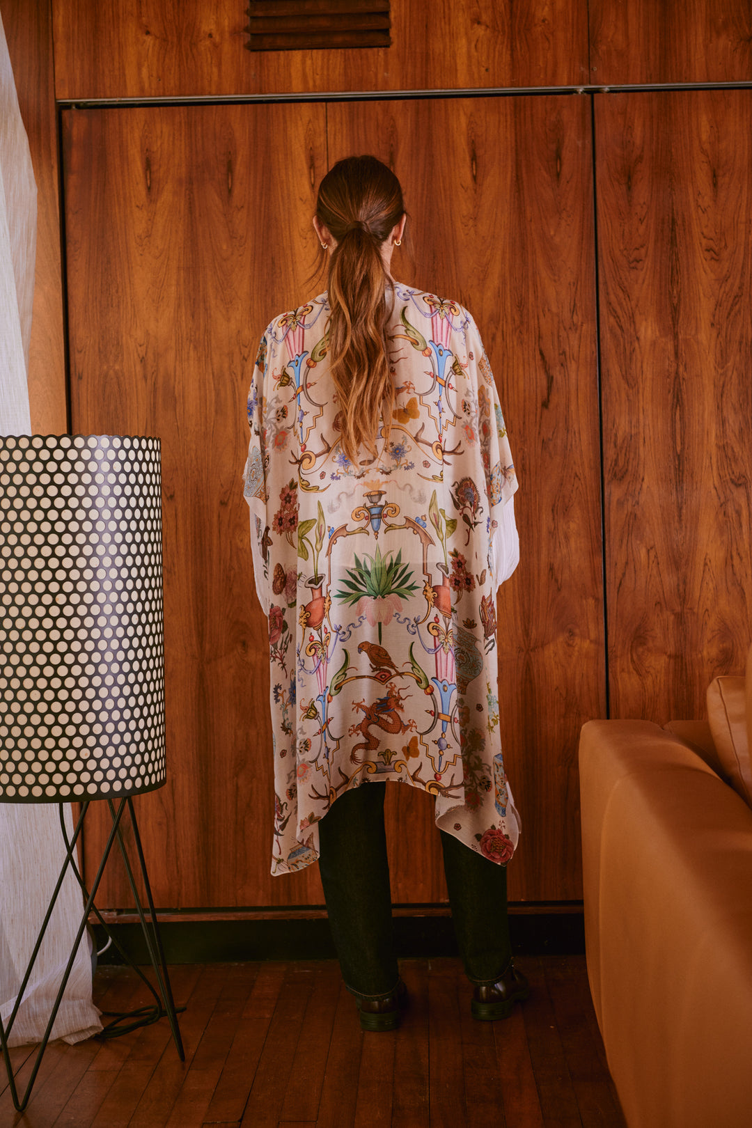 Lichtgewicht overgooier, gemaakt van een heerlijk zacht en duurzaam materiaal wat aanvoelt als zijde. Ze is halflang met een open voorkant en wijde mouwen, perfect in de zomer over een jurk of broek of draag het op het strand over je badpak.