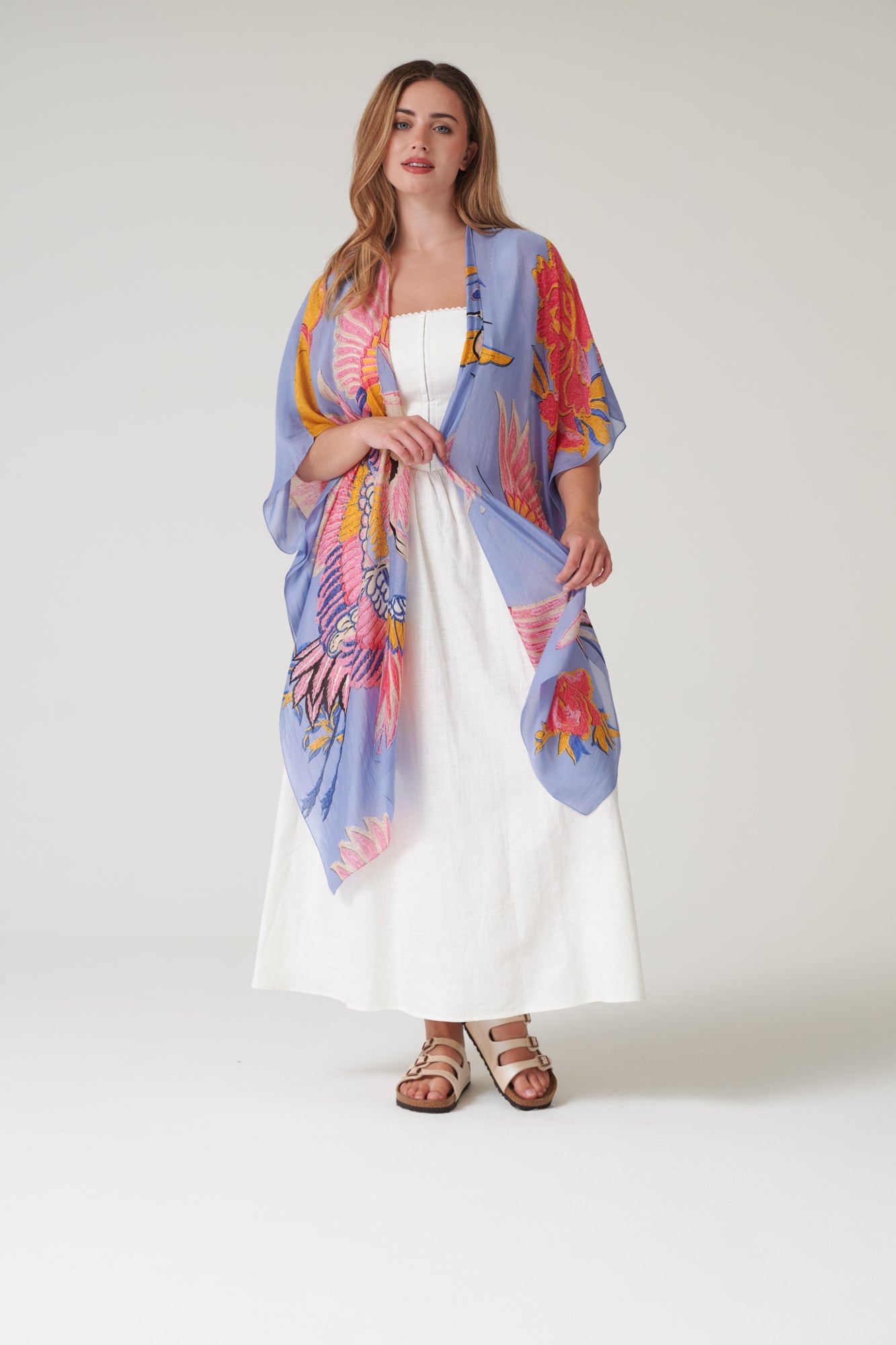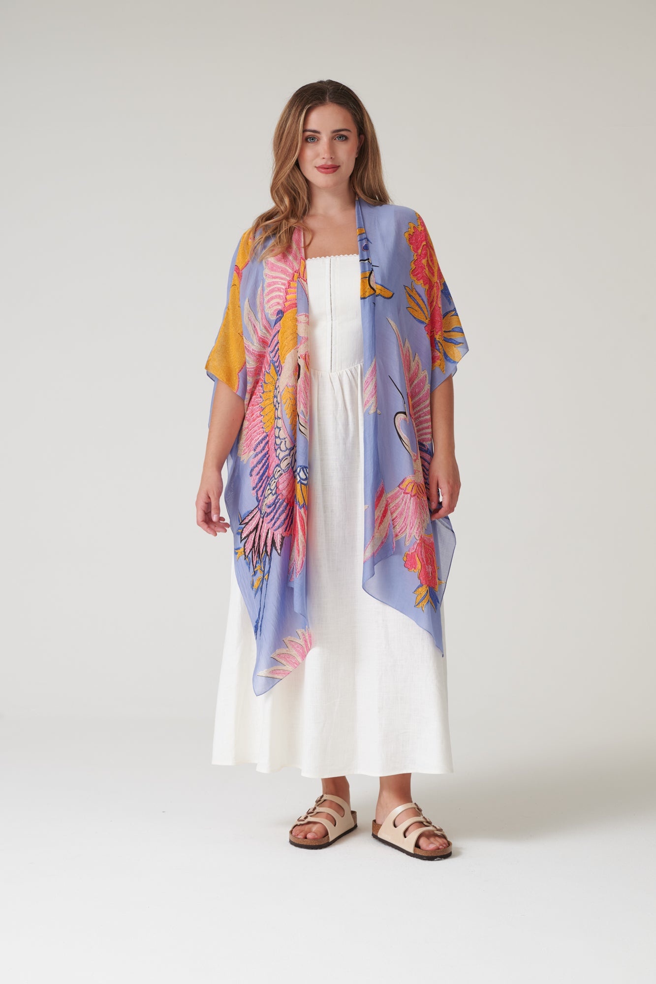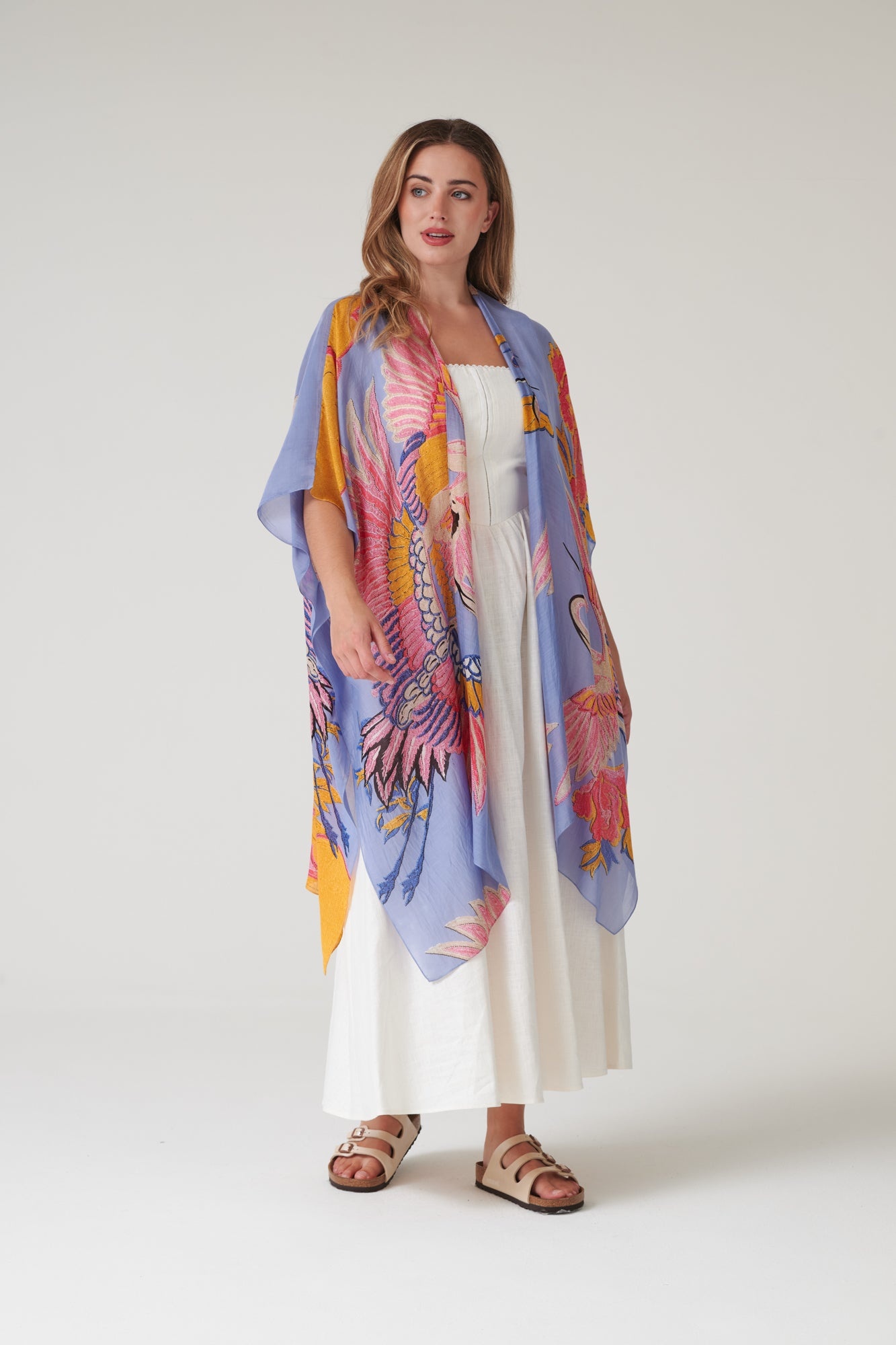 Lichtgewicht overgooier, gemaakt van een heerlijk zacht en duurzaam materiaal wat aanvoelt als zijde. Ze is halflang met een open voorkant en wijde mouwen, perfect in de zomer over een jurk of broek of draag het op het strand over je badpak.