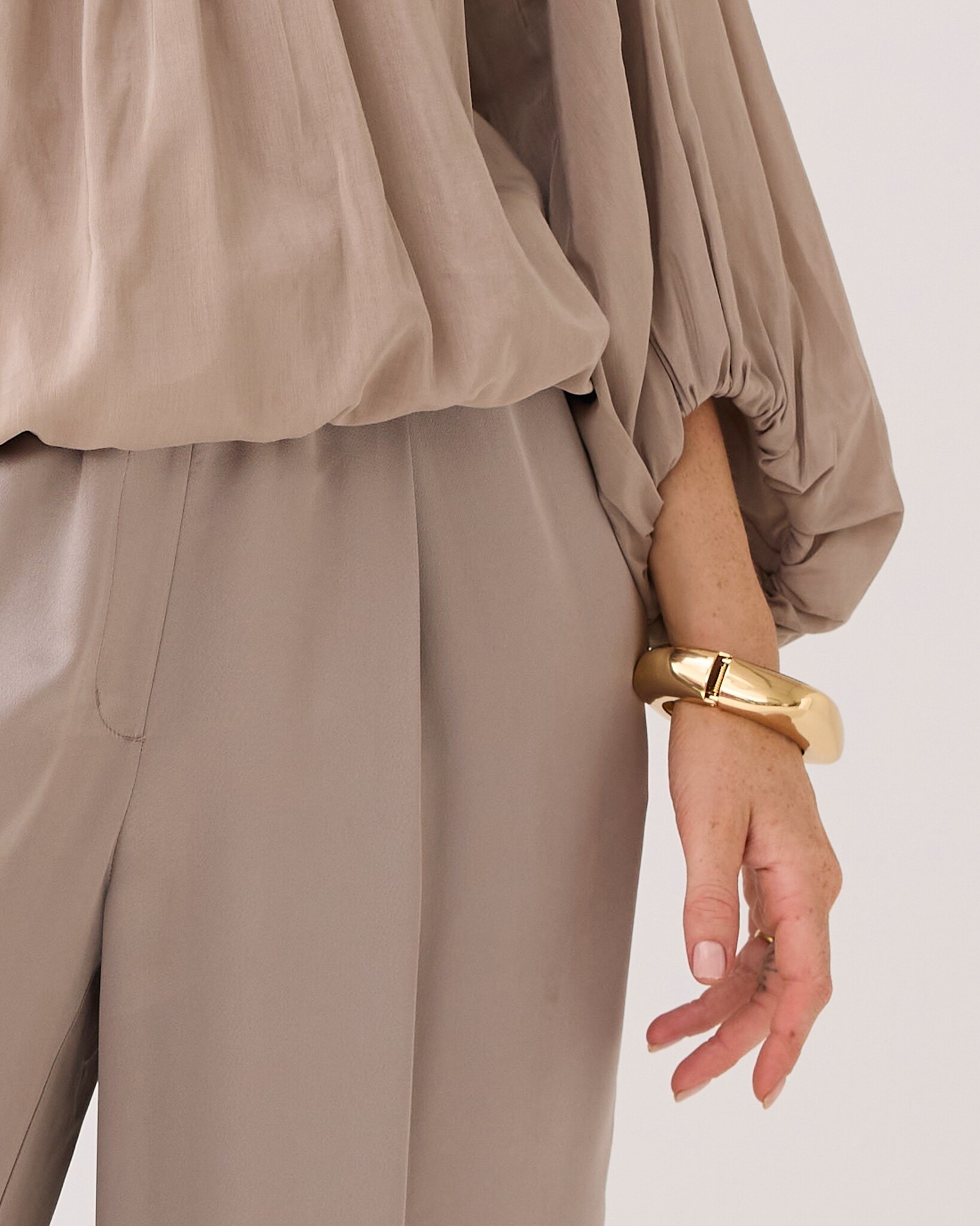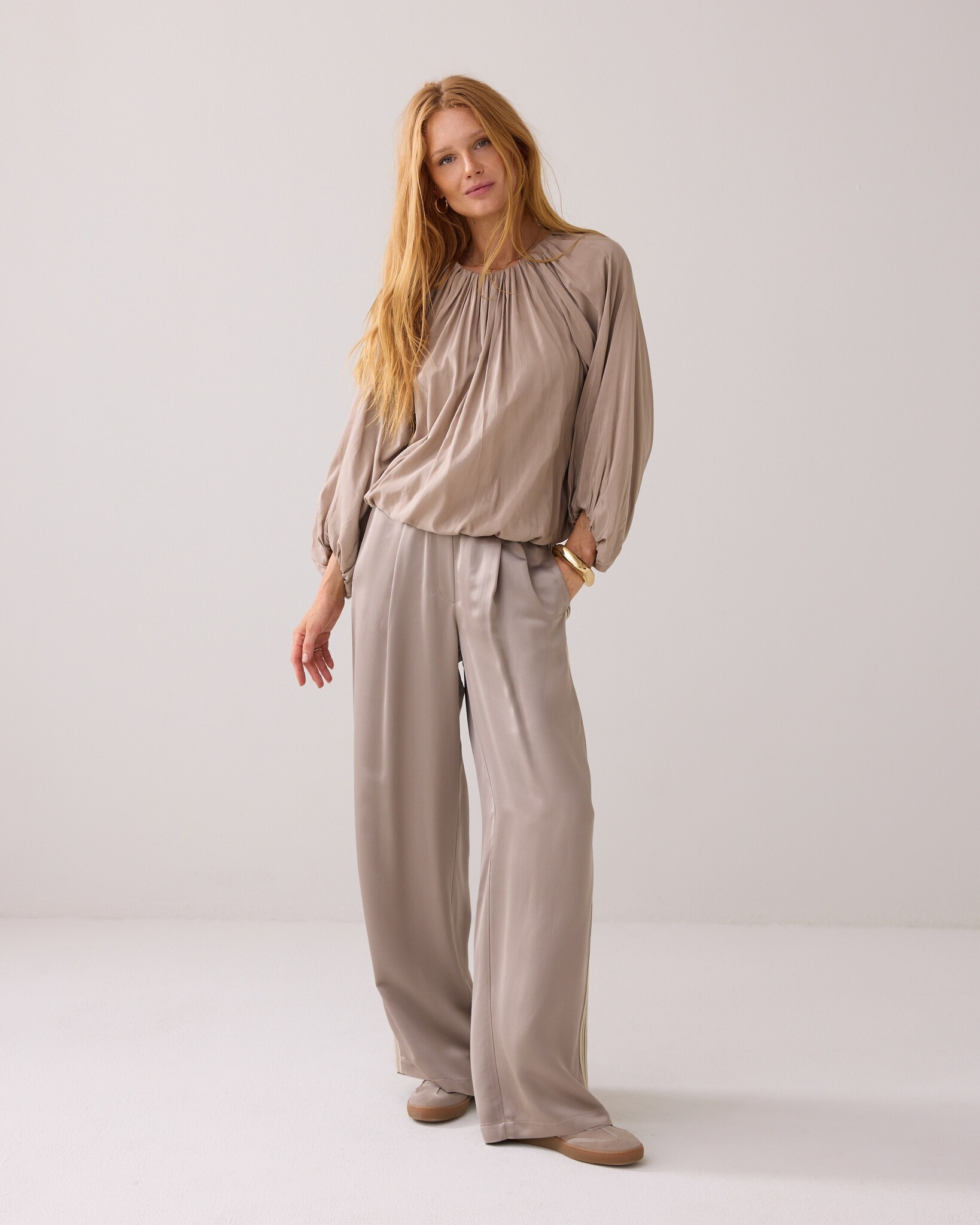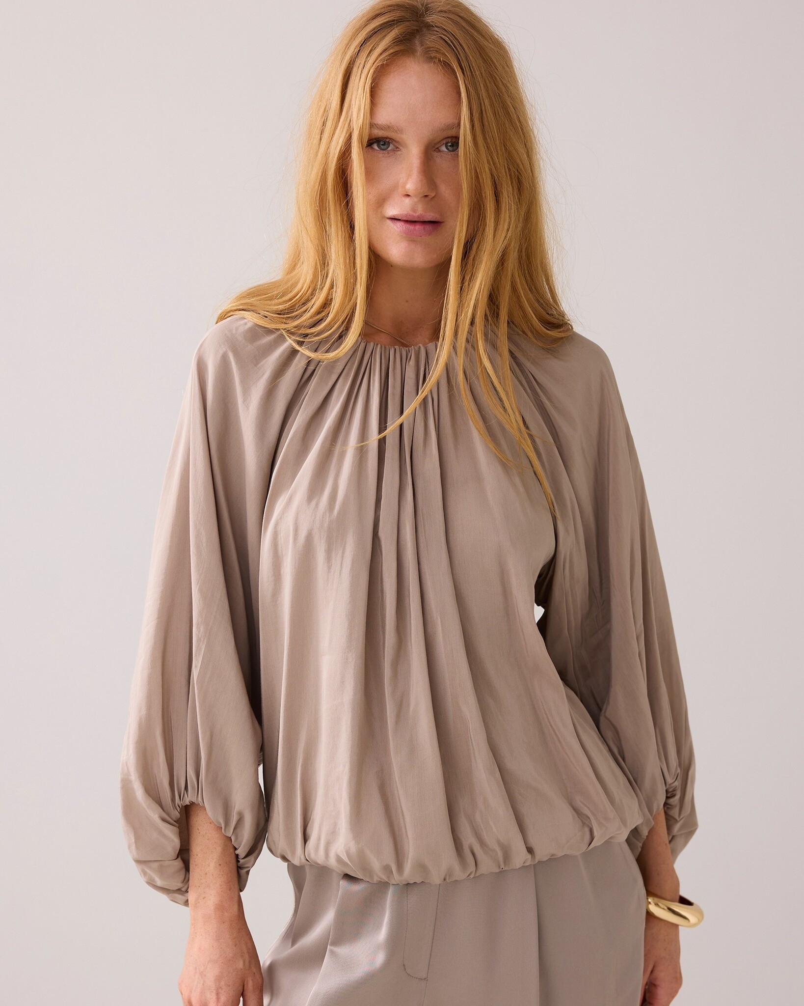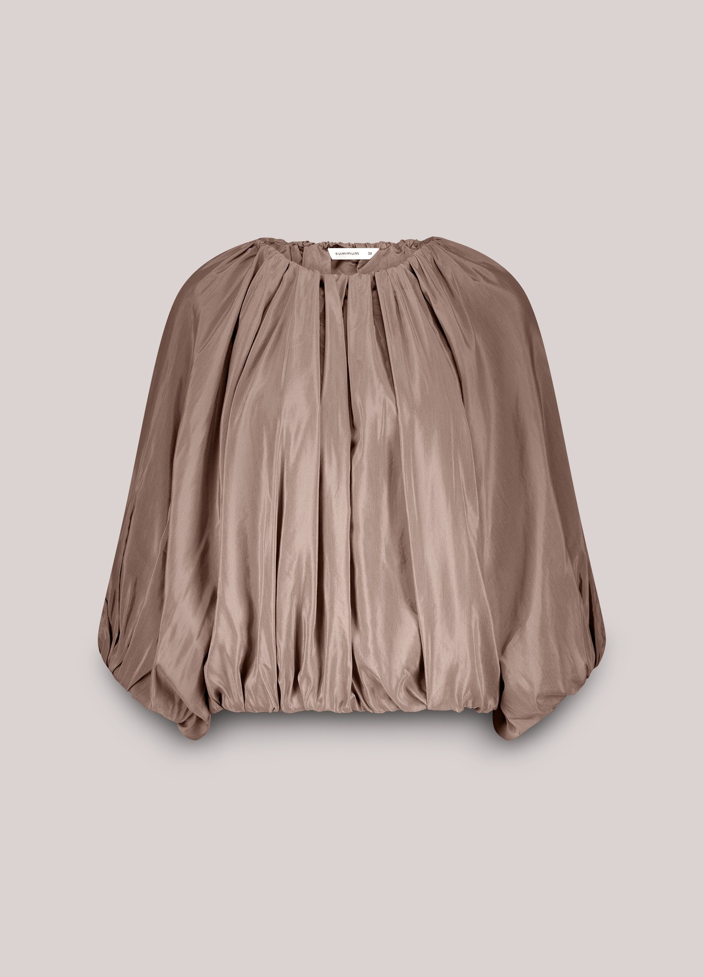 Boxy top gemaakt van een glanzende mix van katoen en viscose. De top is volledig gevoerd en heeft driekwartmouwen met een langere achterkant voor een pofeffect.